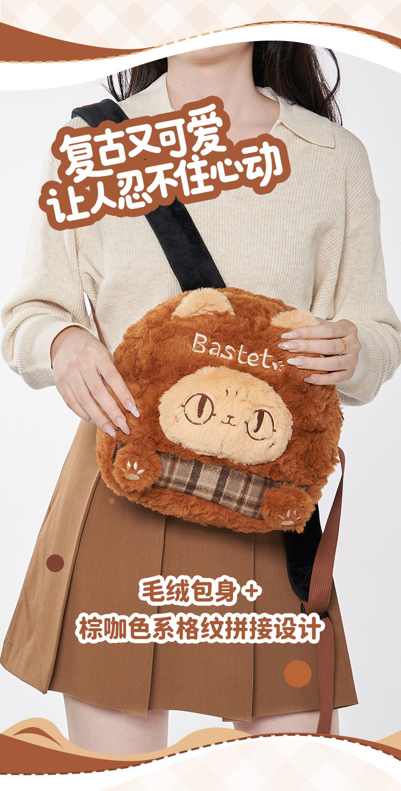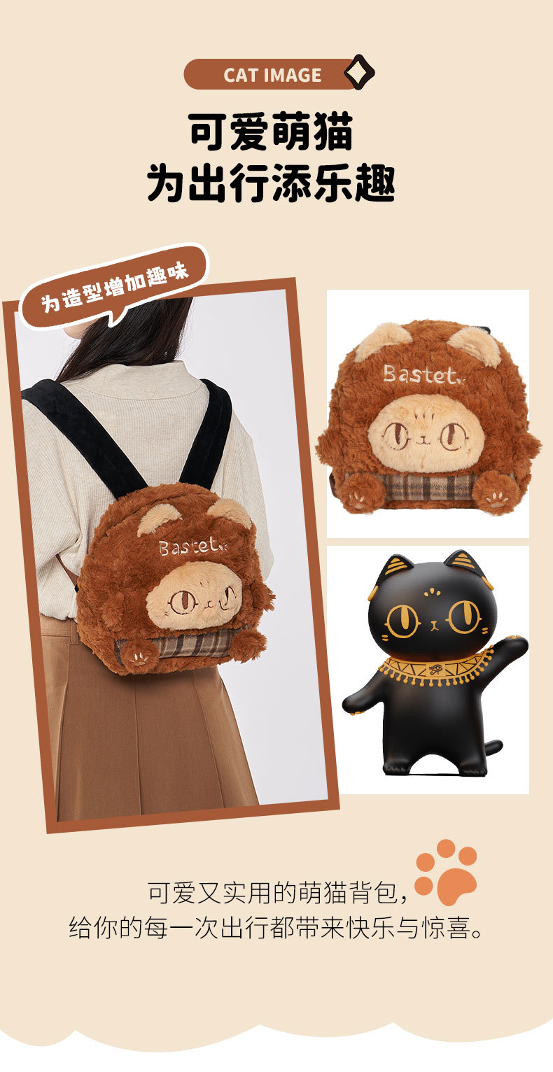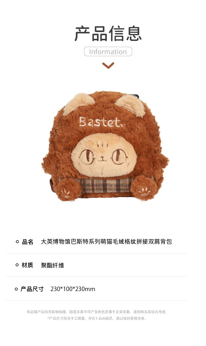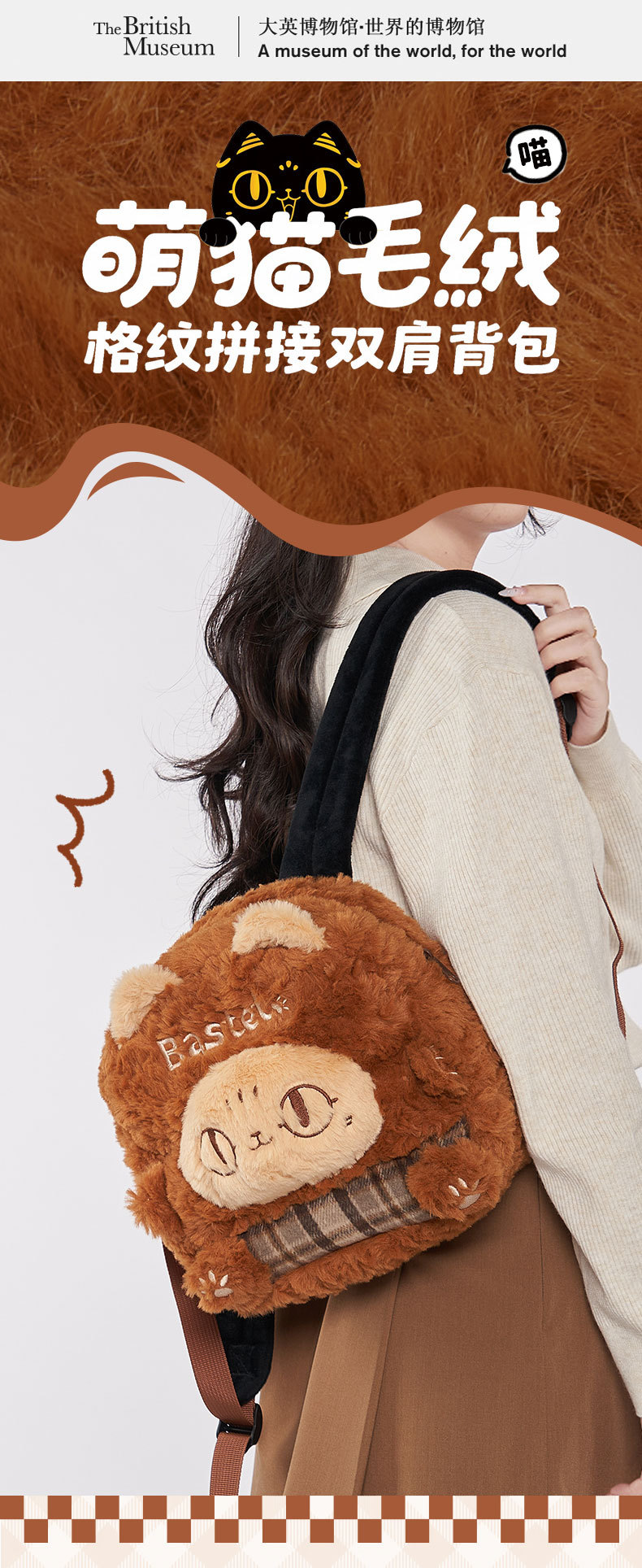 大英博物馆 巴斯特系列 萌猫毛绒 格纹拼接 双肩背包