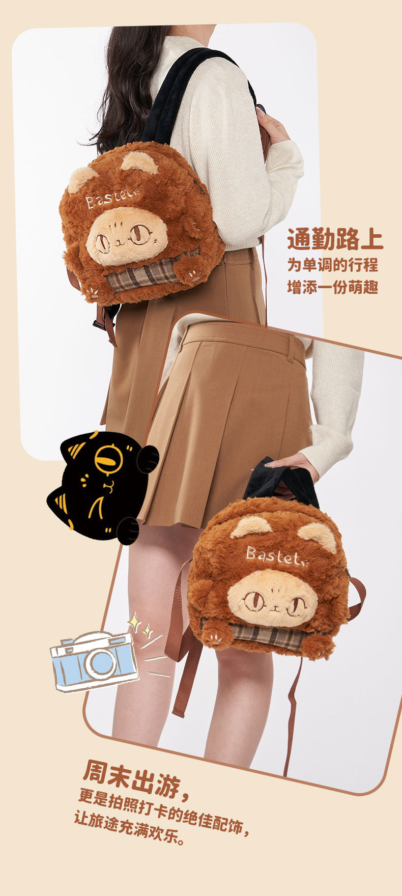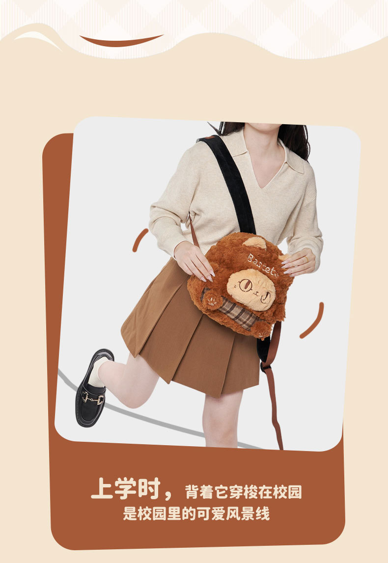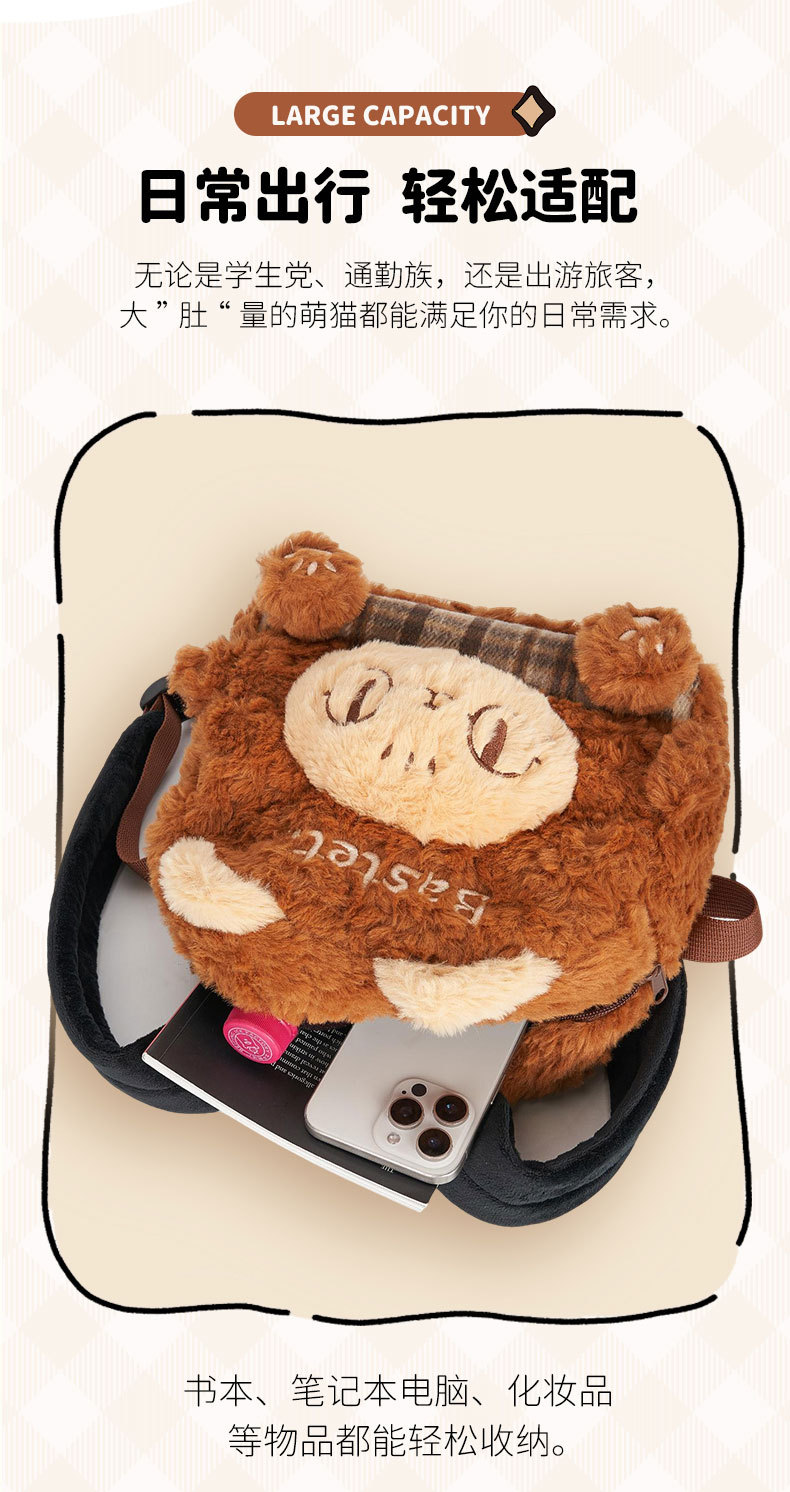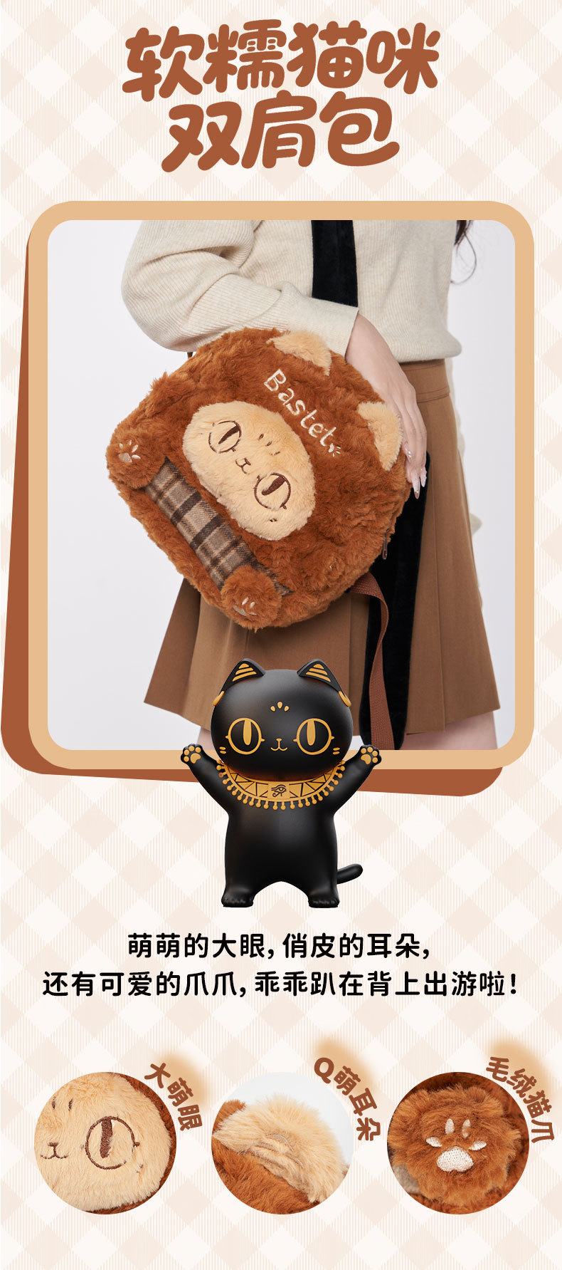大英博物馆 巴斯特系列 萌猫毛绒 格纹拼接 双肩背包