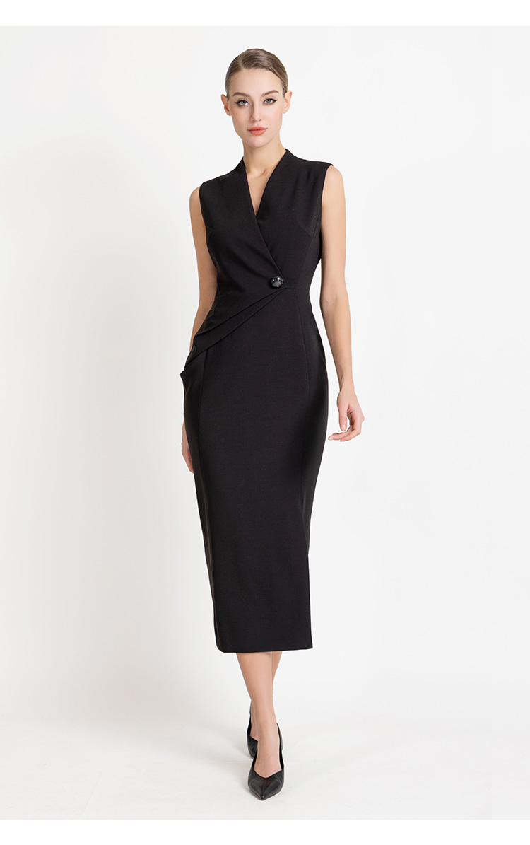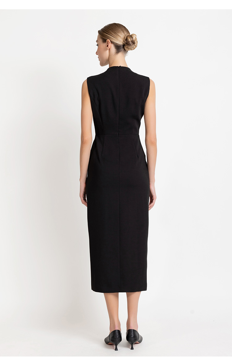 LIZZY早秋优雅气质通勤修身显瘦V领包臀开叉无袖连衣裙8010