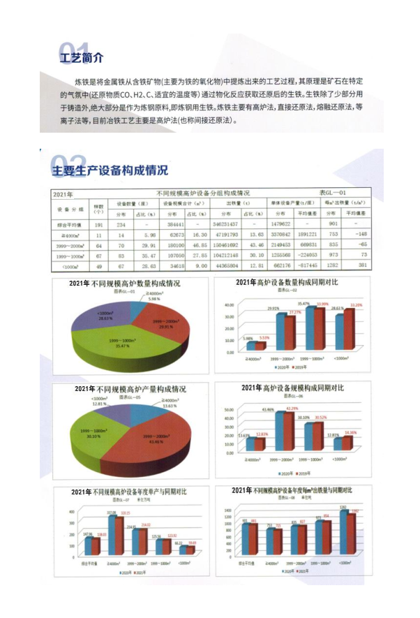 《冶金技术装备指标分析报告》(2022版)是冶金工业信息中心根据国内50余家自愿参与资料交换的钢铁企业的生产技术数据信息基础上,撰写的分析报告。本报告包括参与资料交换的钢铁企业2021年度的铁前、炼钢、轧钢等工艺主要生产技术经济指标的数据信息分析,分析内容涵盖钢铁企业主要的产品生产能力和生产质量指标情况,生产过程的原燃料构成和消耗指标、各生产工序专业生产设备效用指标、劳动生产率指标、单位工序能耗指标以及其他相关生产技术经济指标等。