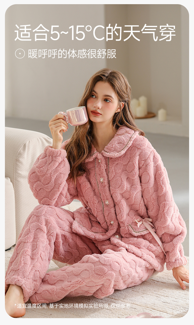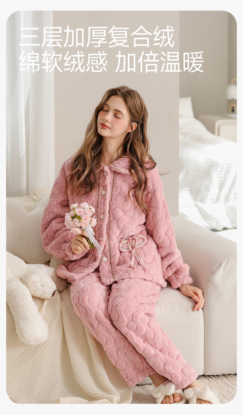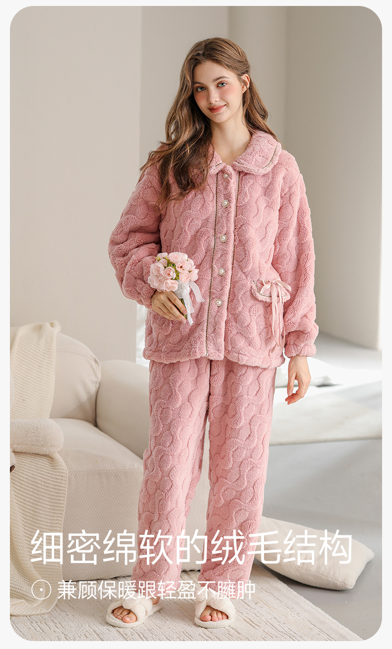 芬腾秋冬季珊瑚绒女士睡衣加绒加厚套装新款宽松大码法兰绒家居服