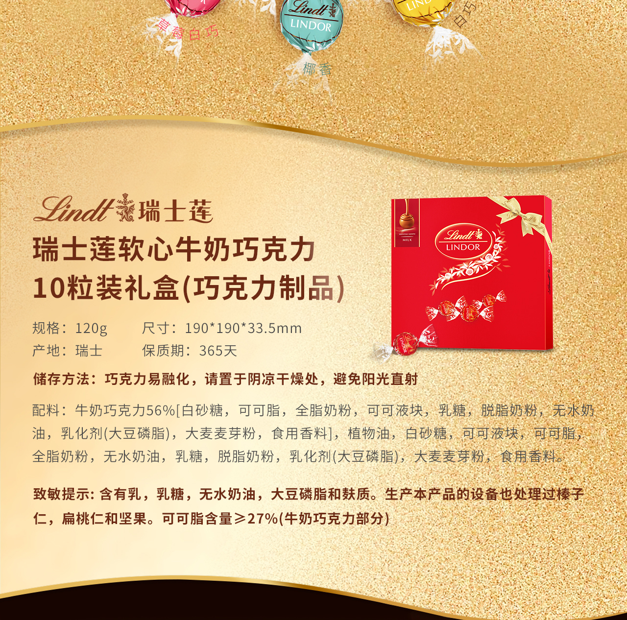 【瑞士莲】软心牛奶巧克力礼盒120g(10粒)