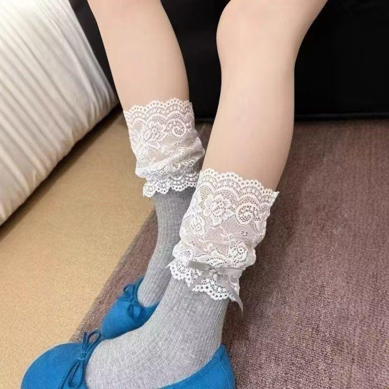 【miu系精梳棉芭蕾风花边袜子】女发热袜秋冬灰色堆堆小腿袜配长筒靴