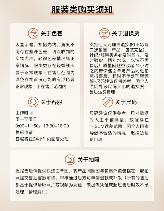 【售后标准】:支持七天无理由(无理由/拦截/拒收/改地址,同时顾客退回时满足包装完好,配件齐全,不影响二次销售,水洗过或其他影响二次销售行为,不予退换)