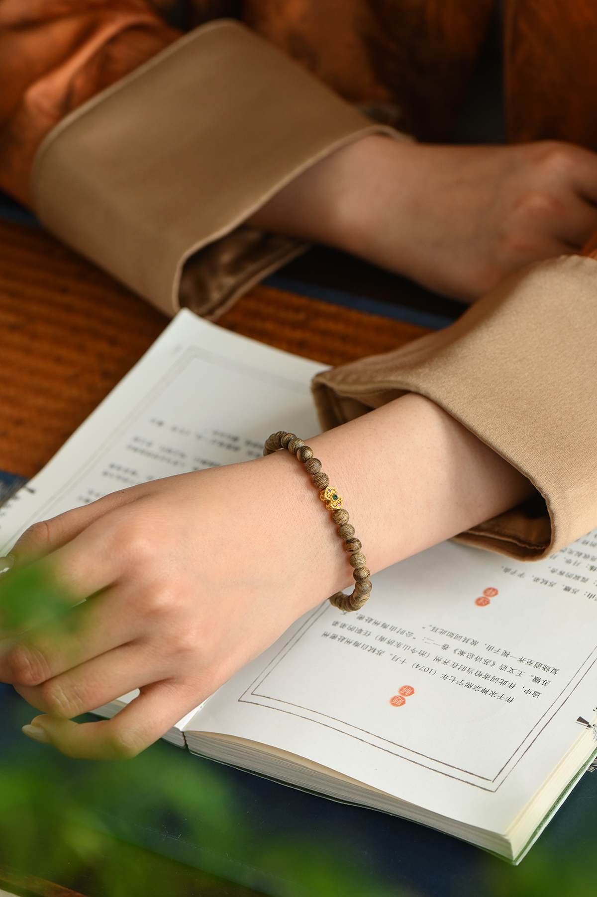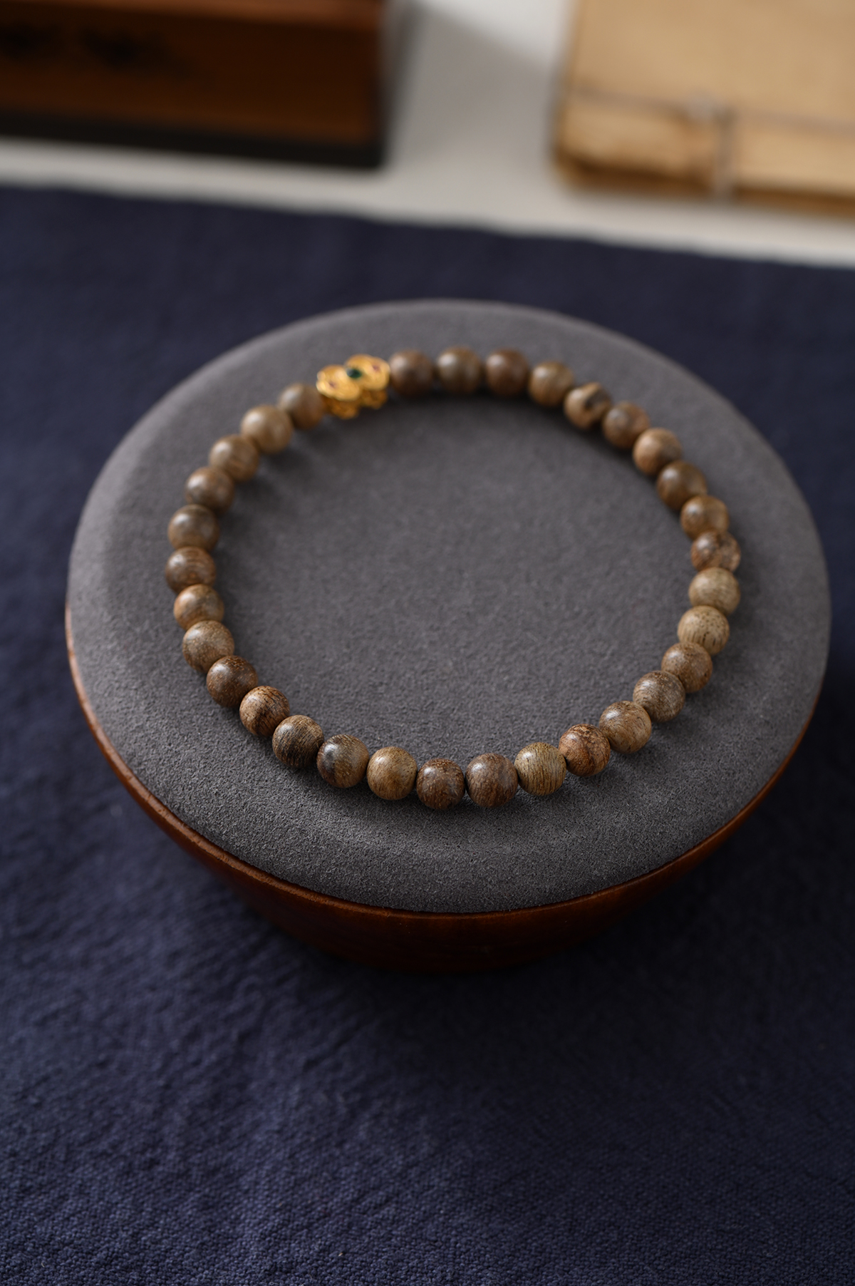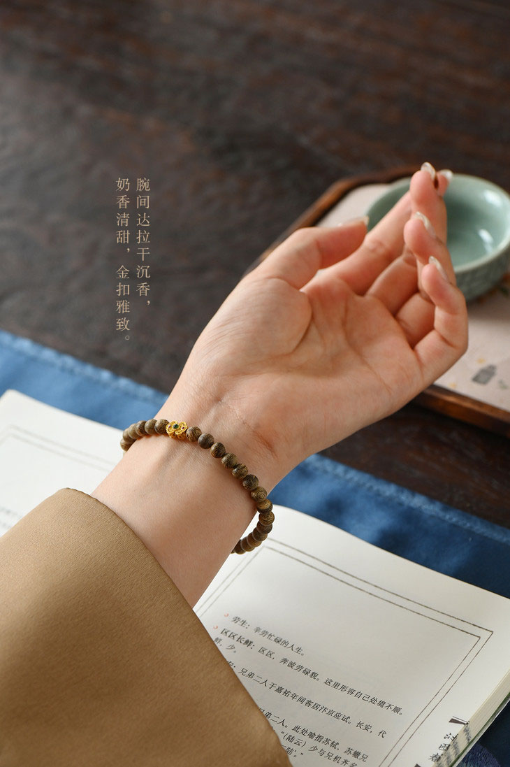 天然达拉干沉香的虎纹油脂线清晰可见,5.6mm*32颗细珠规格,贴合女性手腕,佩戴轻盈不累赘。