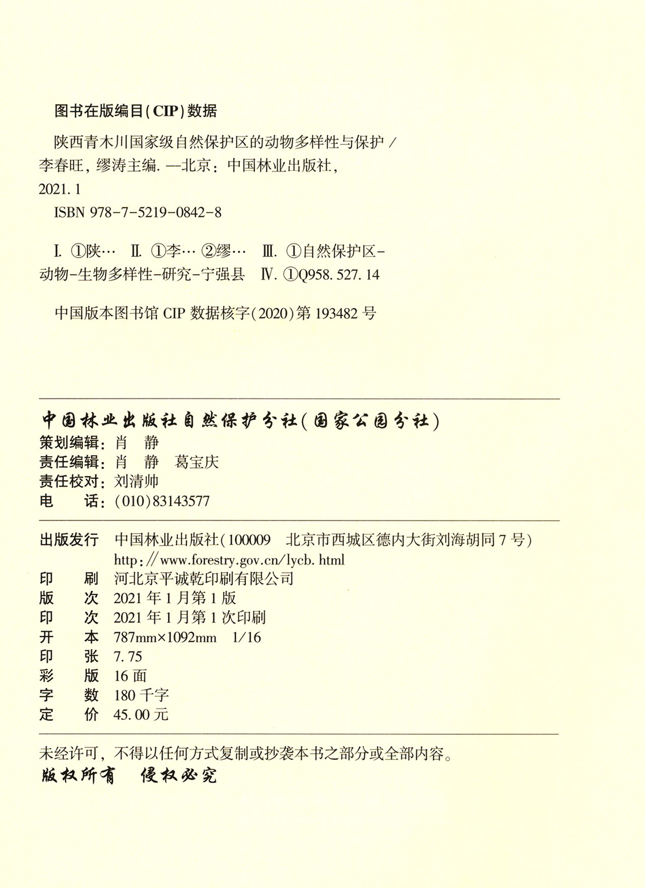 陕西青木川国家级自然保护区的动物多样性与保护 李春旺//缪涛 0842 中国林业出版社