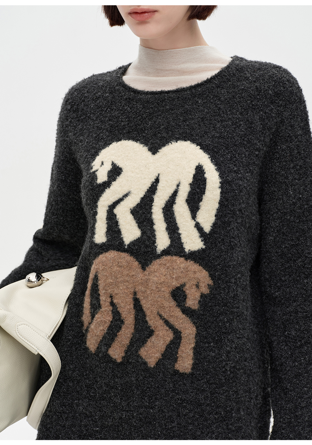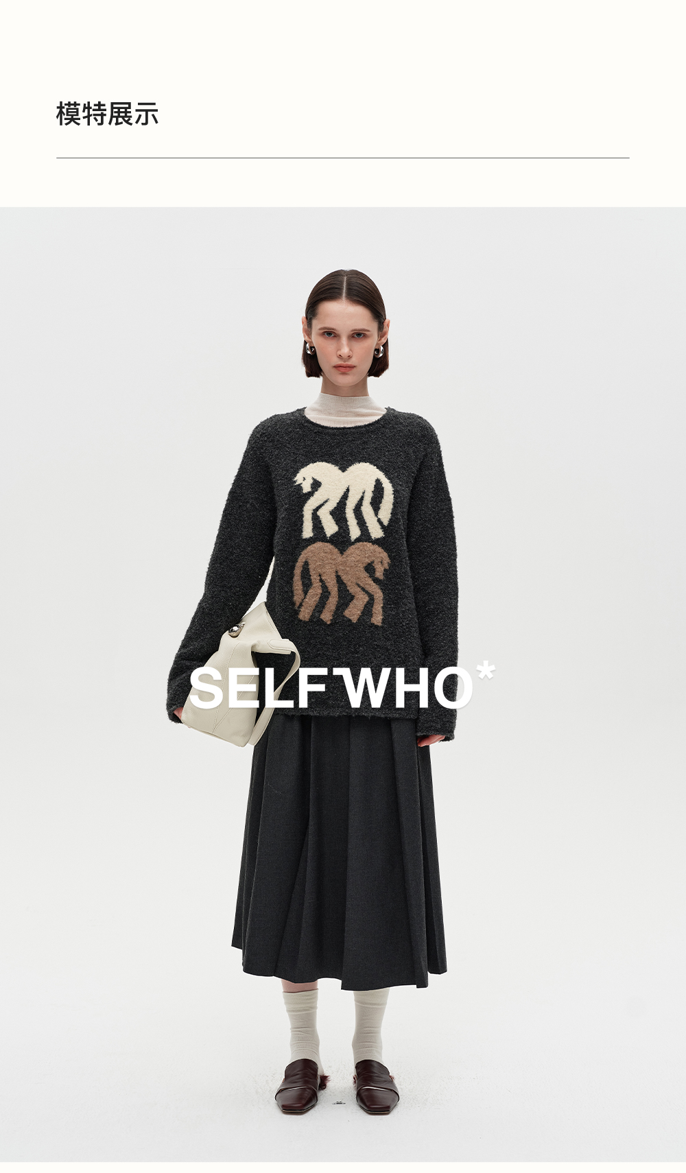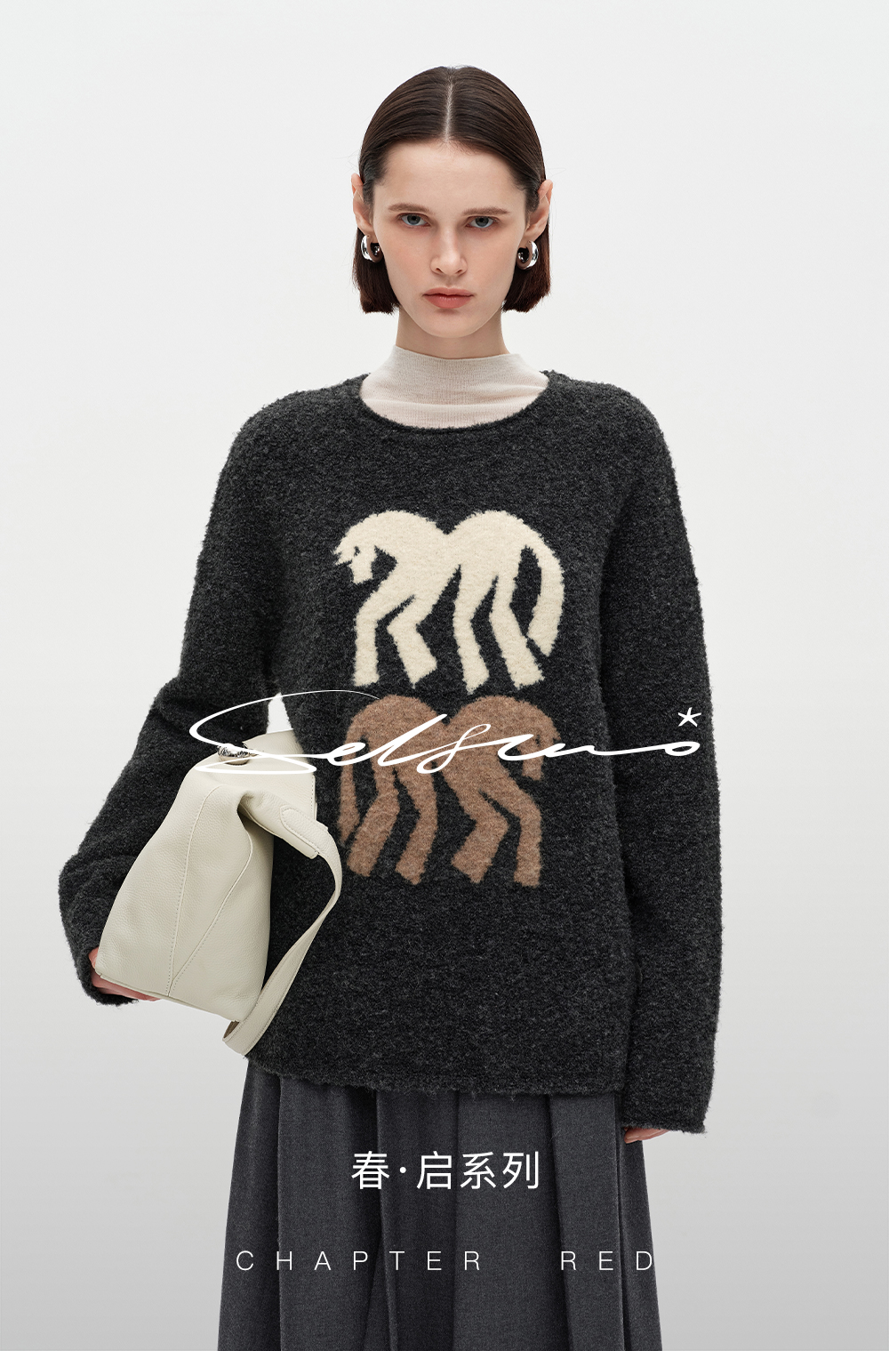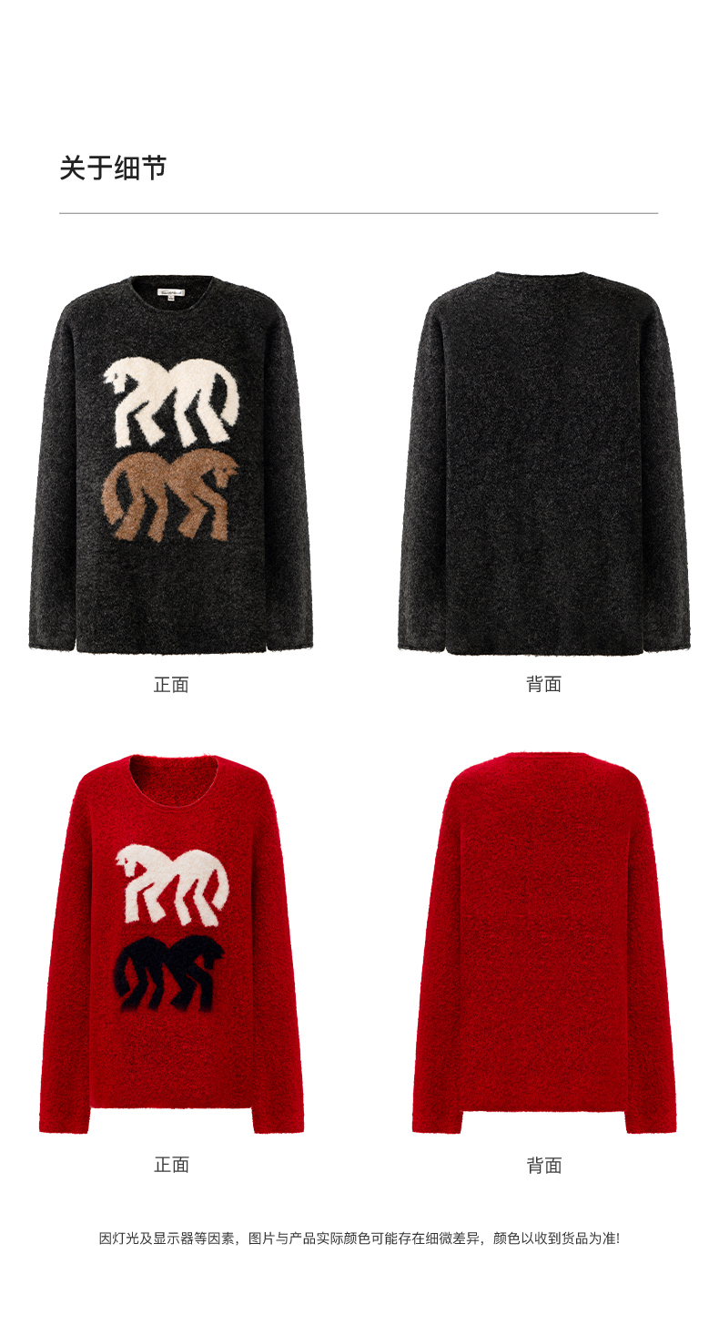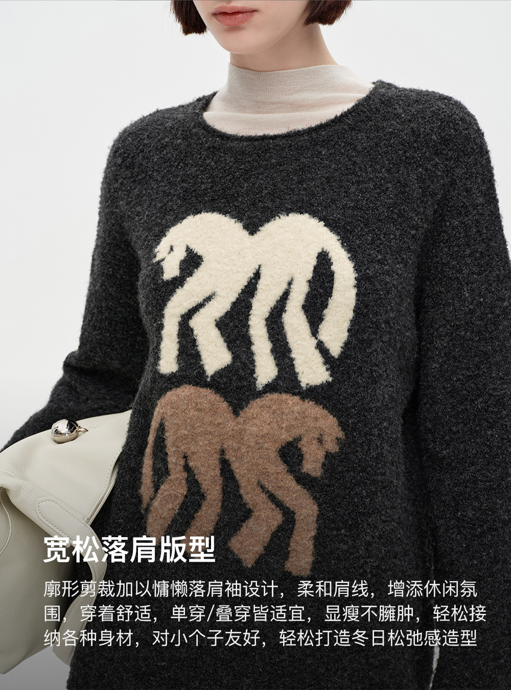 SELFWHO绵羊毛混纺灰色圆领毛衣女2025冬新款小马图案落肩针织衫