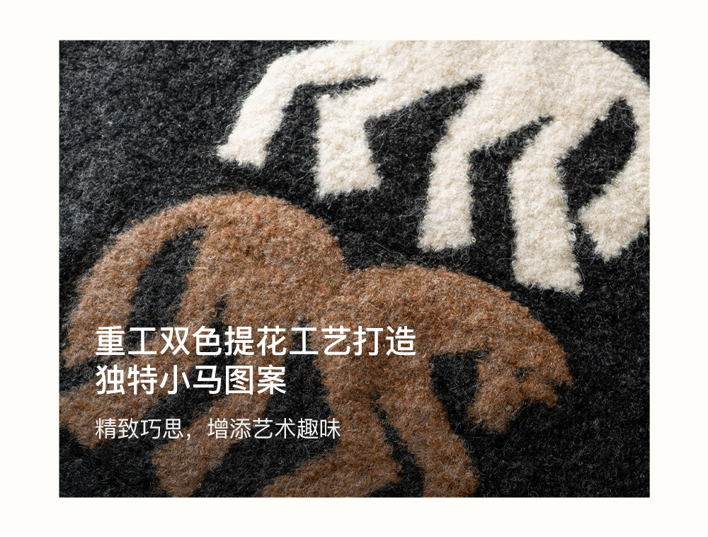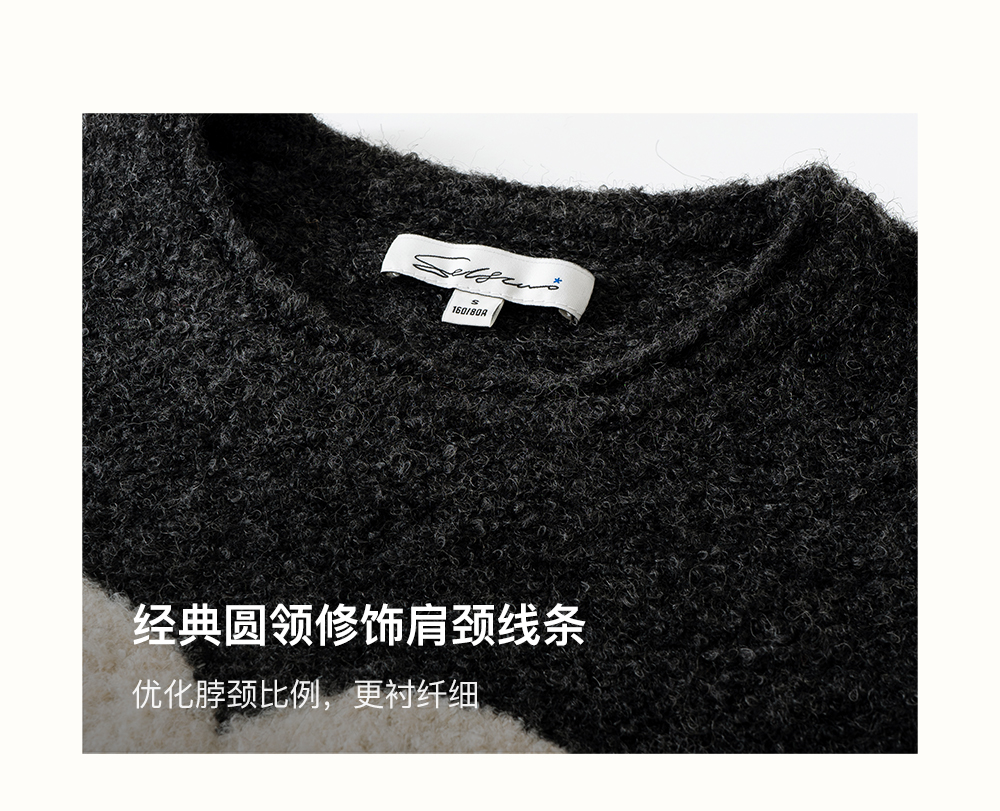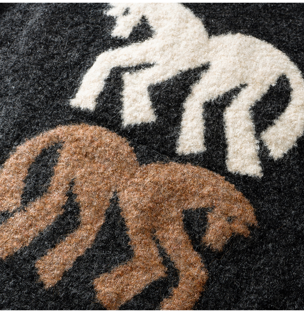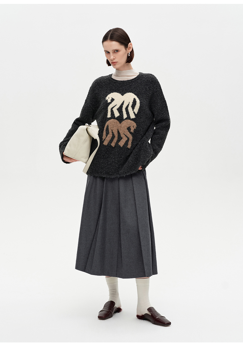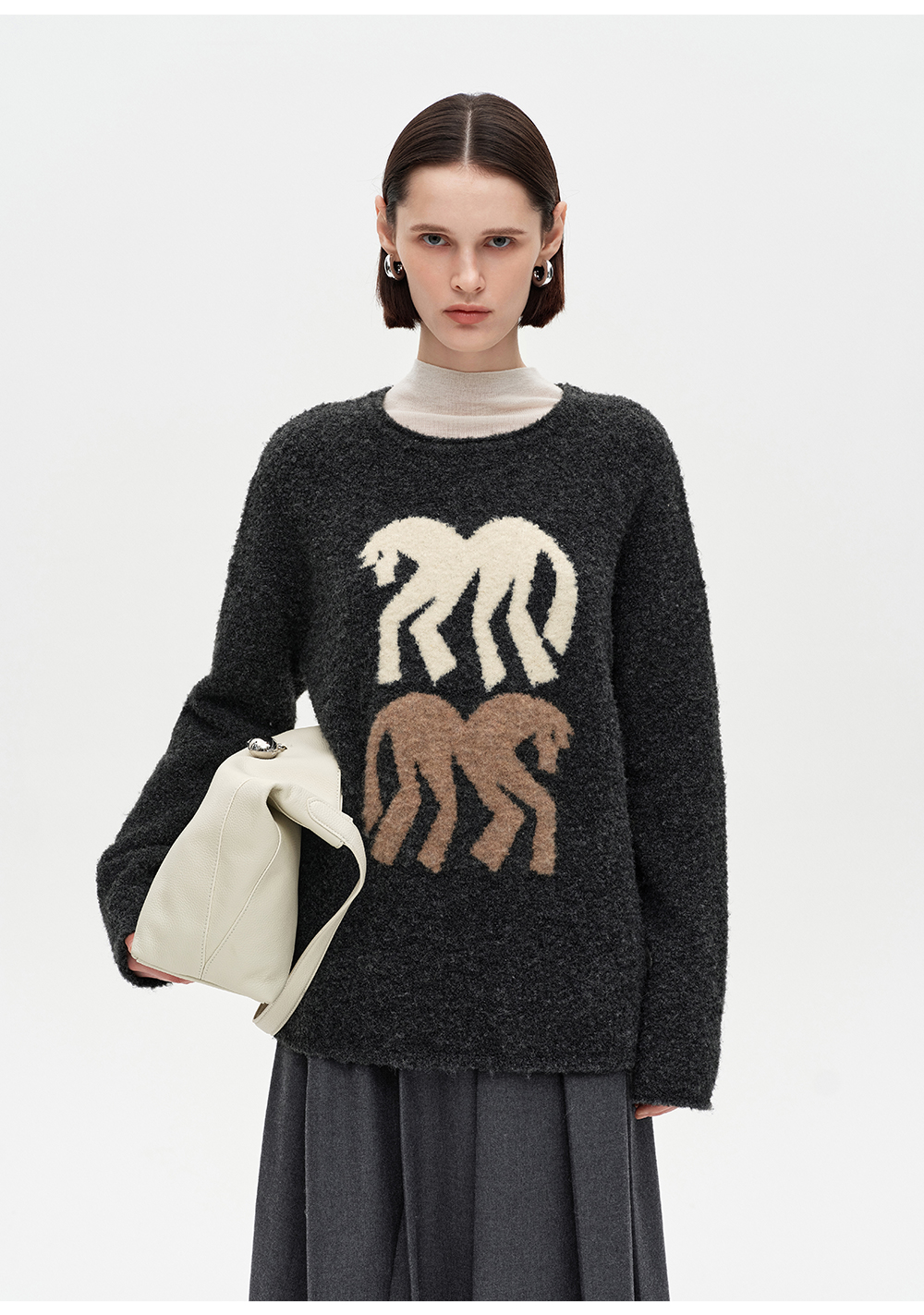 SELFWHO绵羊毛混纺灰色圆领毛衣女2025冬新款小马图案落肩针织衫