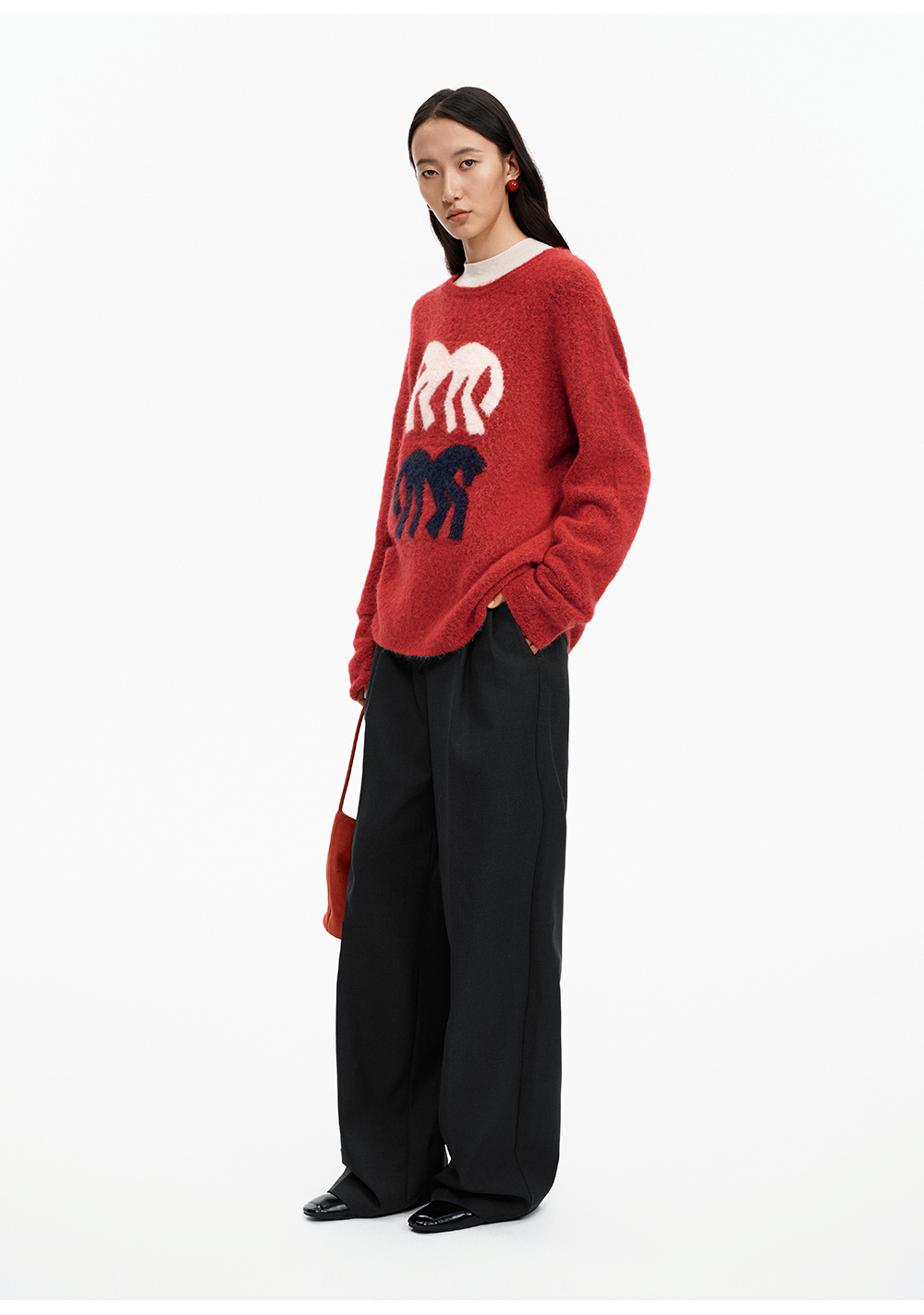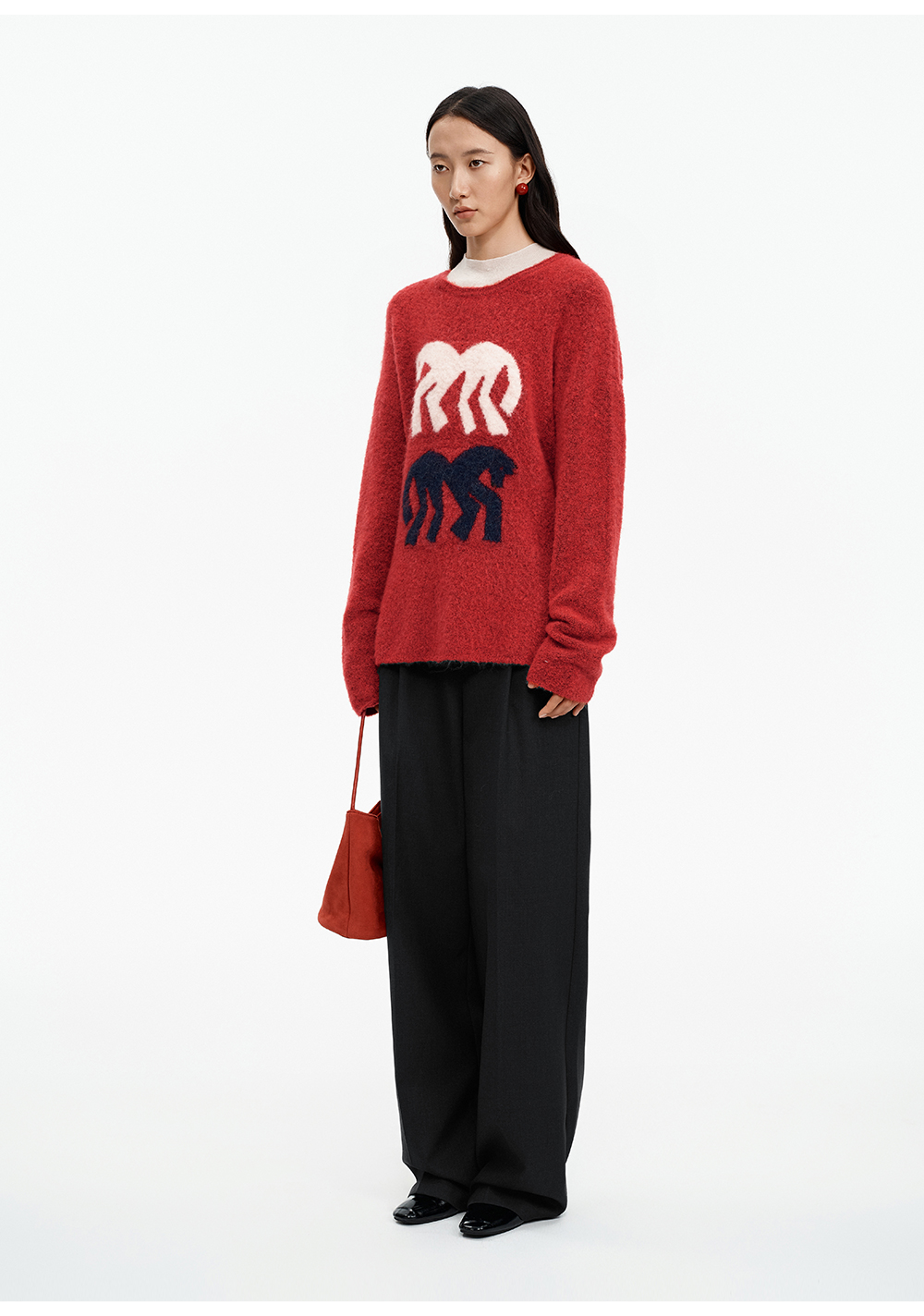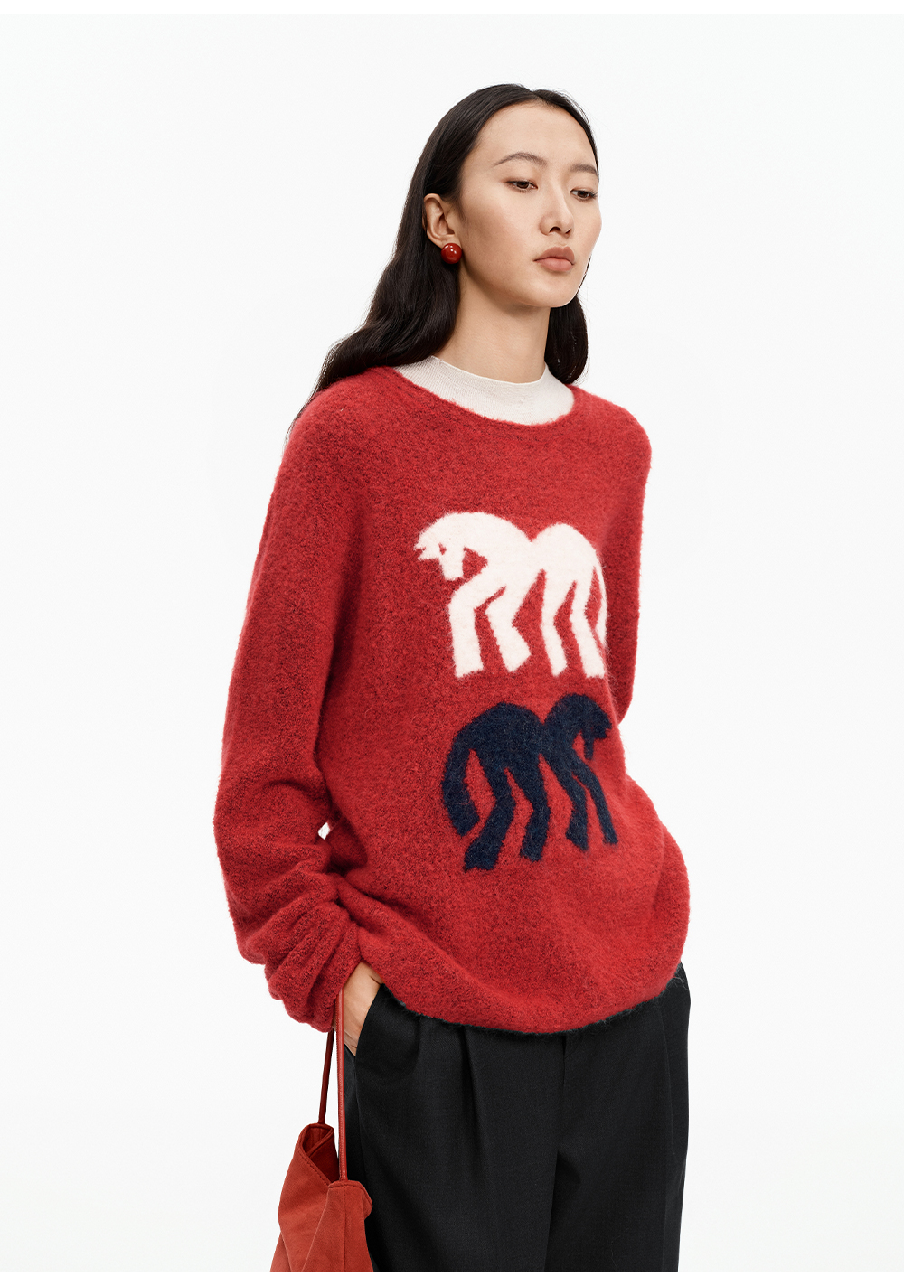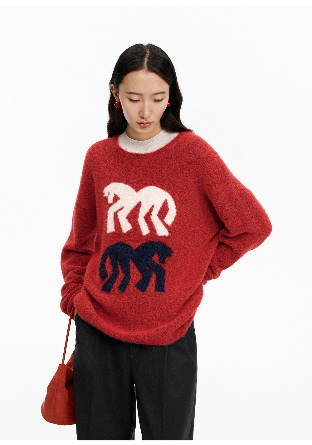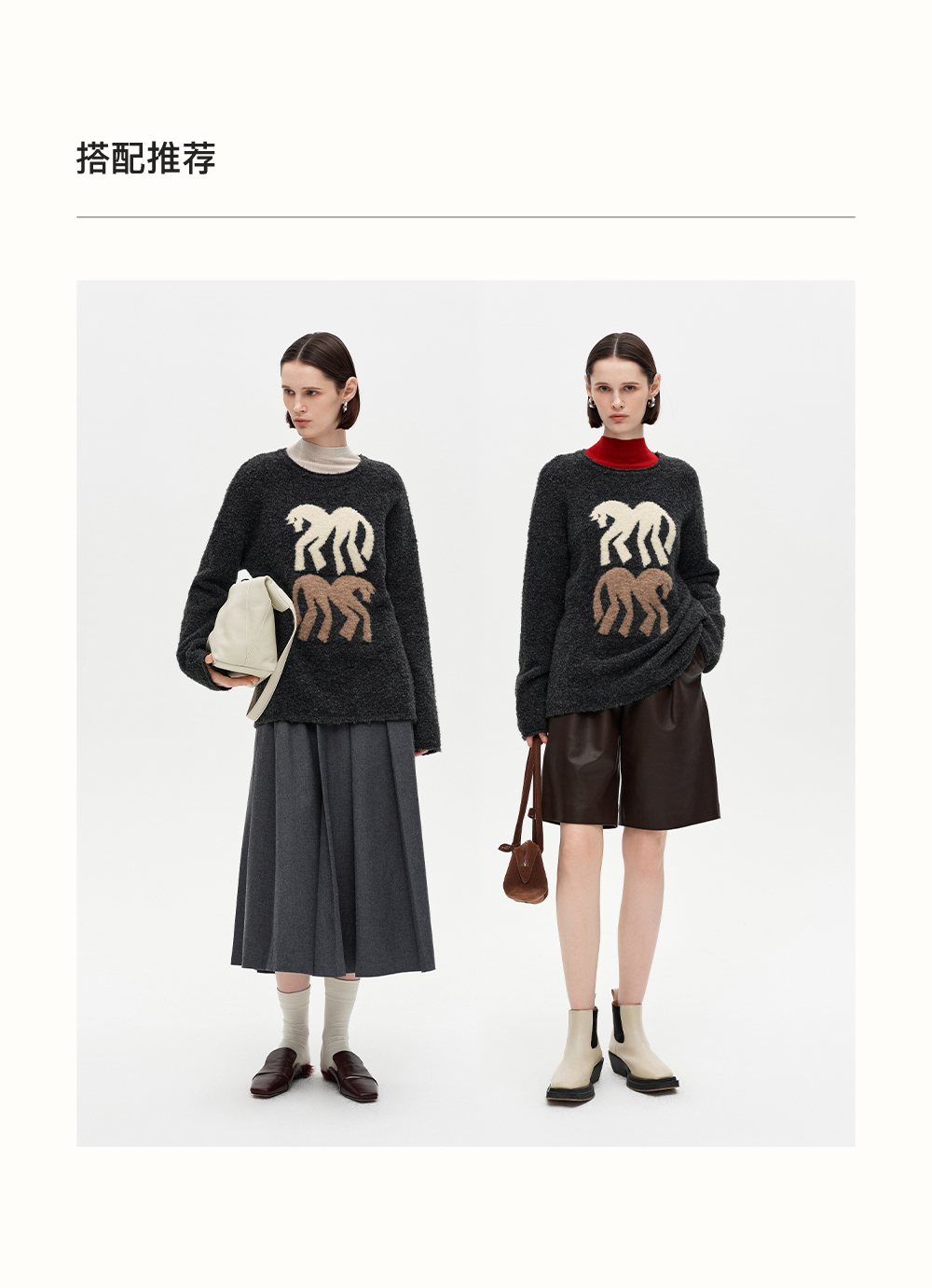 SELFWHO绵羊毛混纺灰色圆领毛衣女2025冬新款小马图案落肩针织衫