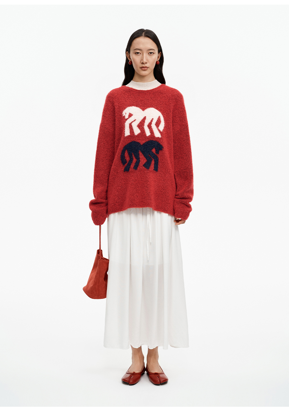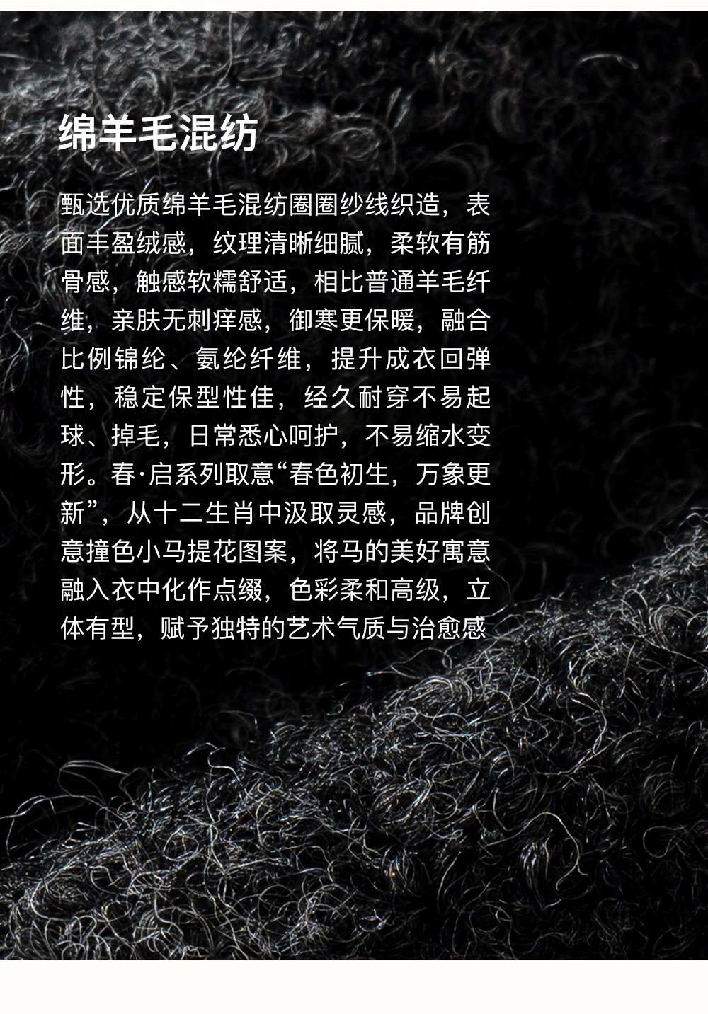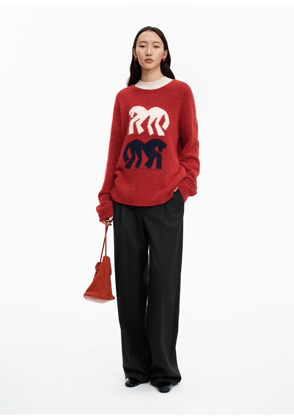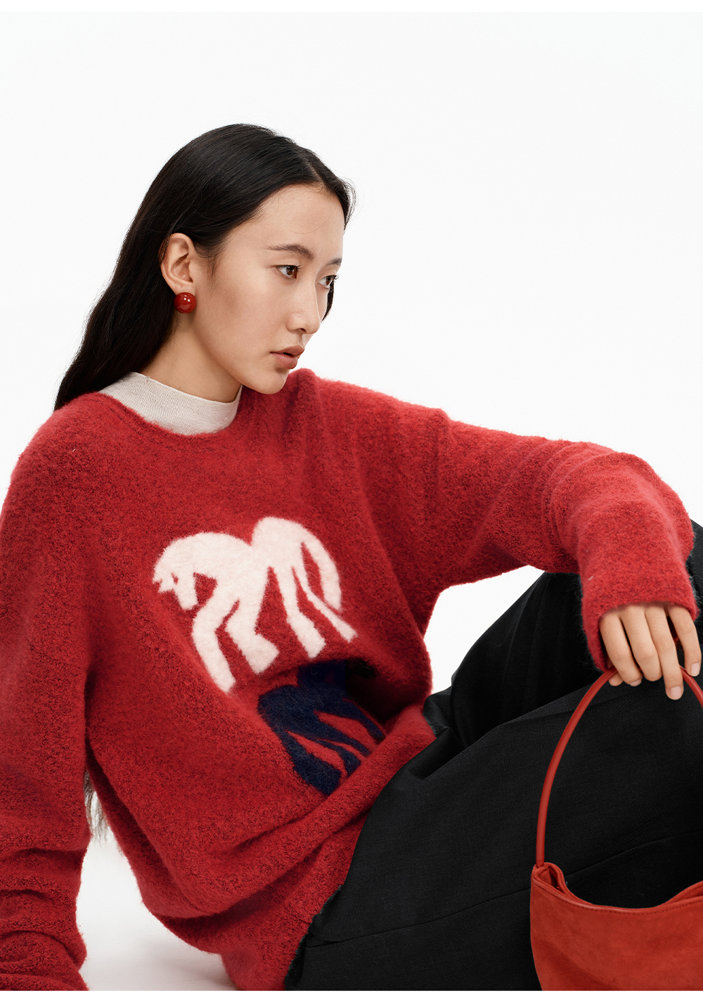 SELFWHO绵羊毛混纺灰色圆领毛衣女2025冬新款小马图案落肩针织衫