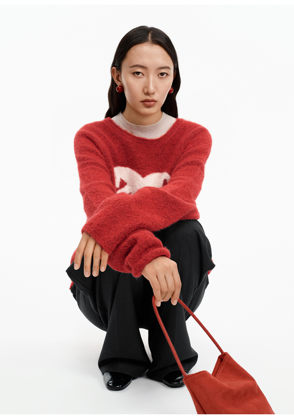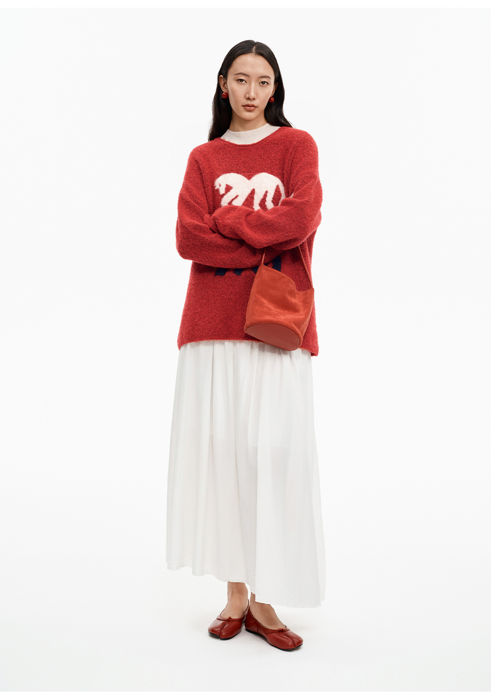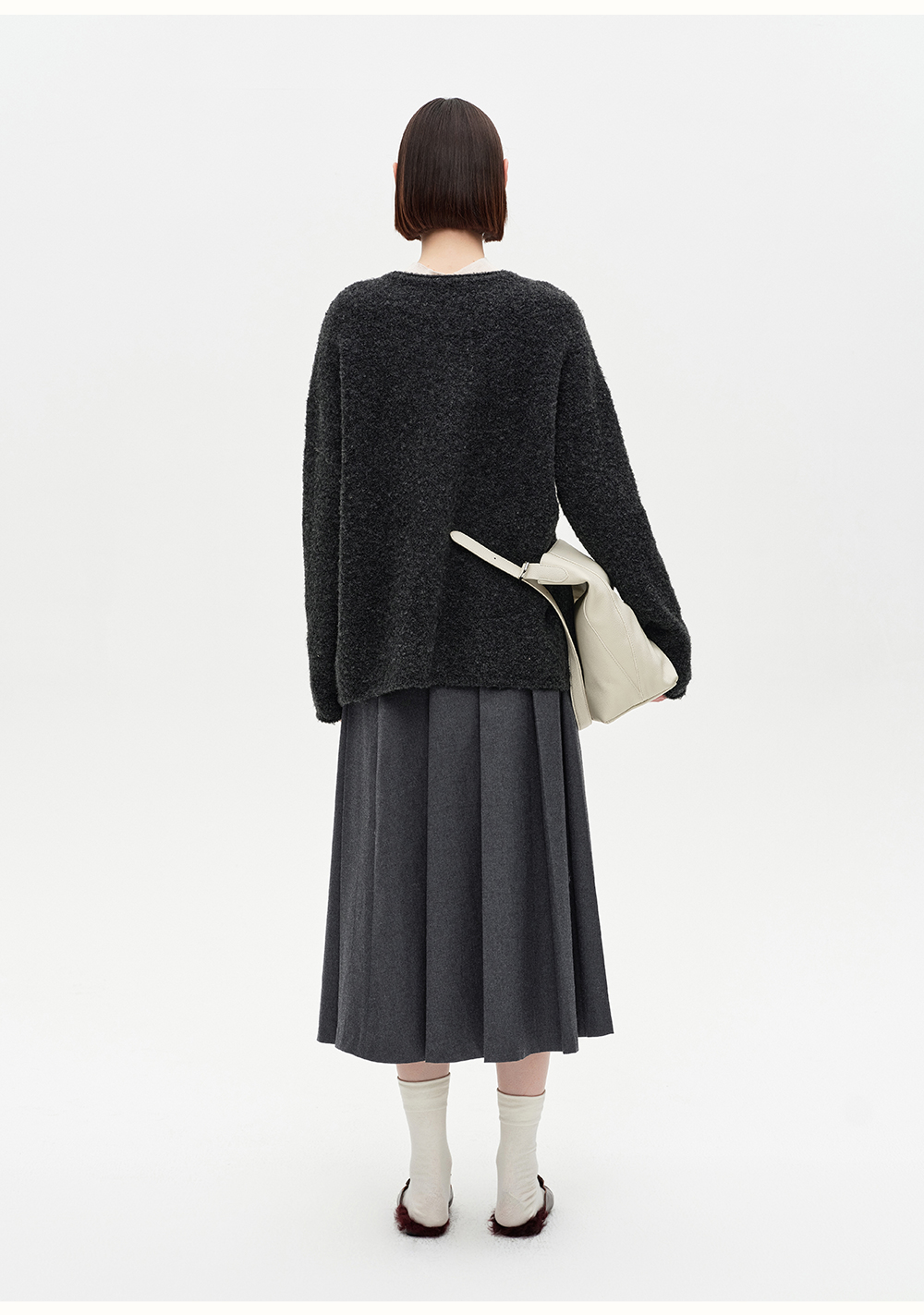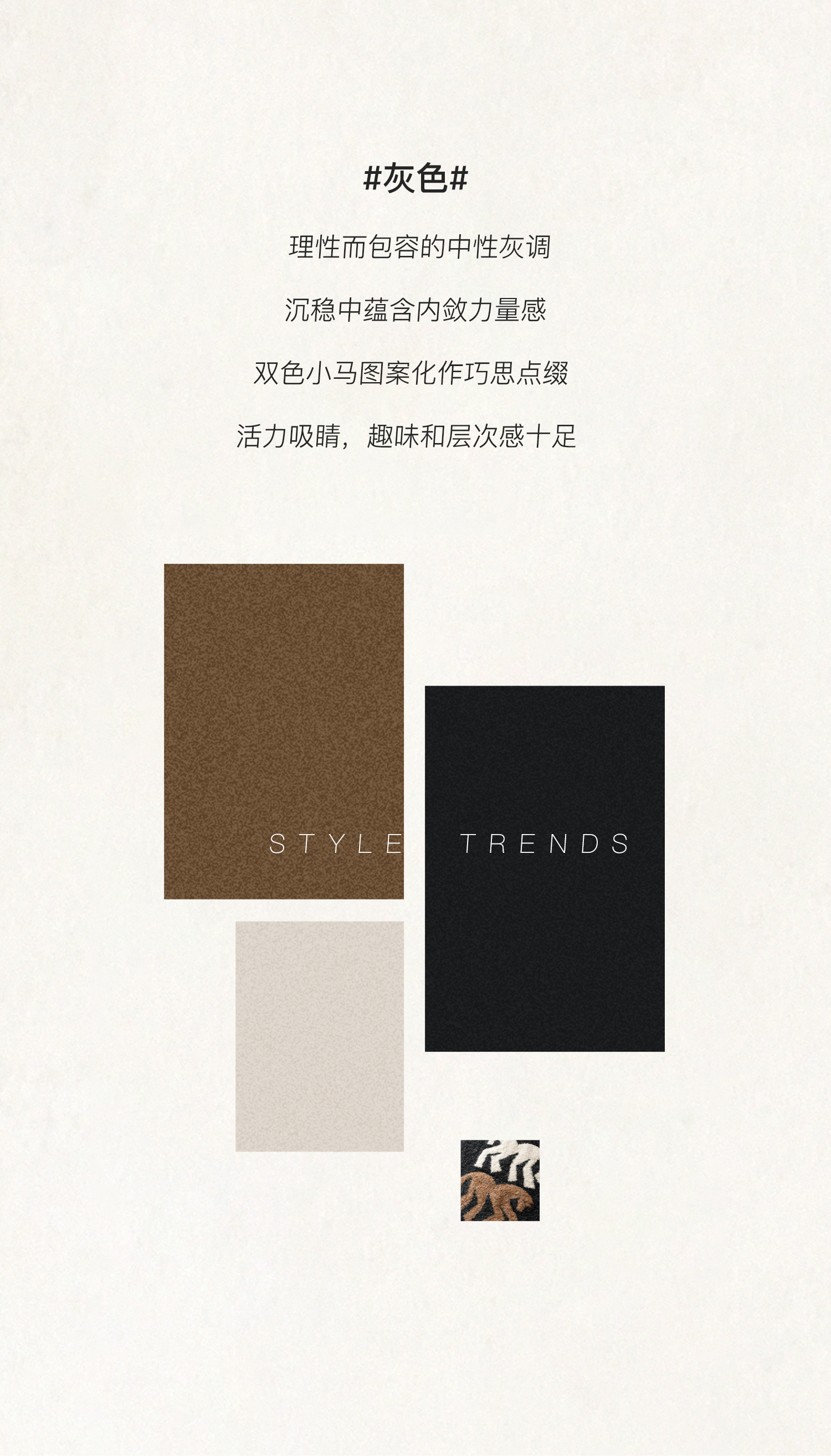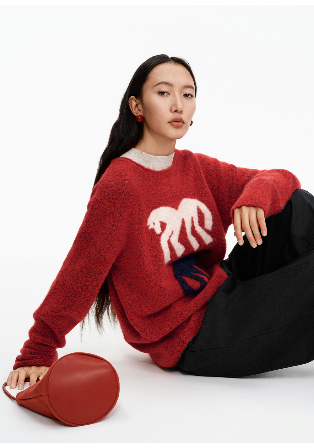 SELFWHO绵羊毛混纺灰色圆领毛衣女2025冬新款小马图案落肩针织衫
