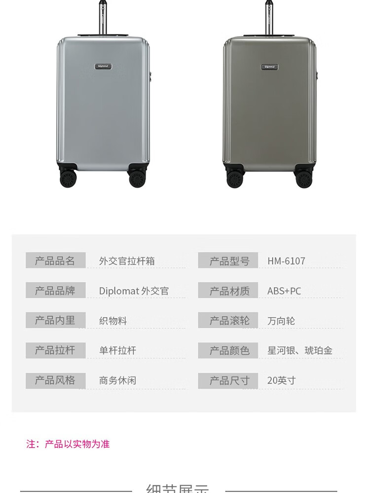 Diplomat外交官20英寸拉杆行李箱大容量结实耐用小旅行箱登机箱HM-6107 琥珀金 20英寸 登机箱