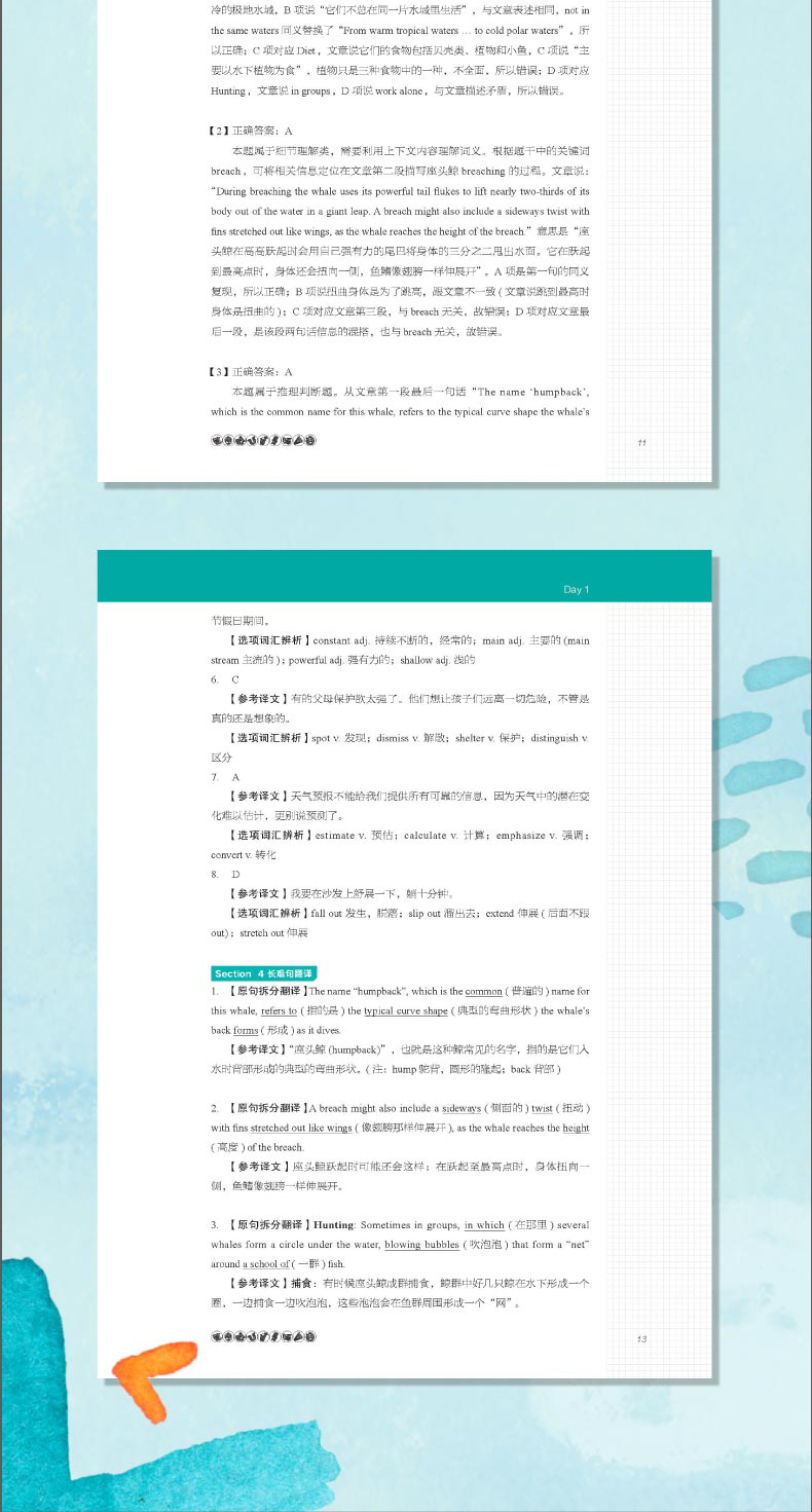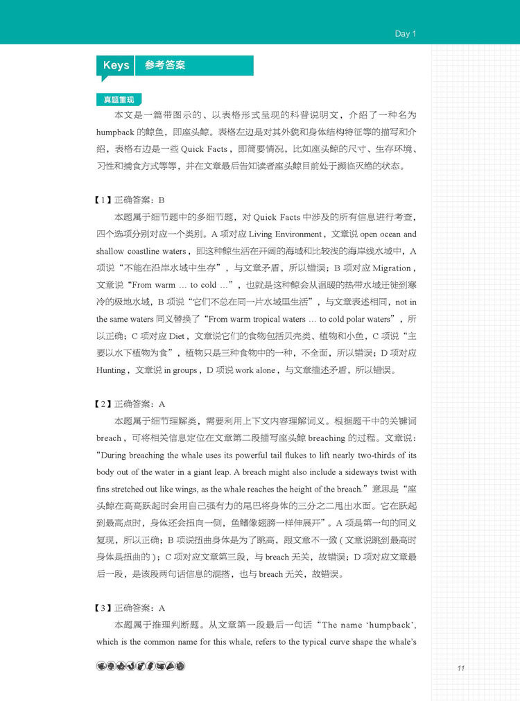 3.解析深入透彻,揭示知识盲区:每一篇文章后面的题目都予以超详解析,提供解题思路,分析语言难点,讲解出题点。