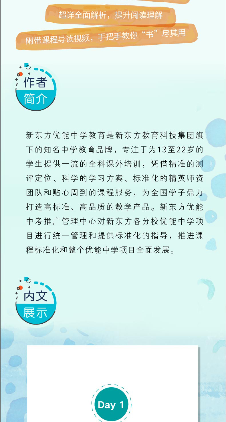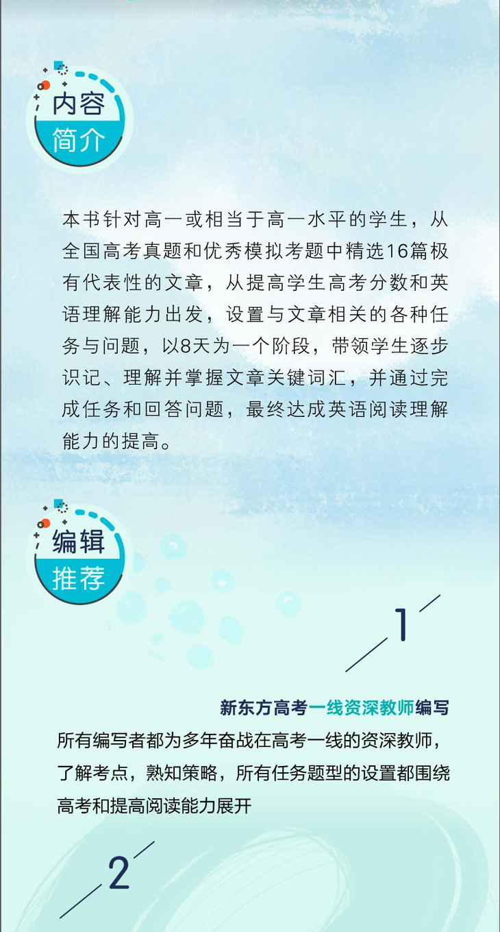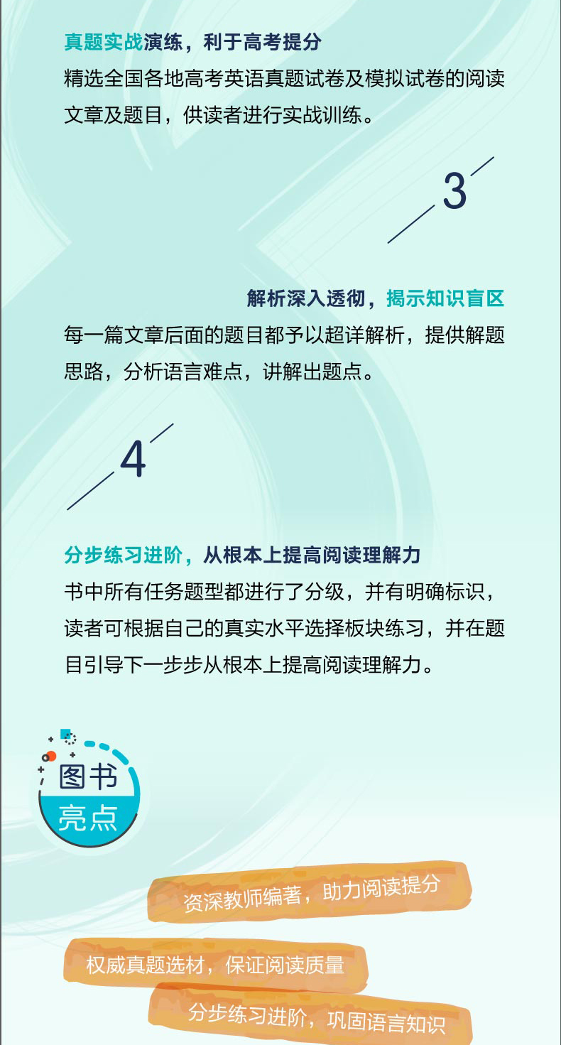 1.新东方高考一线资深教师编写:所有编写者都为多年奋战在高考一线的资深教师,了解考点,熟知策略,所有任务题型的设置都围绕高考和提高阅读能力展开。