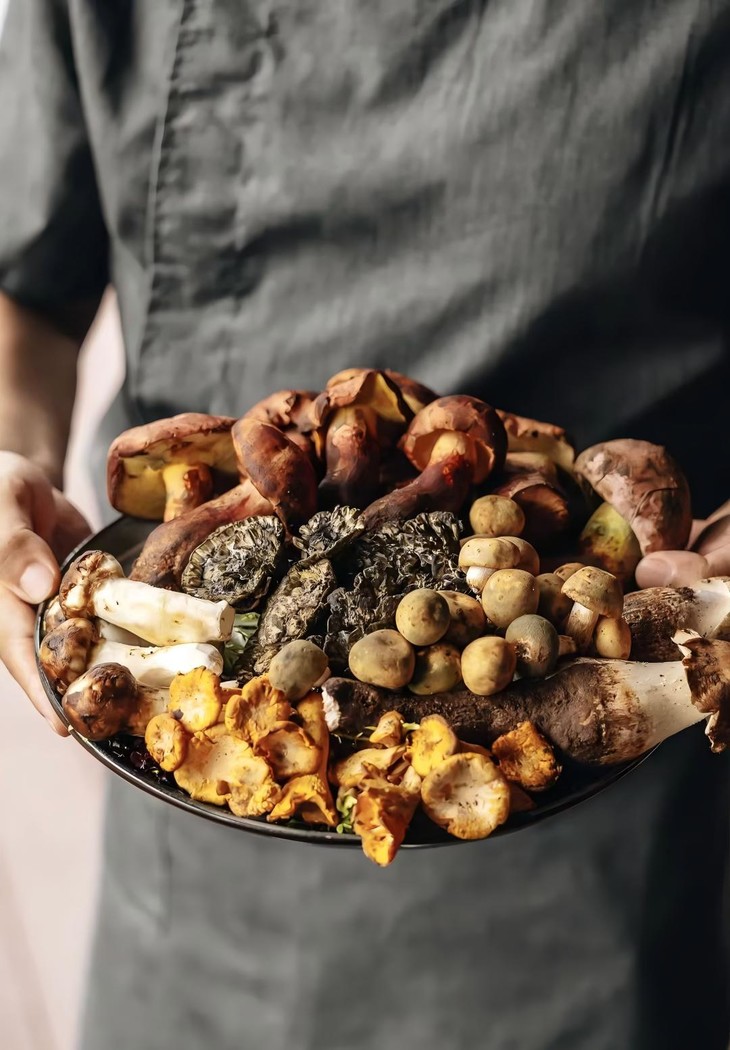 野菌更讲究:5种山珍全是文山海拔1800米以上的深山货:鸡油菌像小太阳,熬汤会析出金黄的油;牛肝菌厚实得像小巴掌,咬开是森林的清苦回甘;鹿茸菇脆生生像小蘑菇糖,姬松茸带着坚果香,小香菇则是鲜味的“底色”——它们在锅里咕嘟咕嘟煮着,菌伞撑破,菌柄软而不烂,醇厚鲜香。