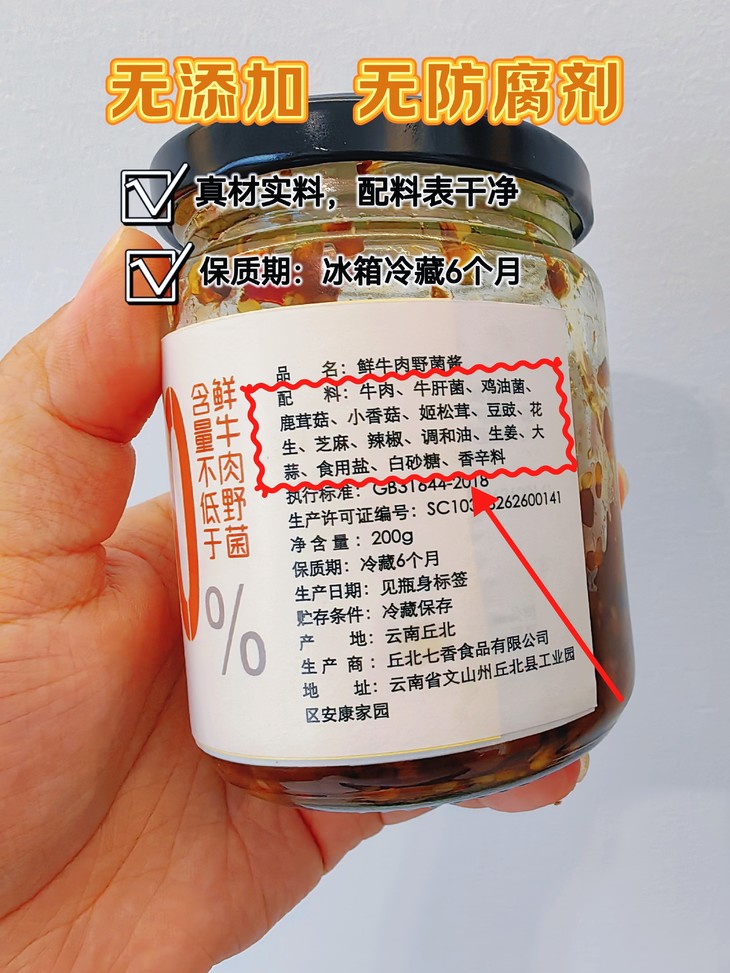 高原秘境山野的黄金组合 👍 原材:源自中国辣椒之乡云南丘北,牛肉、菌菇、辣椒等所有原材高原原生态种养,产地新鲜直供。 👍 工艺:20年专研秘方, 传承手工古法制酱工艺,保留食材自然原味与营养。 👍 品牌:中国辣椒之乡与中国彩色辣椒酱口碑品牌七香姐匠心力作,20年专业制酱,千万粉丝信赖之选。 👍 品质:0防腐剂0香精0色素无任何化学添加。国家质检,安全放心,新鲜现做,从辣椒采摘到成品不超过8小时。 👍 口味:牛肉+菌菇含量不低于70%,原切大颗粒黄牛肉,嚼劲十足;厚切稀有山珍,香、辣、鲜、脆、爽,干饭有滋有味有灵魂。 👍 吃法:拌面、拌饭、佐餐、蘸料、烹饪调味,百搭万能爆款,酱心陪伴你每一餐~