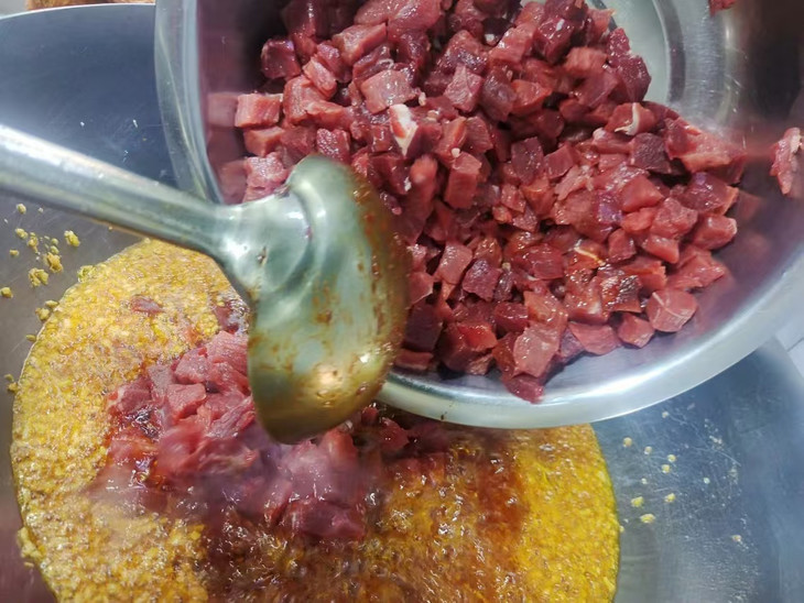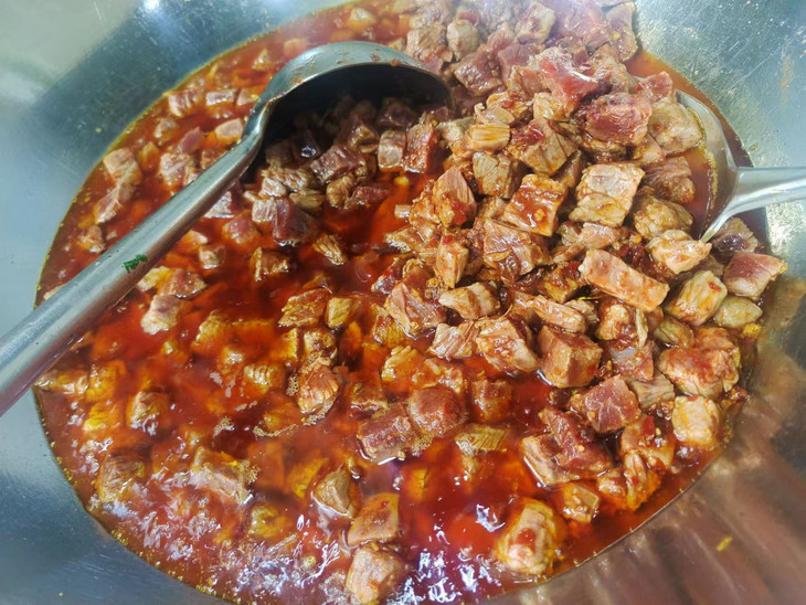 熬酱的锅是铸铁锅,火候得守足2-3小时:先大火把牛肉逼出油脂,逼出香味;再转最小火,让野菌慢慢吸饱肉汁,菌的鲜和肉的鲜缠成一团;最后收汁时要不停搅拌,防止糊锅——师傅的手被蒸汽熏得发红,却笑着说:“急不得,慢工才养得出好酱。”