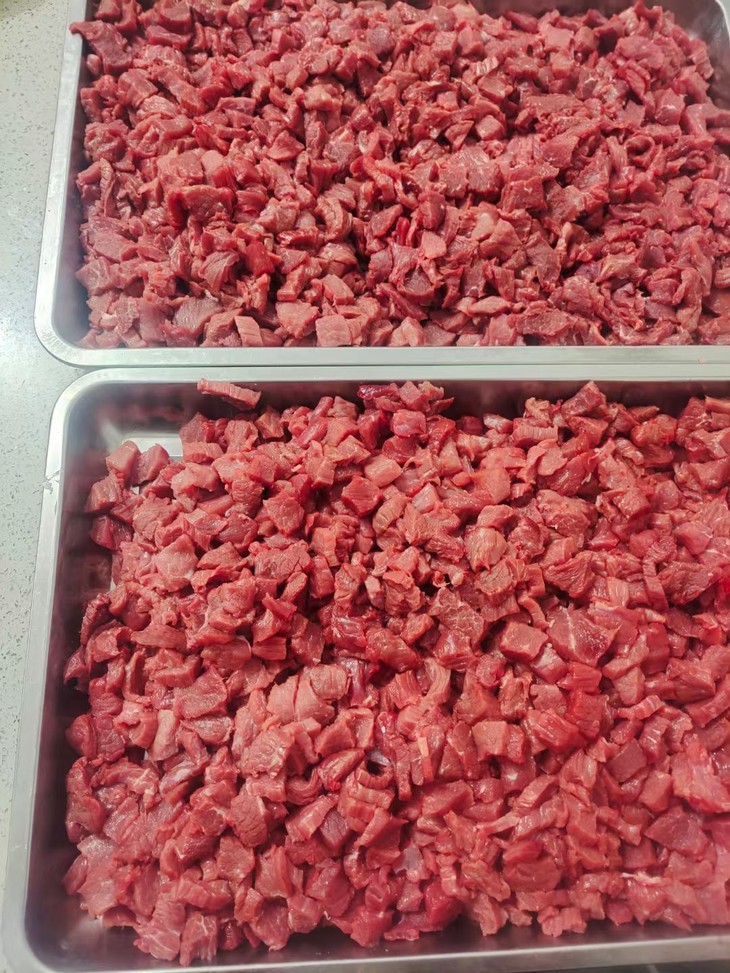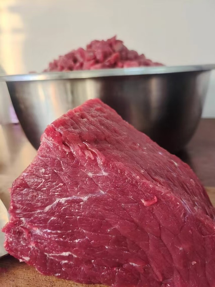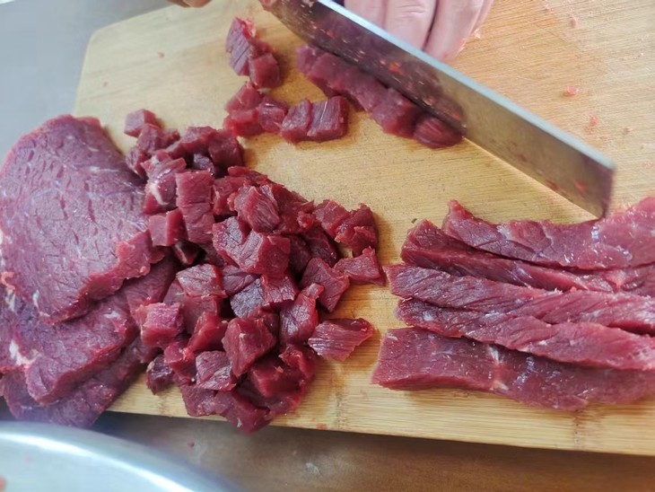 牛肉选的是云南文山深山的“跑山黄牛”。它们吃着山坡上的野草,喝着山泉水长大,肉质紧而不柴。我们只取牛后腿的“黄瓜条”部位,筋膜少、瘦肉多,咬下去是弹牙的肉粒感,不是软塌塌的“肉糜”。