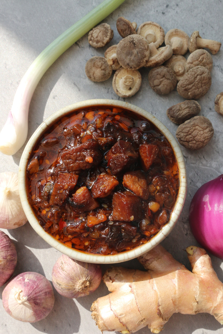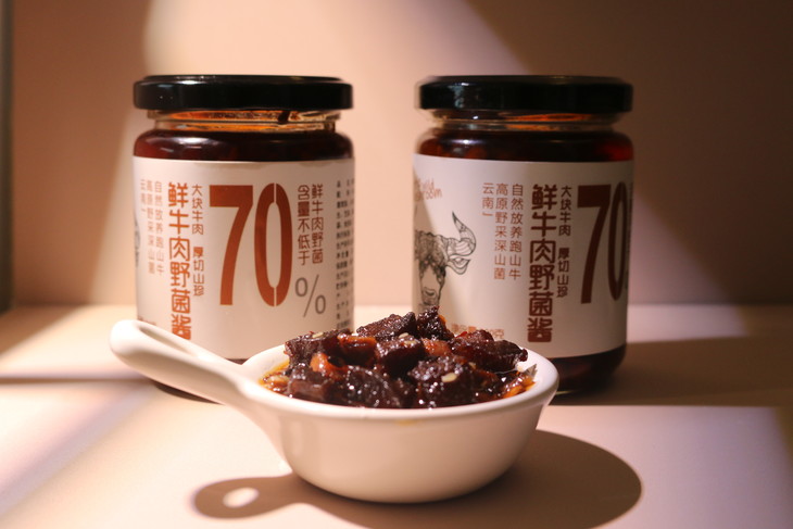 我们的酱,只有牛肉、野菌、姜、蒜、油、盐、白砂糖、香辛料。没有添加剂提鲜,没有防腐剂锁味,连香精色素都不放。鲜,全靠牛肉本身的甜、菌子的鲜,和慢火熬炖的功夫熬出来。