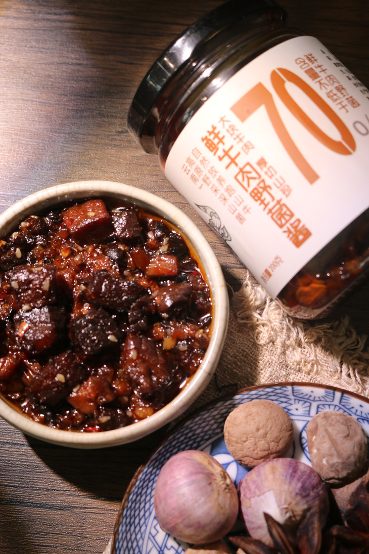 每一口都是醇香的自然气息,无论是拌面拌饭,还是沾着吃,每一口都能吃到饱满真实的牛肉粒,饱满的香菇和大颗牛肉粒完美融合,一口下去如火烧翠云山,酱香麻辣浓郁,嚼劲十足,口感细腻。 不像其他牛肉酱,只见酱不见肉,七香姐鲜牛肉野菌酱,牛肉和菌子占比70%%左右,能用筷子夹起来的牛肉粒,是扎扎实实的肉感。