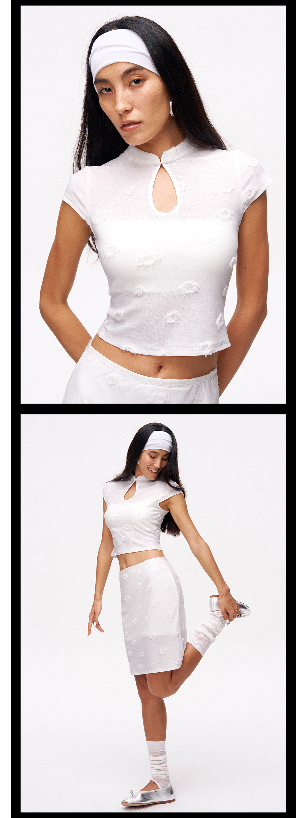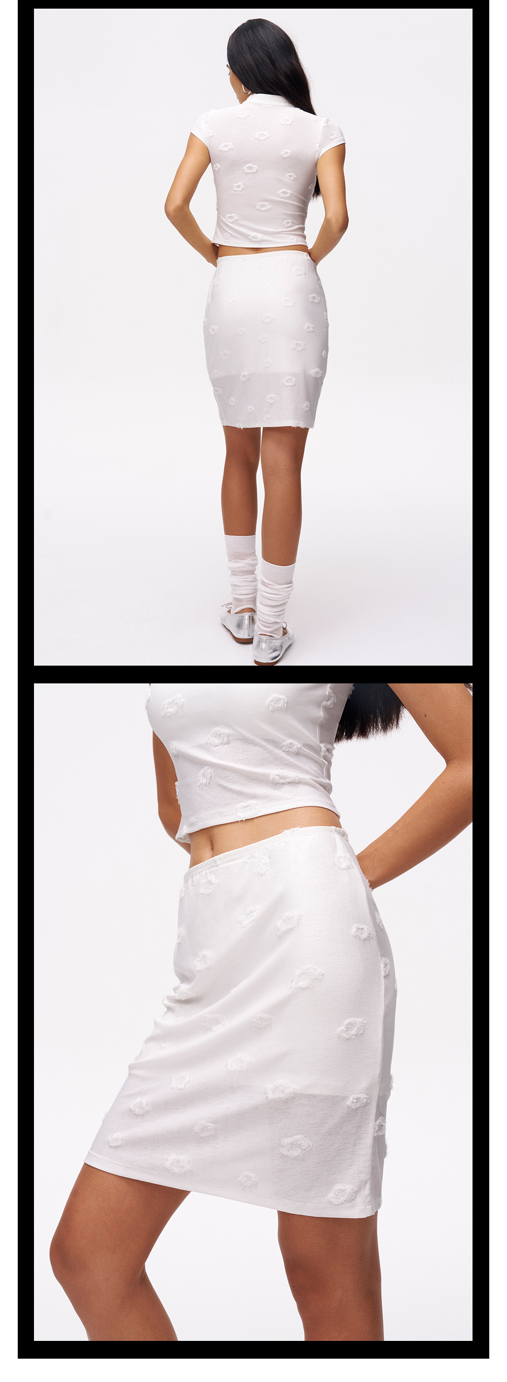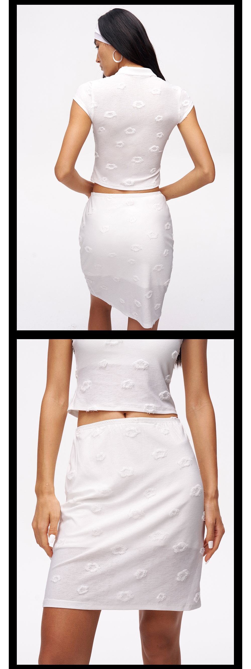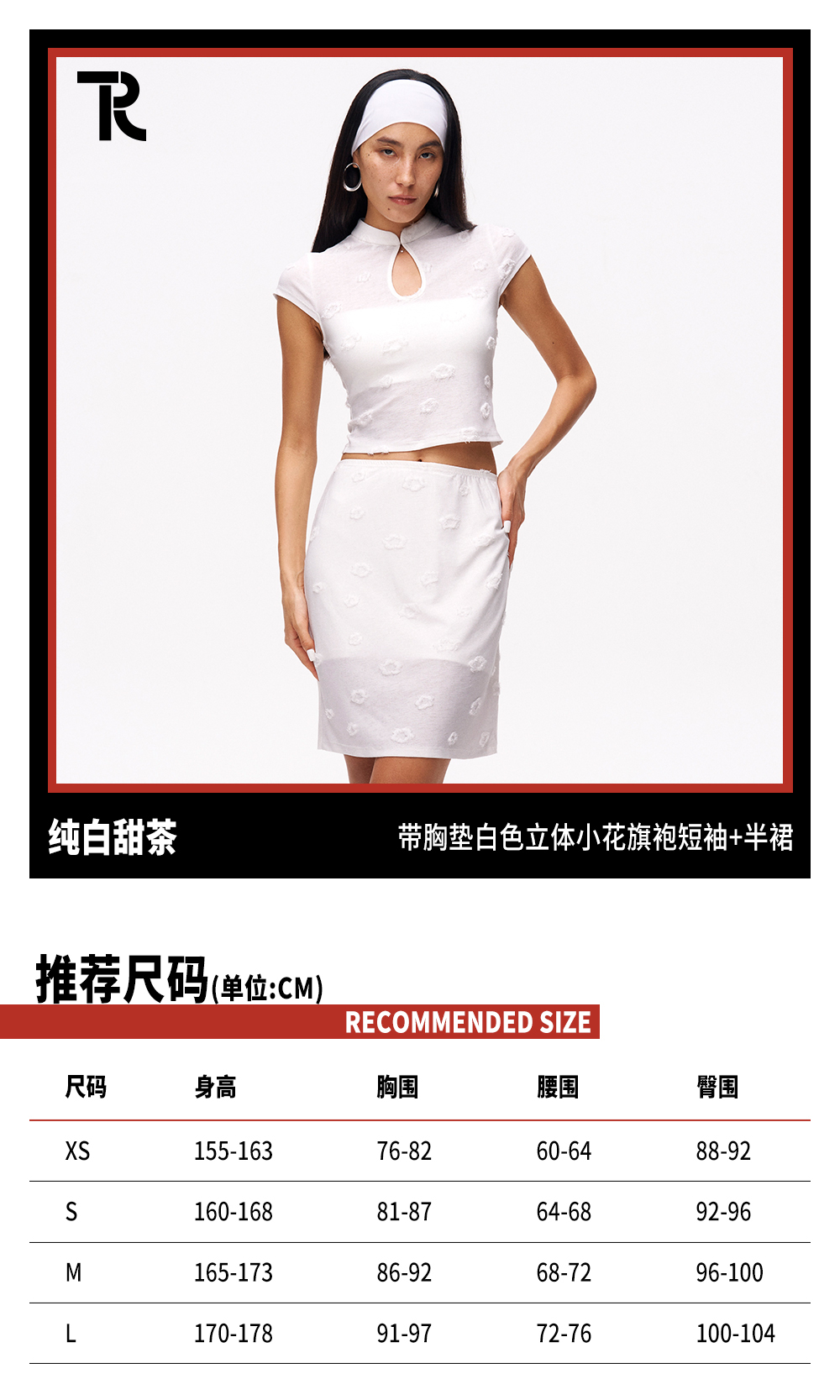 TR她热 纯白甜茶 白色针织弹力提花镂空修身带胸垫短袖半裙套装