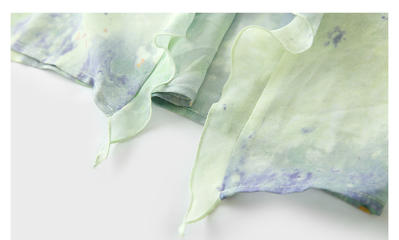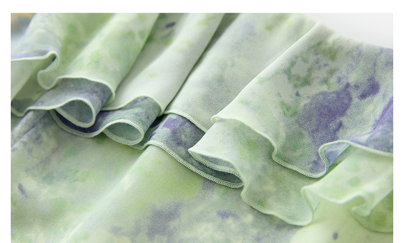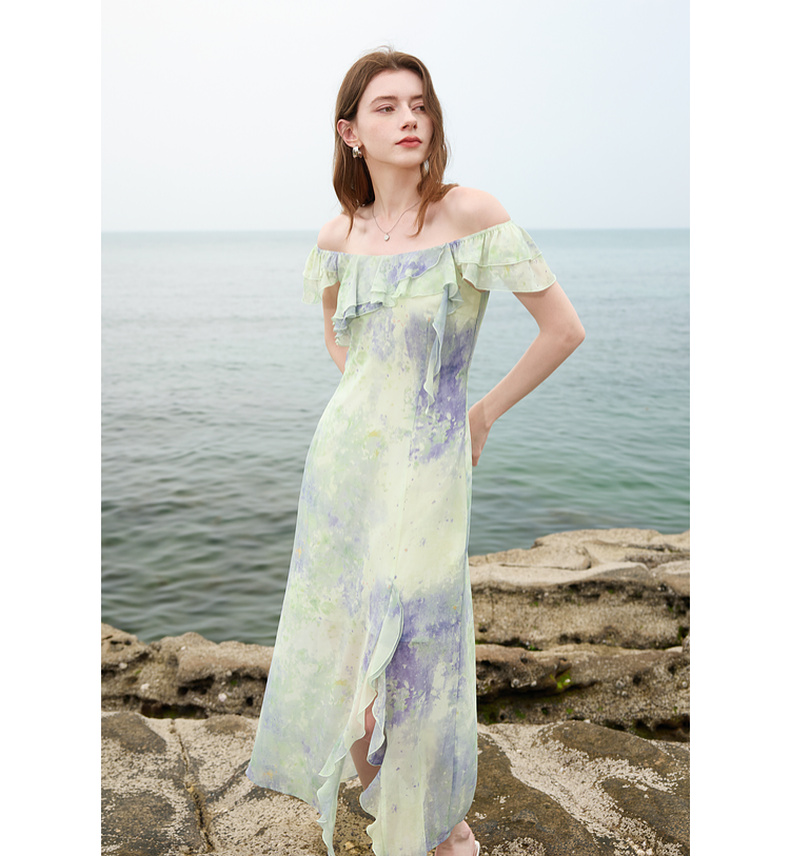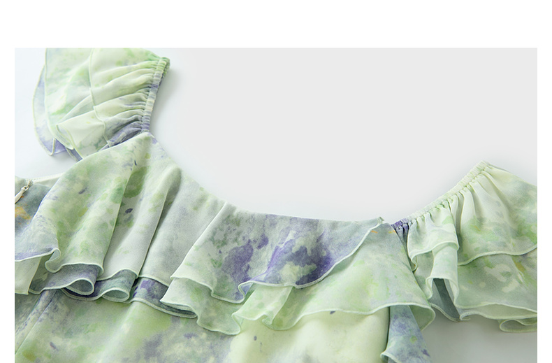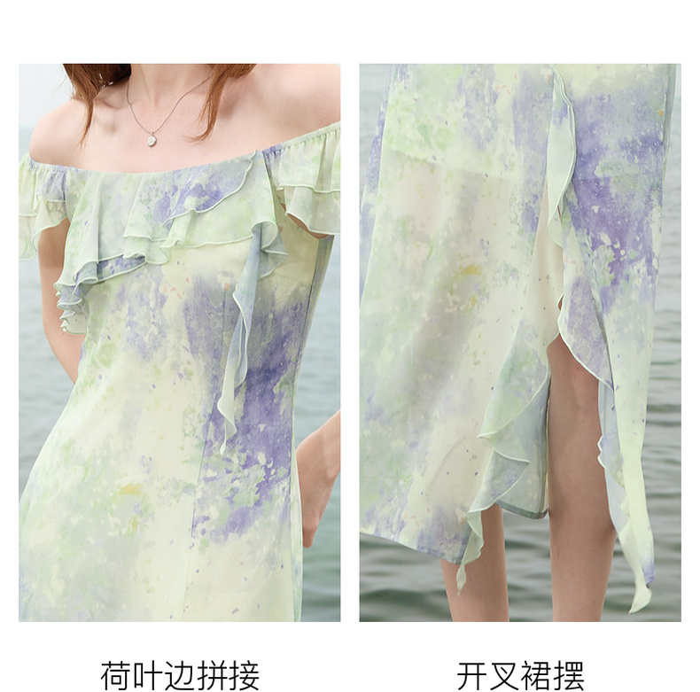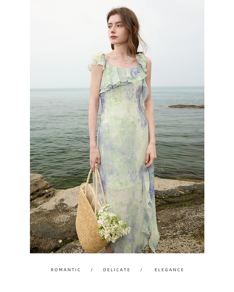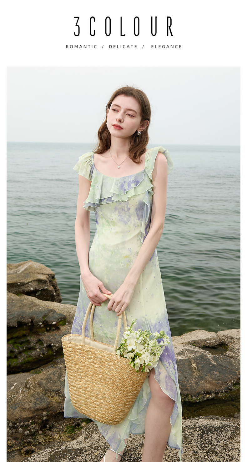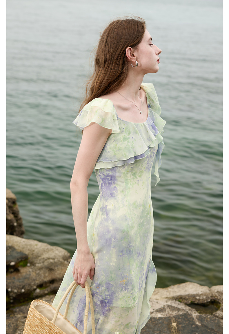 三彩2025夏季新款晕染连衣裙荷叶边方领A字裙法式长裙度假M