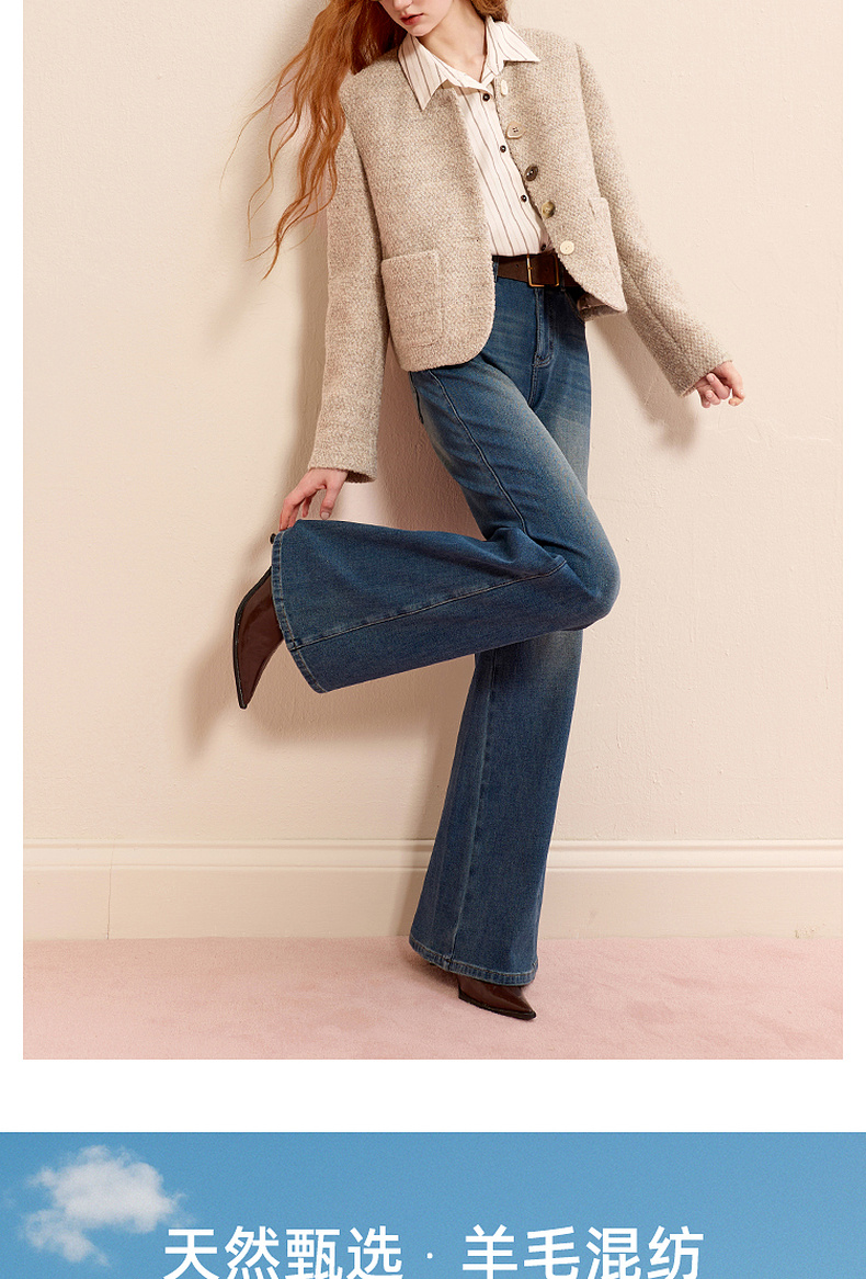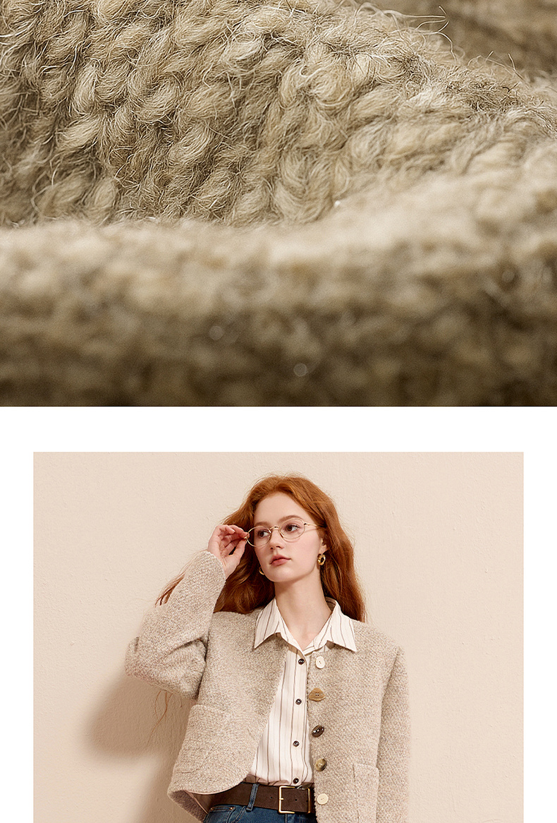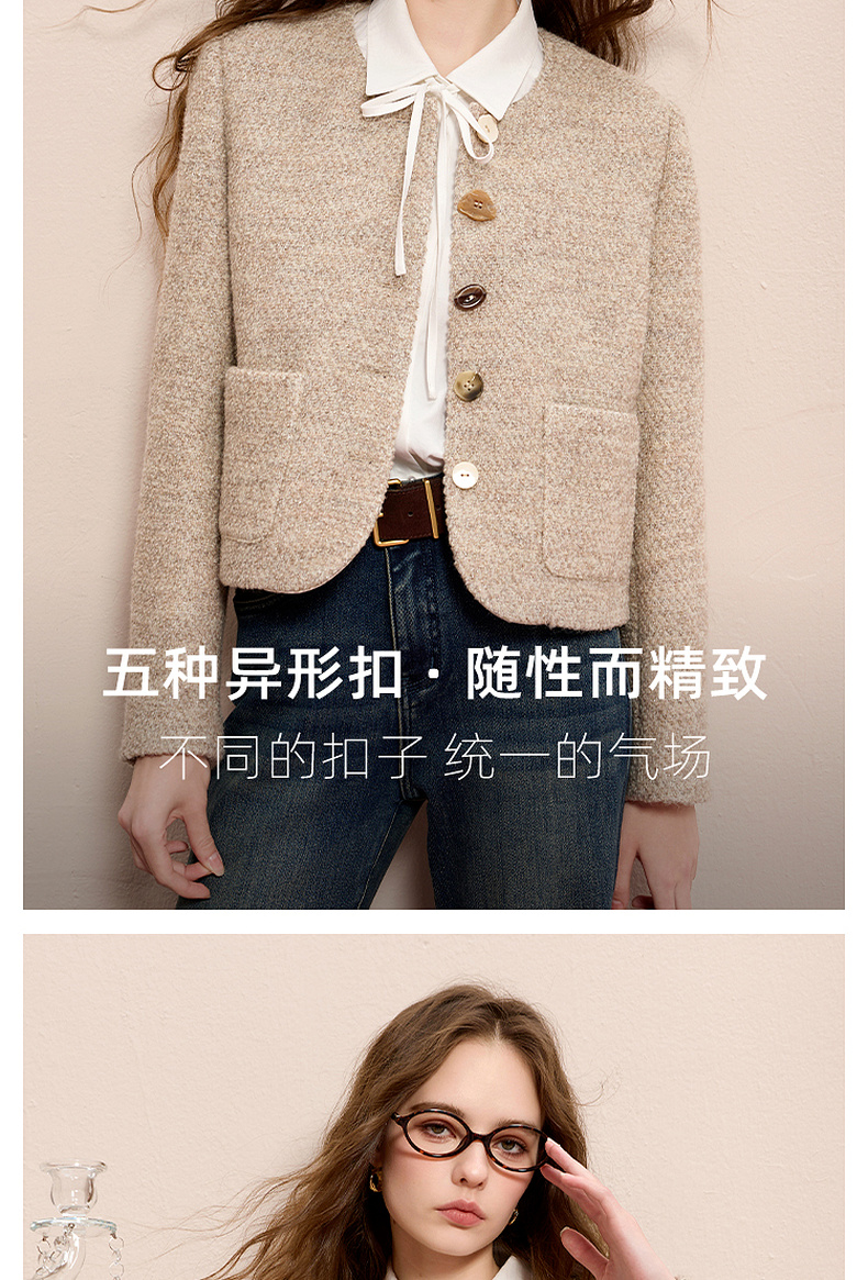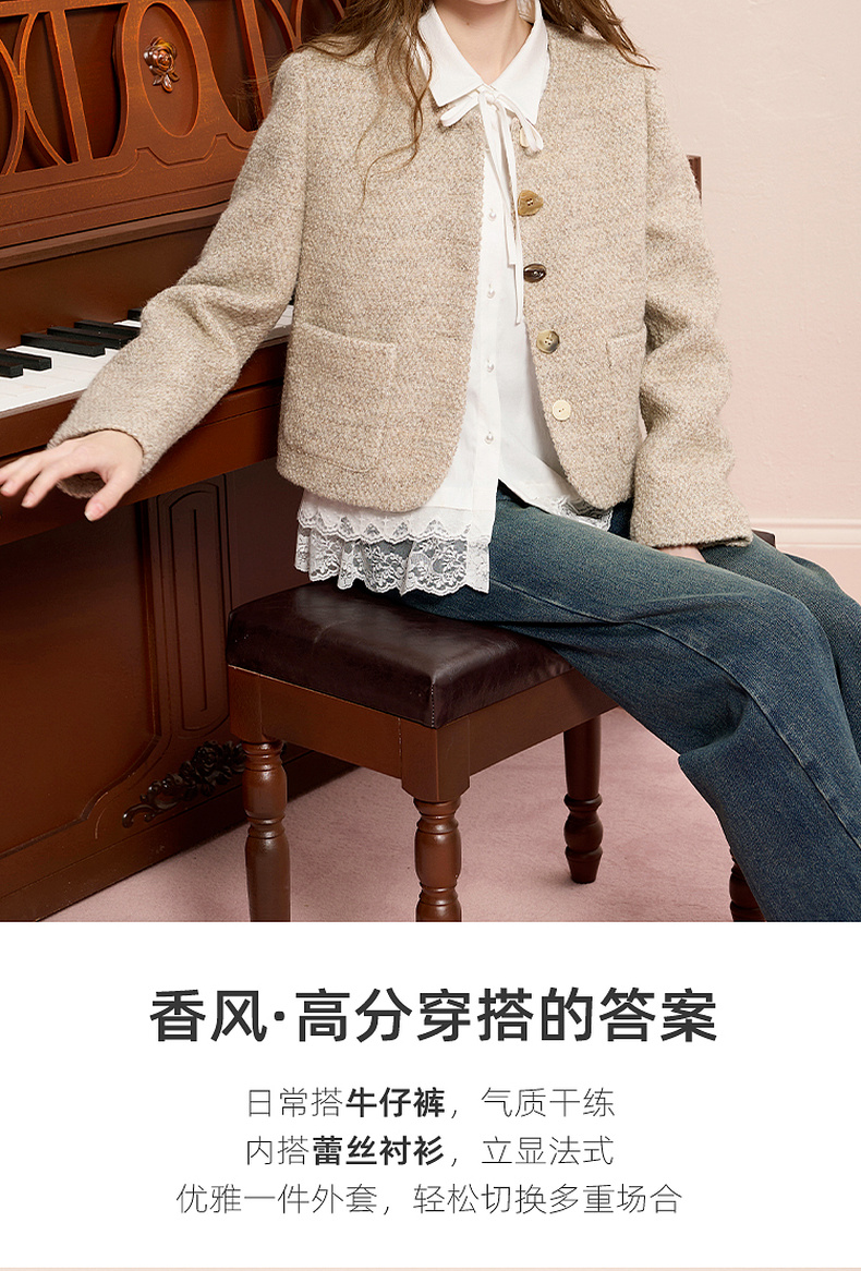 【绵羊毛】三彩2025冬季新款香风毛呢外套圈圈呢圆领短款大衣M