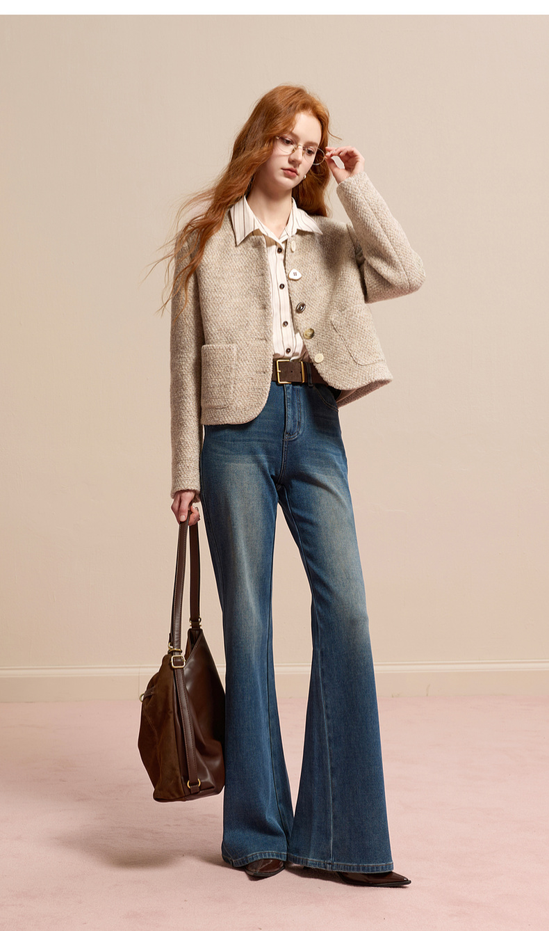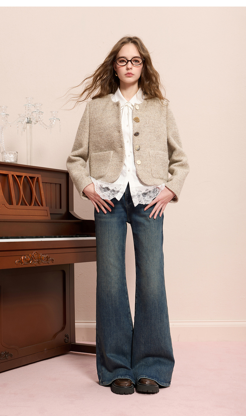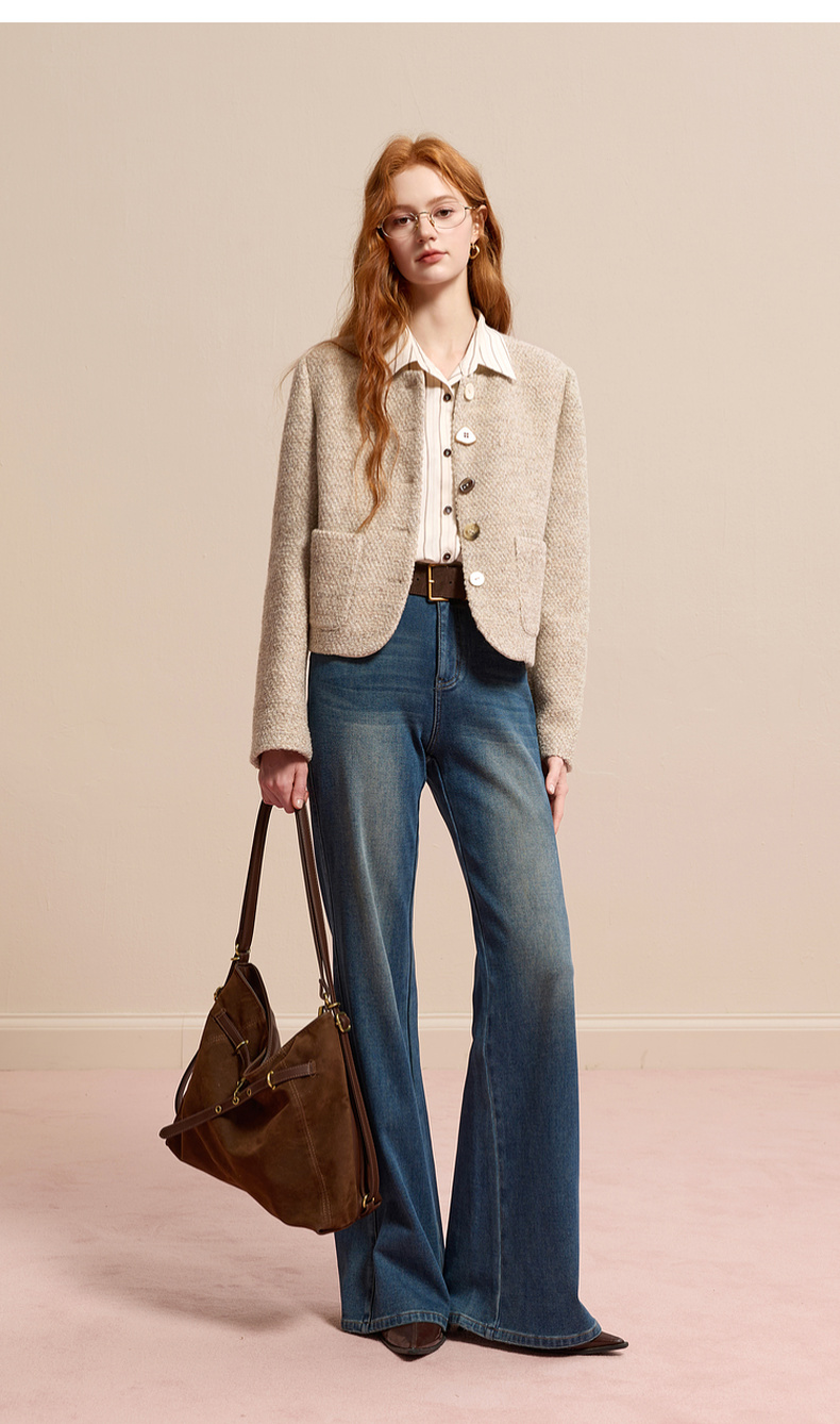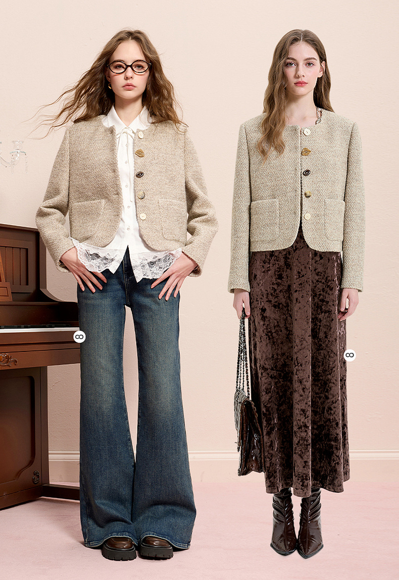 【绵羊毛】三彩2025冬季新款香风毛呢外套圈圈呢圆领短款大衣M