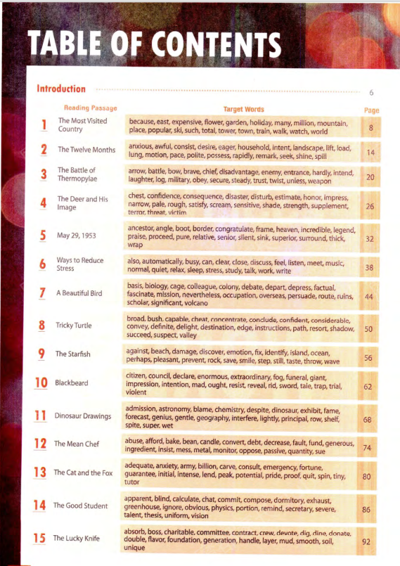 🏖️①这套教材精选了4000个基本的高频英语单词,涵盖了口语及书面语中的常见词汇。按从易到难编辑成6册,每册600个单词,分成30组,每组20个。这些词汇覆盖了英文报纸中80%、小说和口语对话中90%以上的词汇。