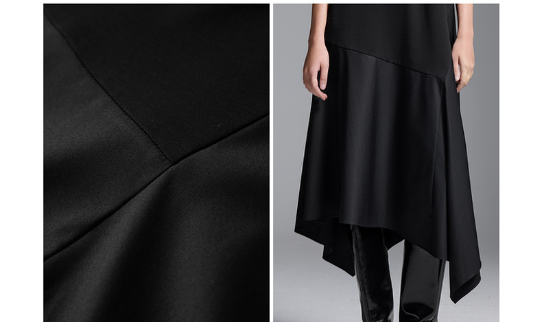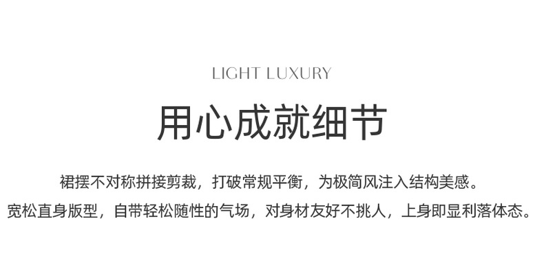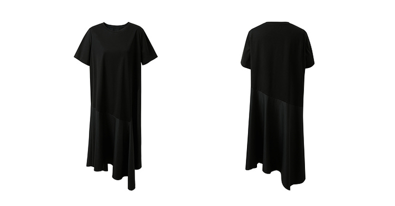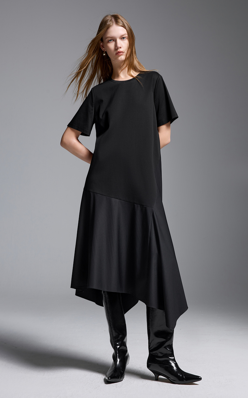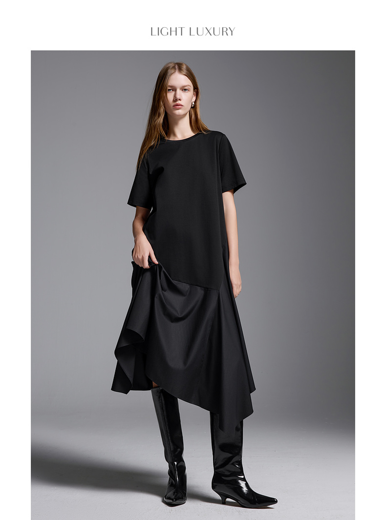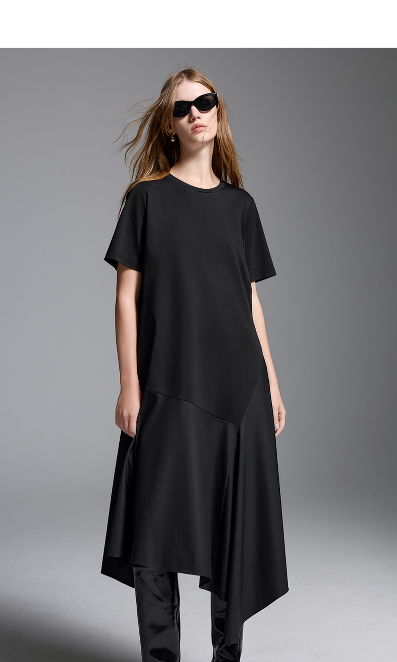 三彩2025夏季新款拼接连衣裙圆领宽松短袖直筒裙长裙简约S