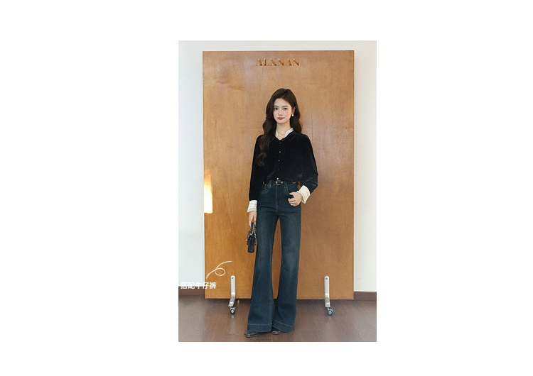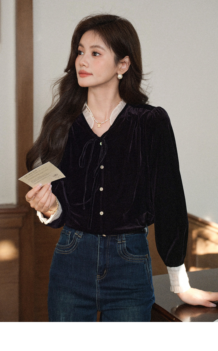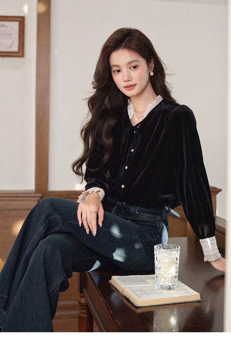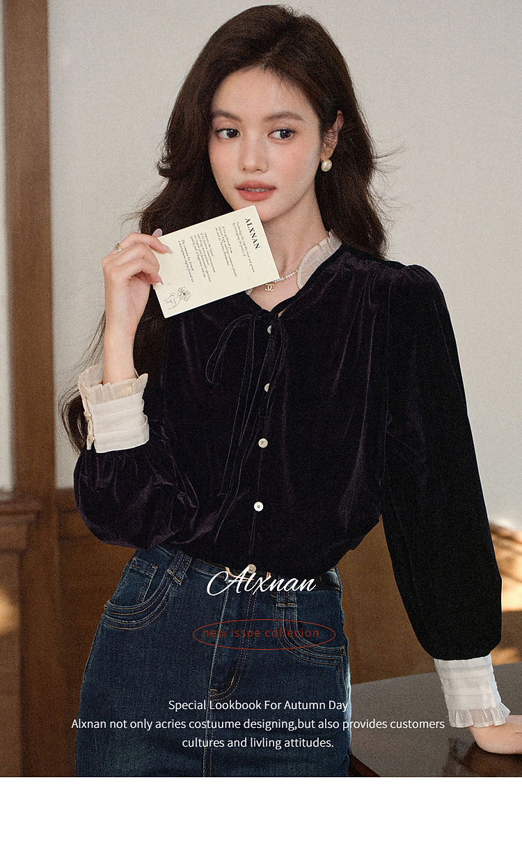 鹿向南「慵懒周末」法式黑色木耳边立领衬衫设计感长袖上衣女初秋