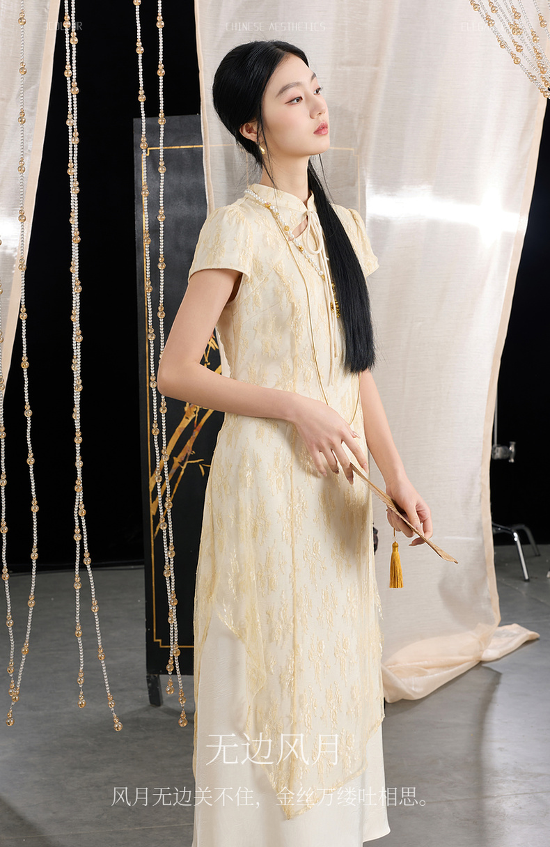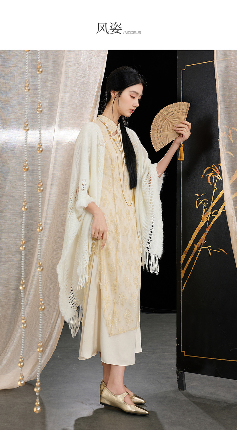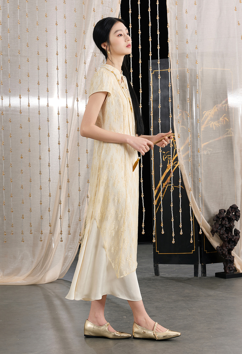 三彩【无边风月】2025秋季新款假两件连衣裙收腰A字裙长裙旗袍中式C