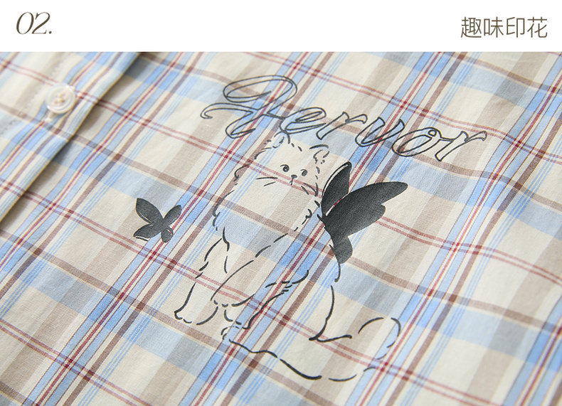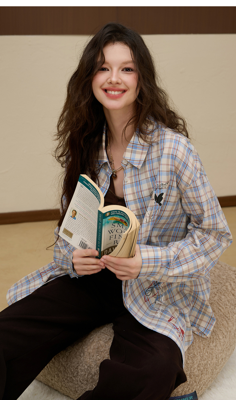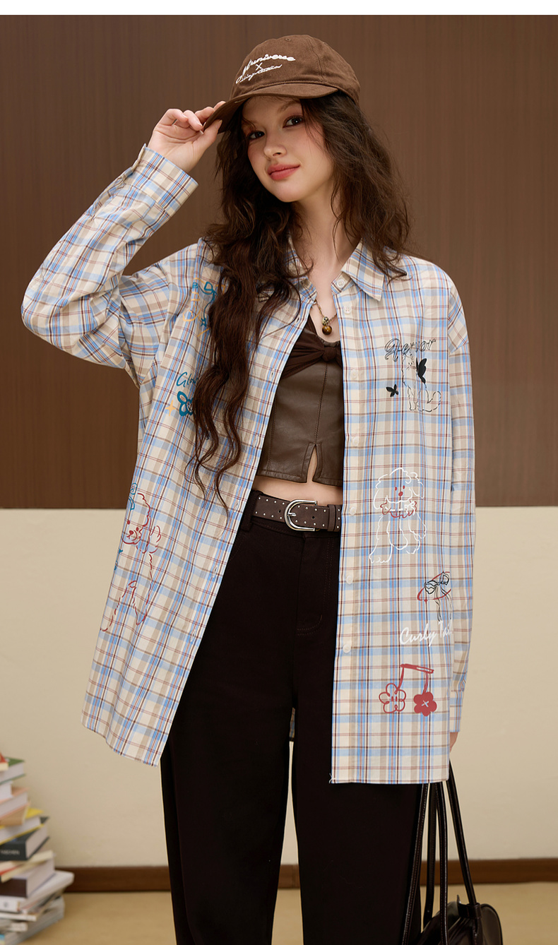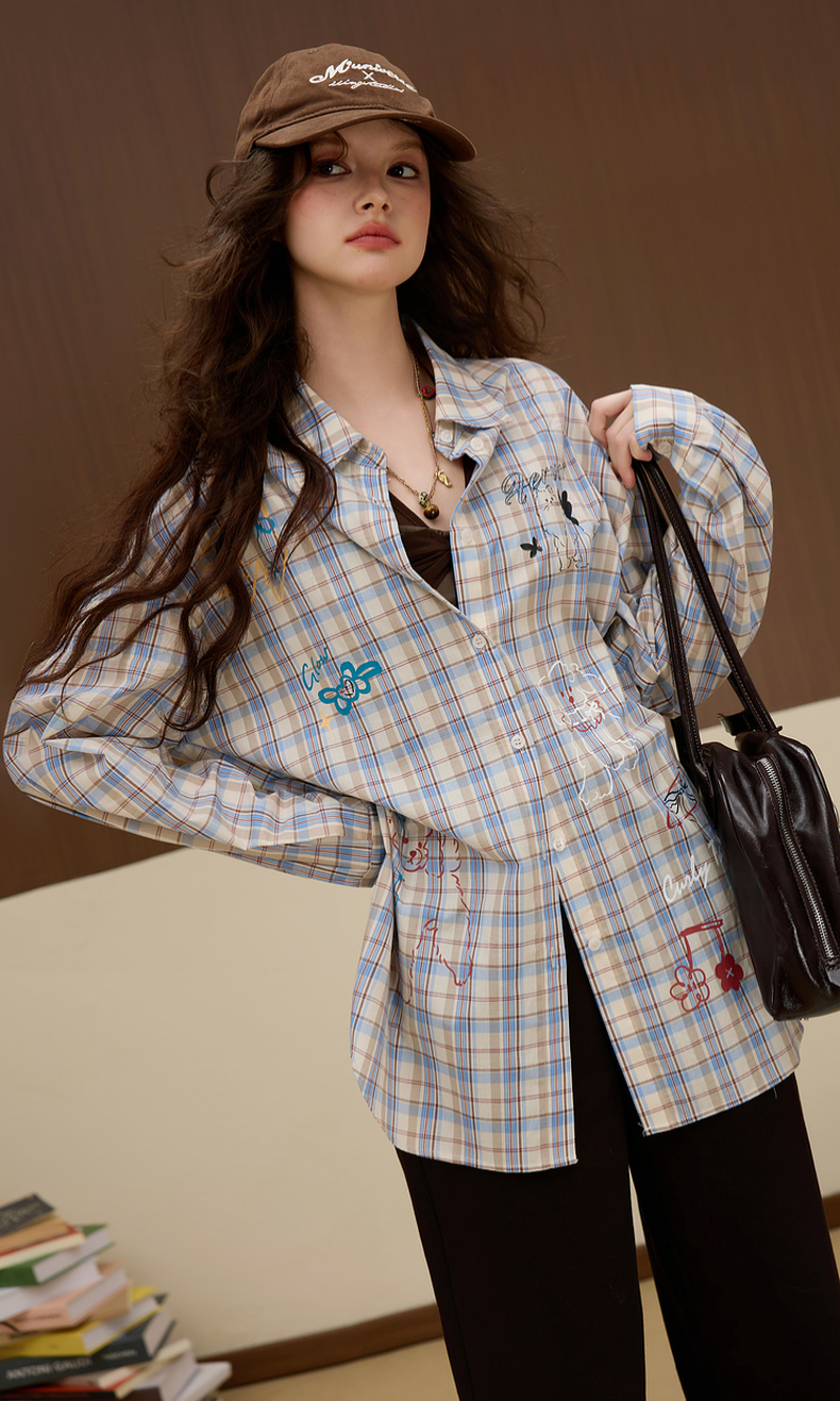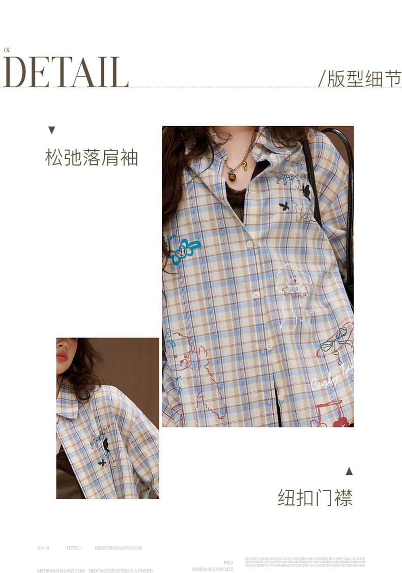 【100棉】三彩独醒2025秋季新款印花格纹衬衫长袖翻领上衣宽松F