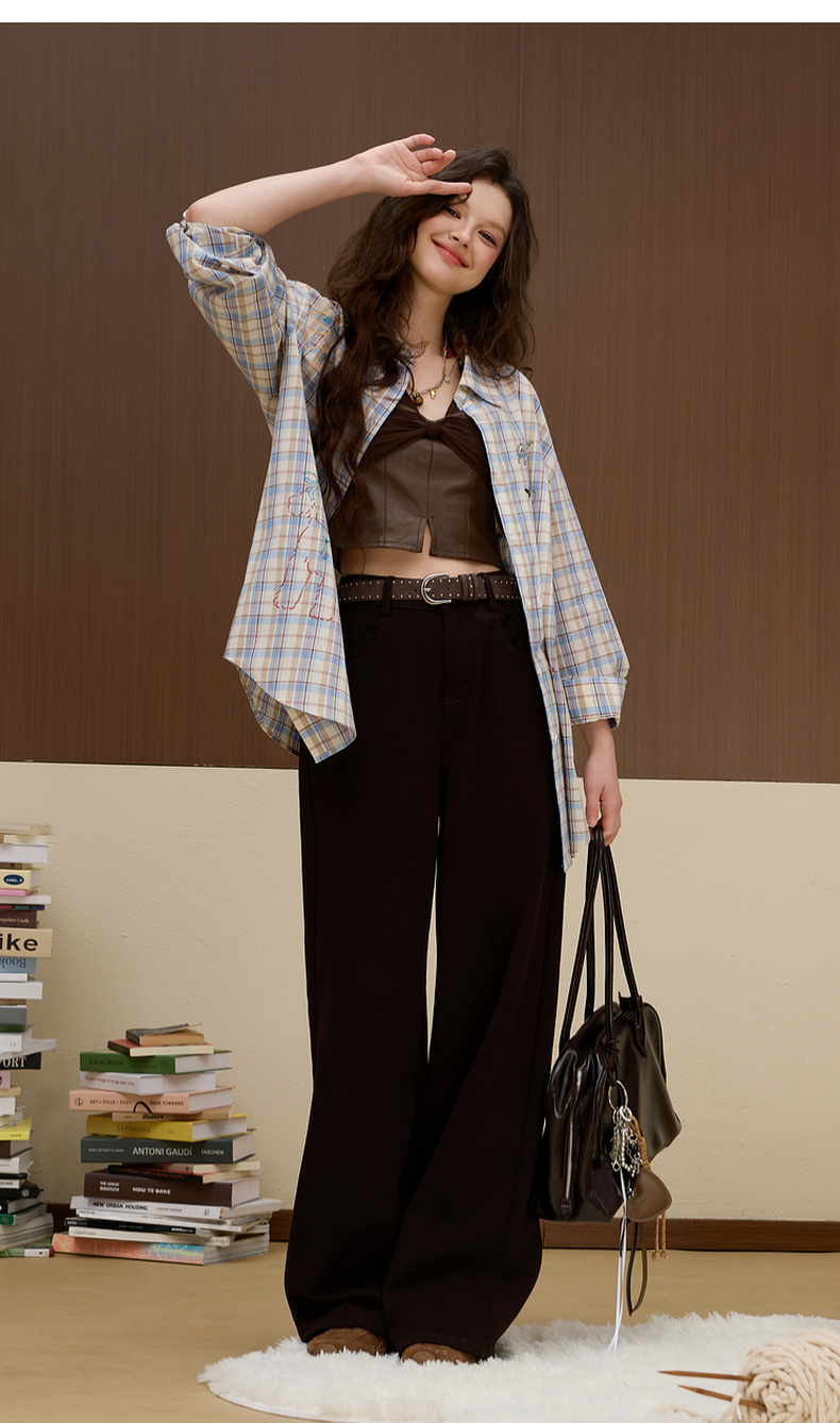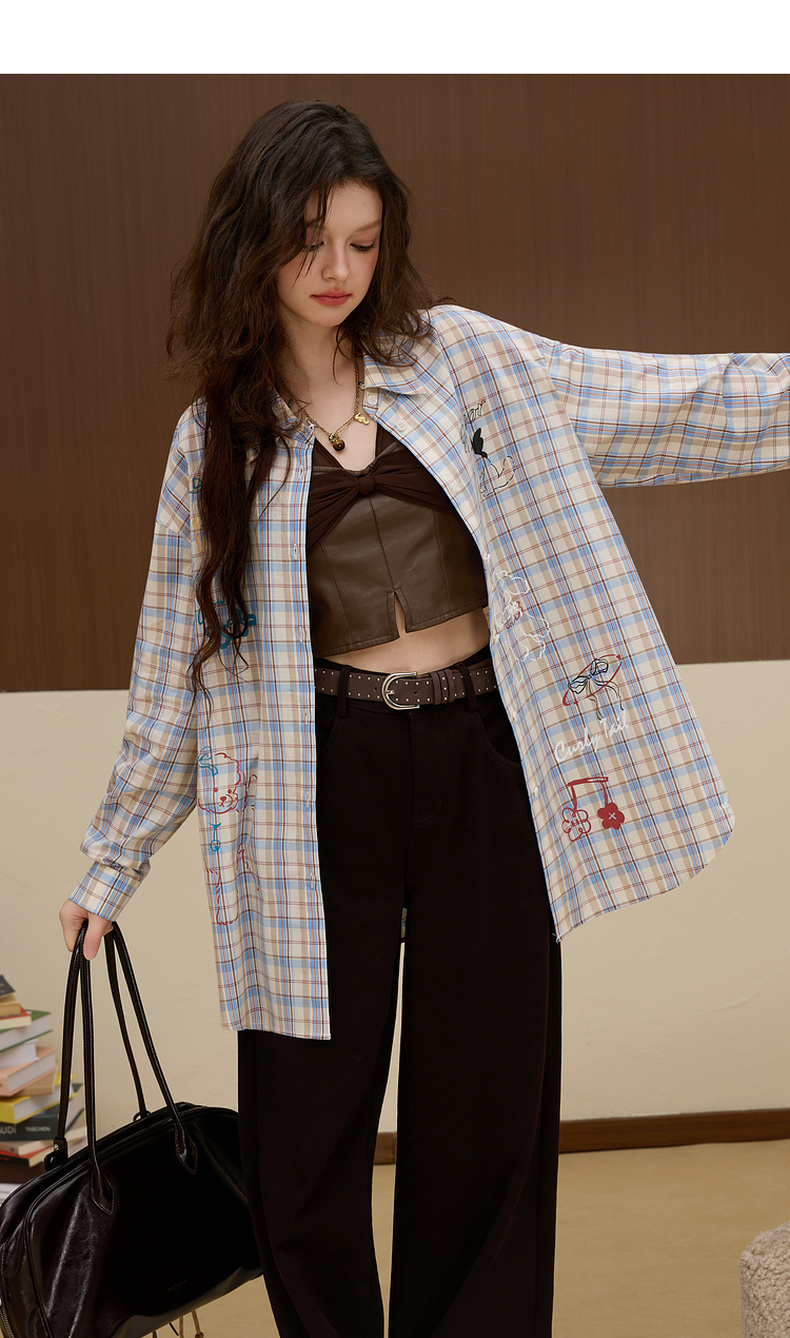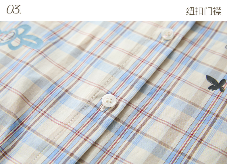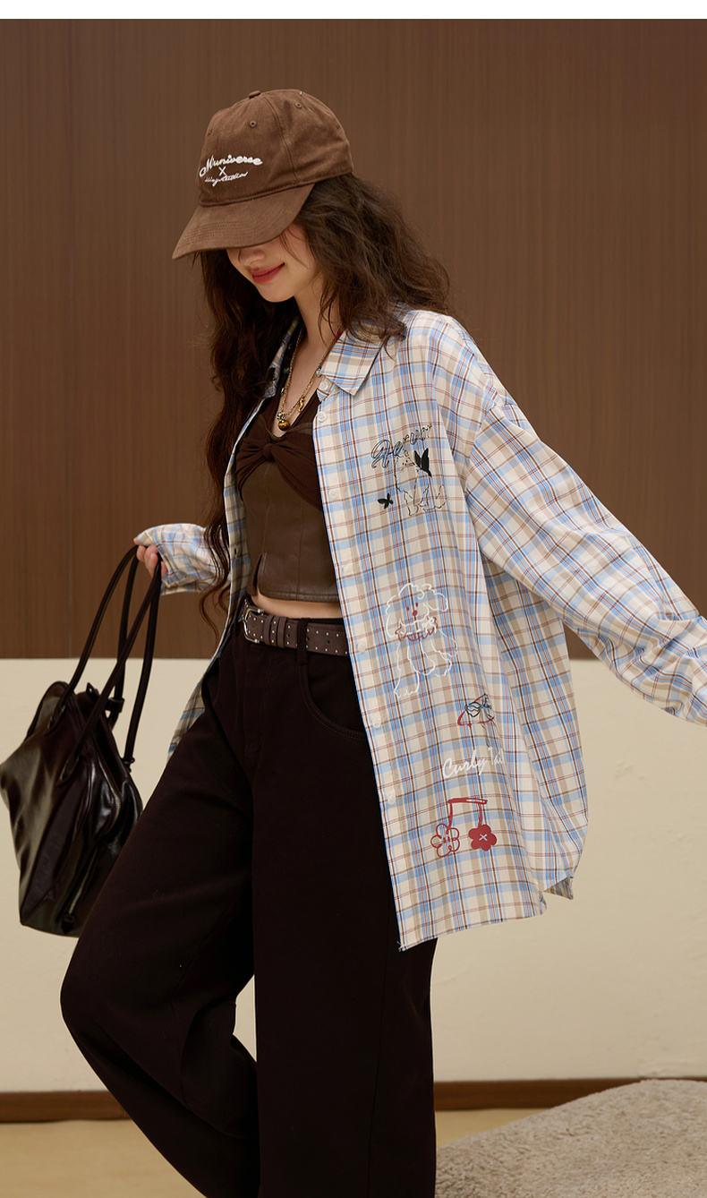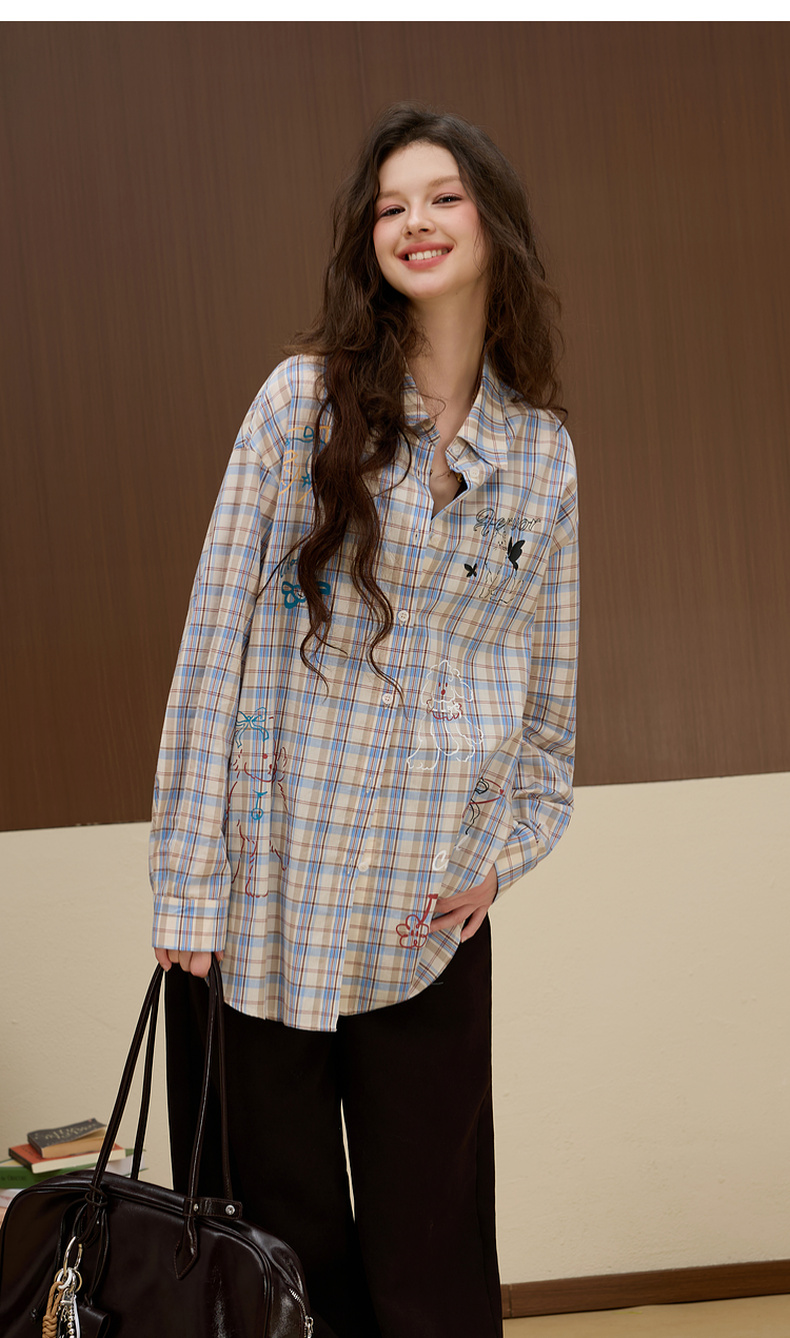【100棉】三彩独醒2025秋季新款印花格纹衬衫长袖翻领上衣宽松F