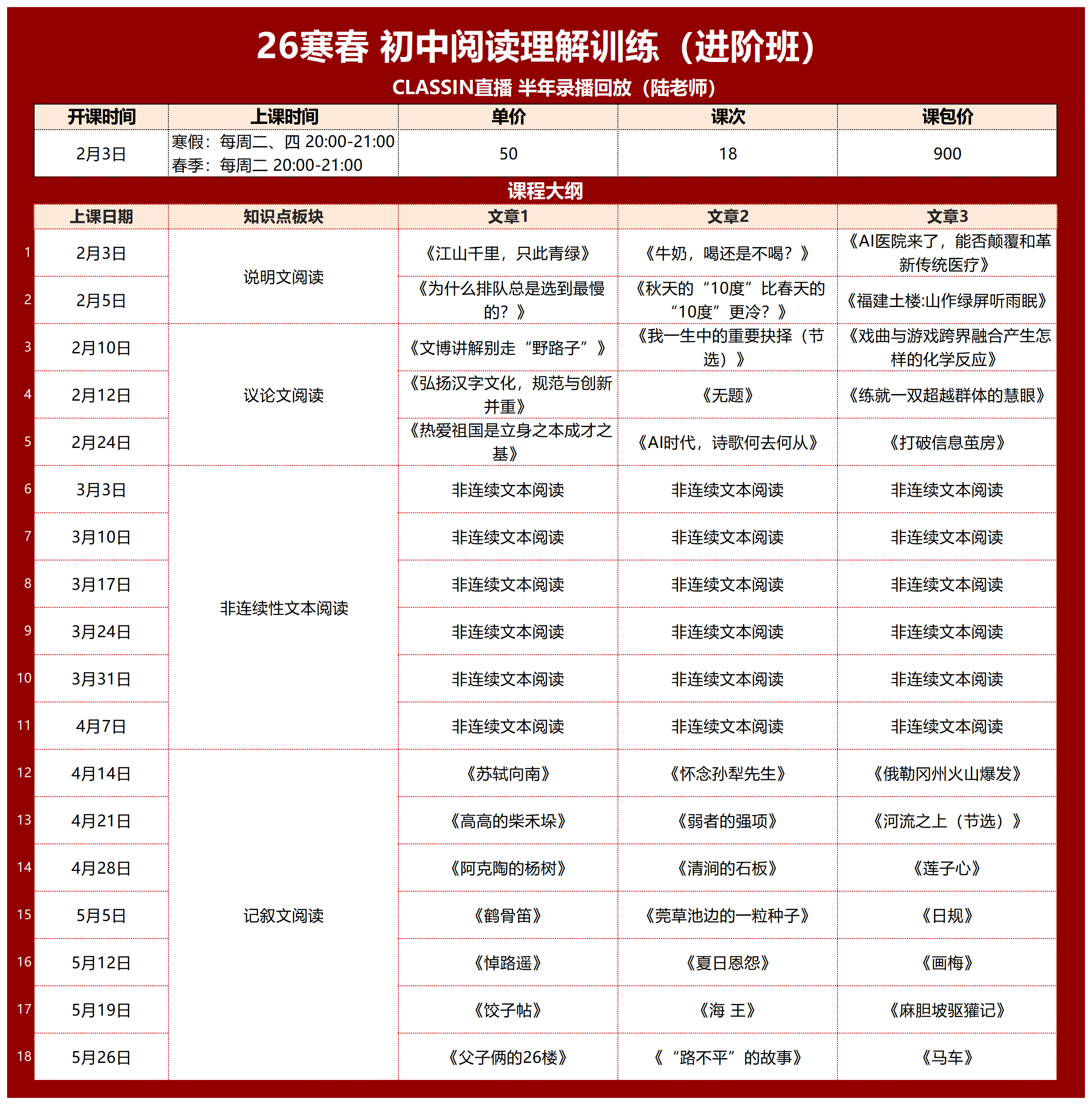 根据初中不同阶段的特性、精选各牛校考试中的阅读理解真题。每节课先讲解初中阶段和中考中的常考题型,总结答题技巧,答题格式和所包含的知识点,然后再配以三篇阅读理解真题加以训练,让学生彻底掌握阅读理解的答题方法,理解作者的真实情感,知道如何规范作答,有哪些答题标准词,有哪些得分点,目标做到不扣分或者少扣分