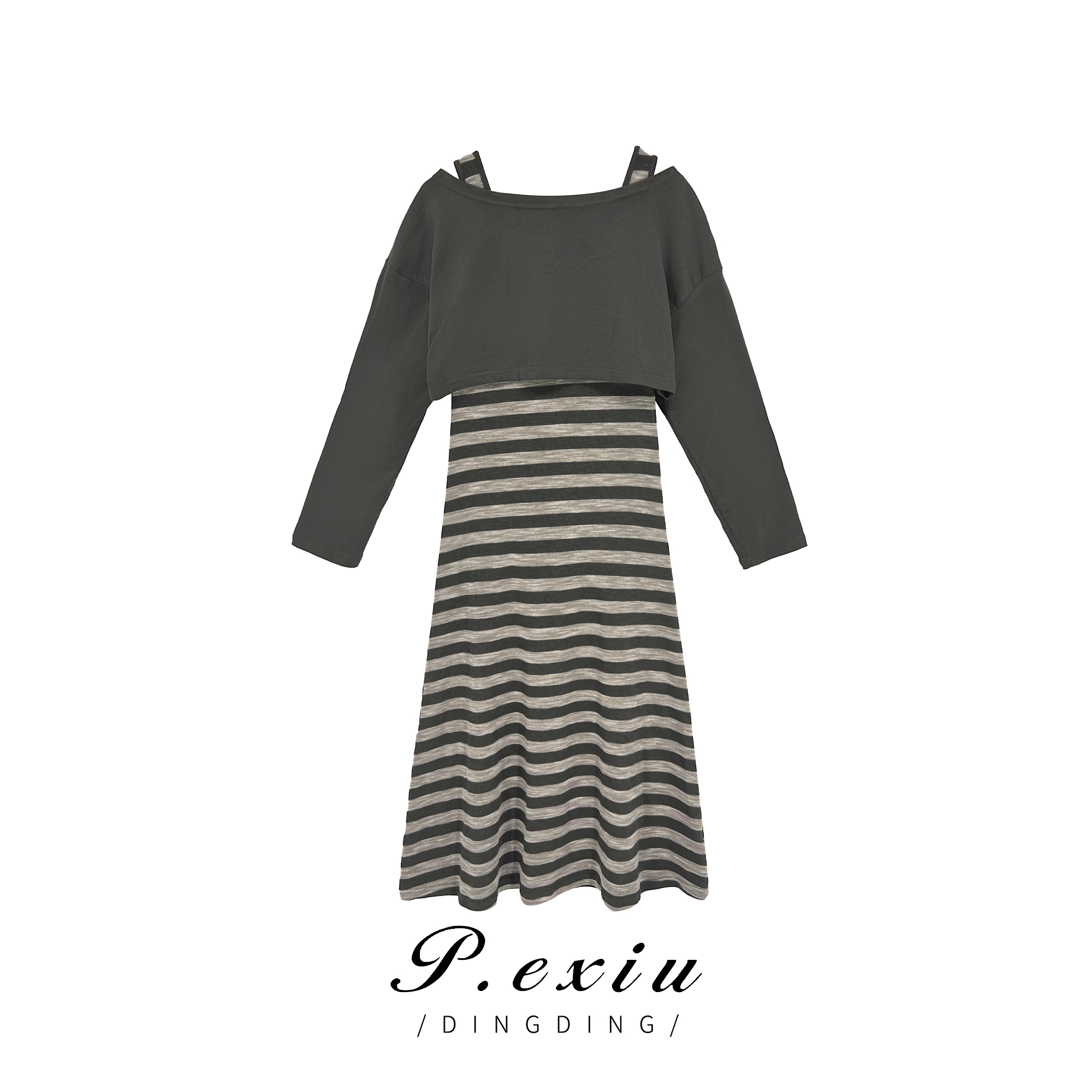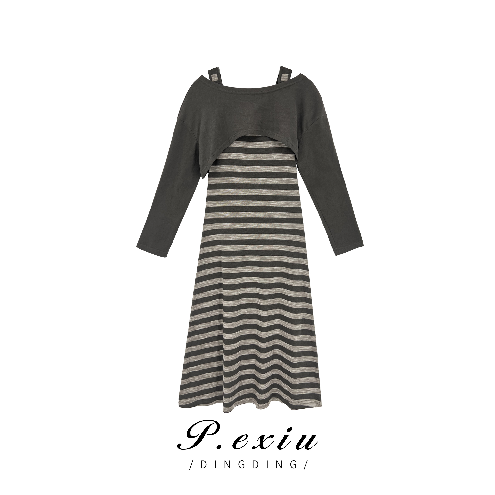 04-6潘依绣丁丁宠粉秋季休闲减龄长袖披肩条纹背心连衣裙两件套89219