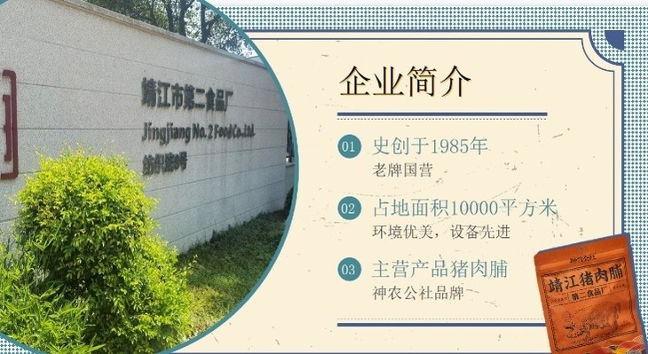 靖江市第二食品厂,一家集生产、研发、销售于一体的综合性食品加工企业 ✅2009-2017年获泰州市农业规模龙头的称号✅2012-2015年荣获上海市场畅销金品品牌 ✅2020年获得国家诚信企业 ✅在先锋杯安全赛中被评为先进单位 ✅国家质检局重点推荐的产品 与国内知名品牌百草味,一扫光,薛记,雪海梅乡,戴永红,座上客,王小卤,华味亨,周黑鸭,吃货家和著名电商良品铺子、大润发等有着长期而密切的合作。
