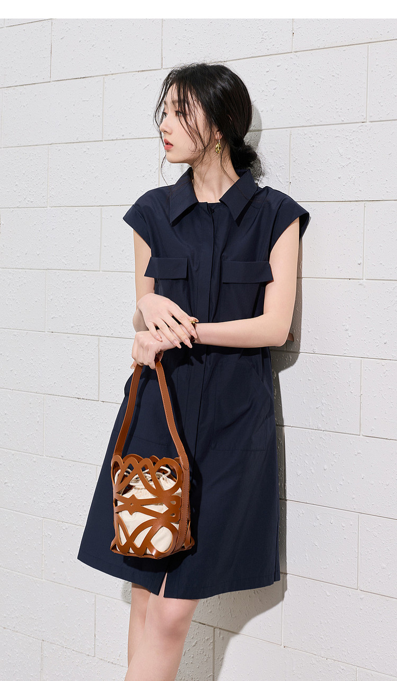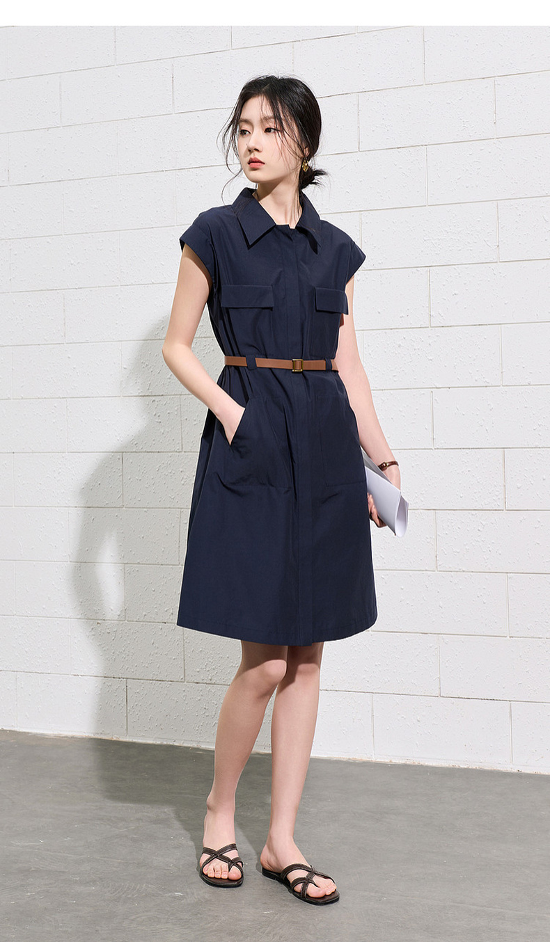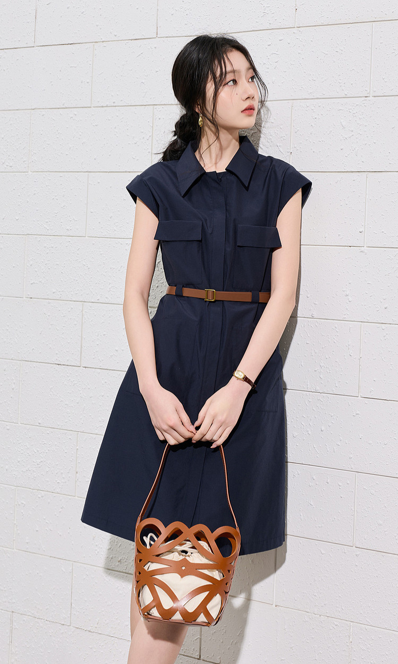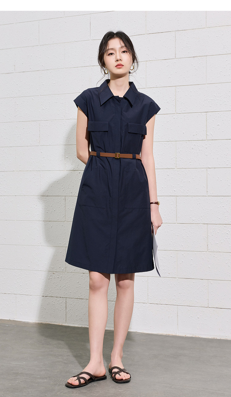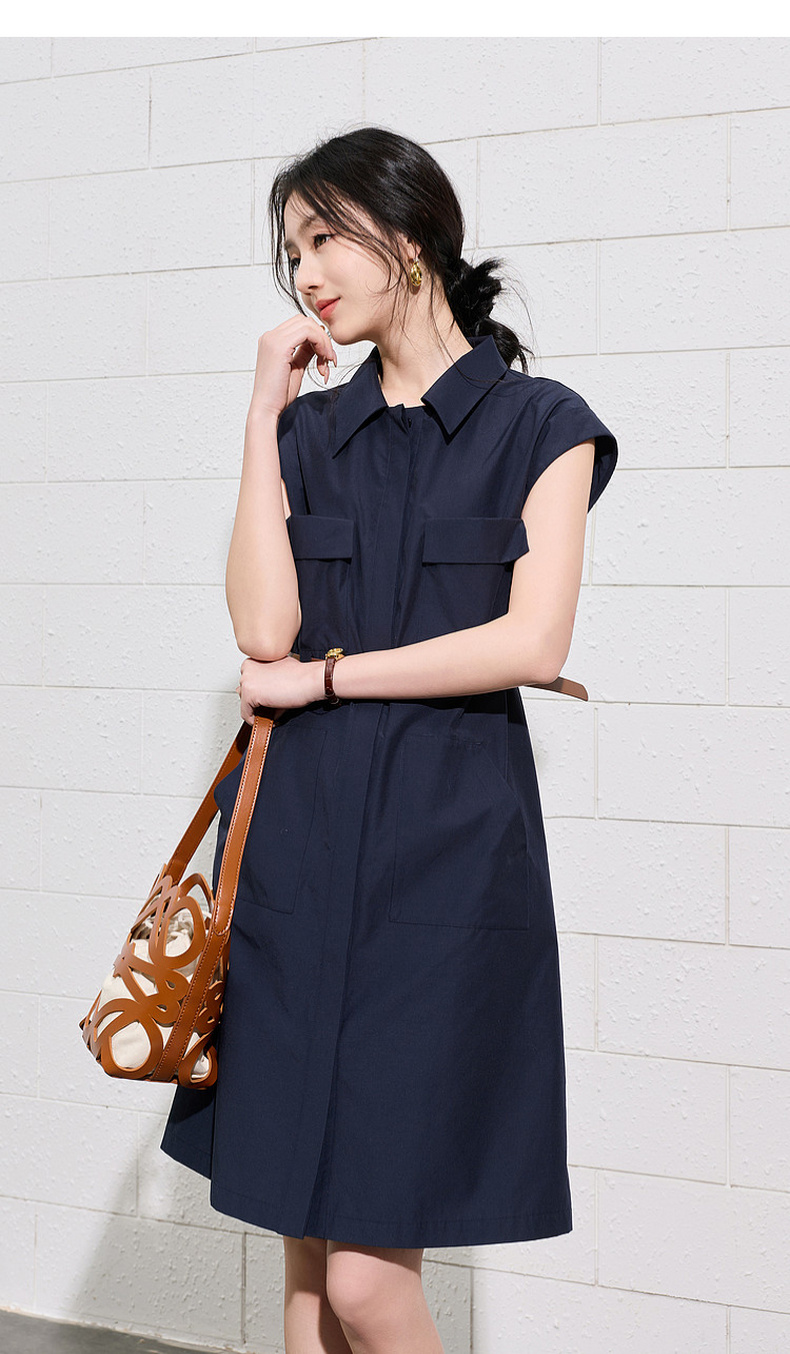 三彩2026夏季新款休闲连衣裙翻领口袋直筒裙中裙通勤S