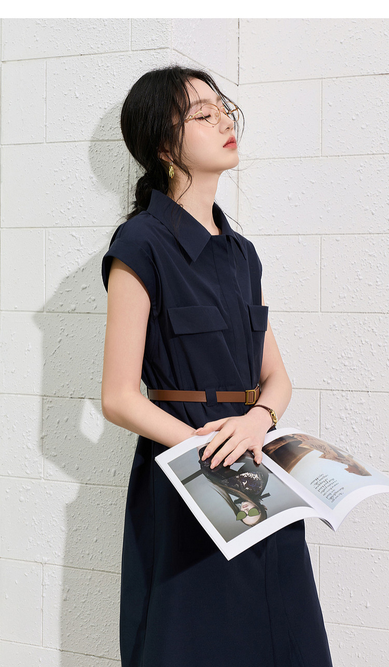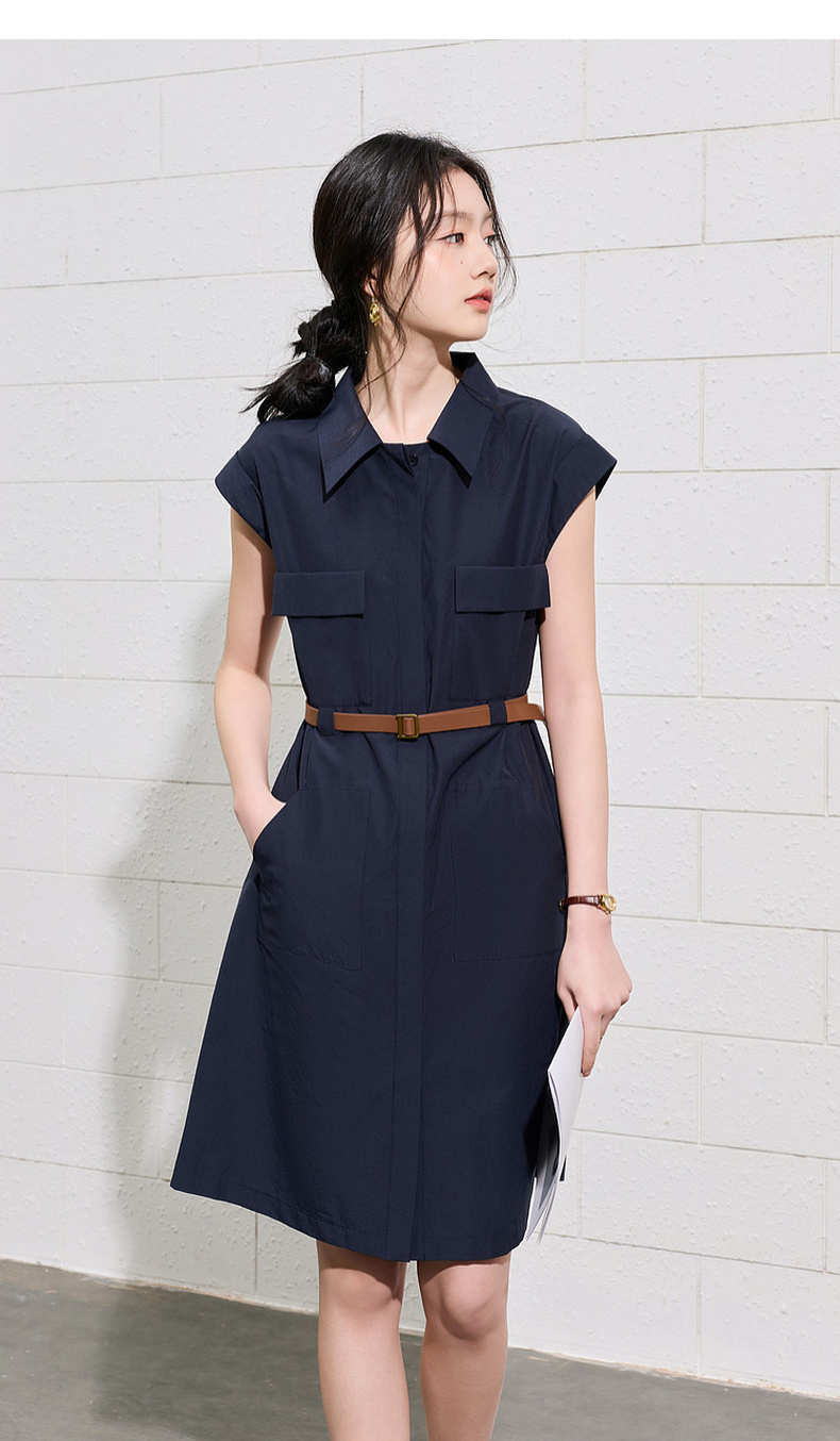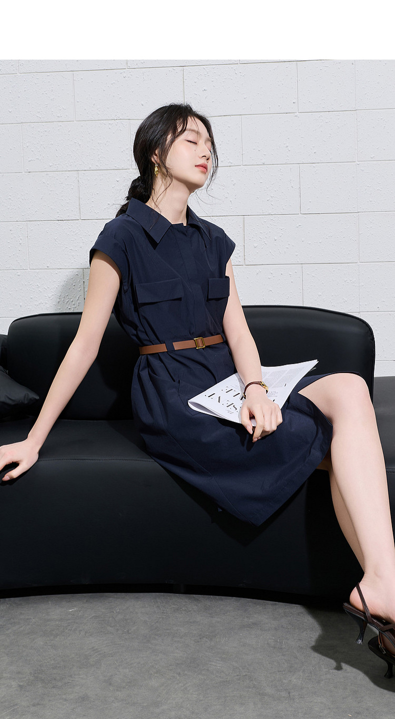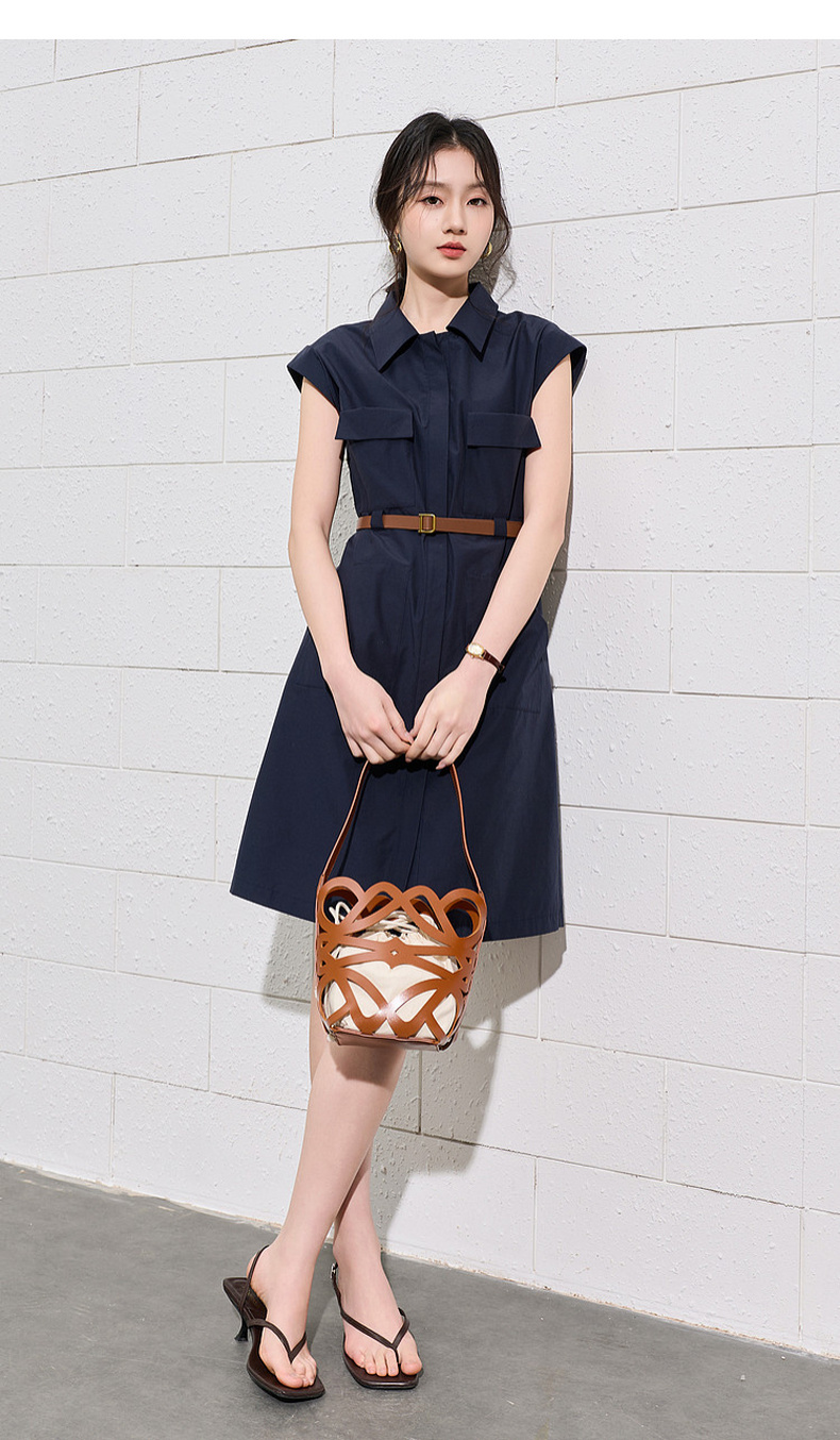 三彩2026夏季新款休闲连衣裙翻领口袋直筒裙中裙通勤S