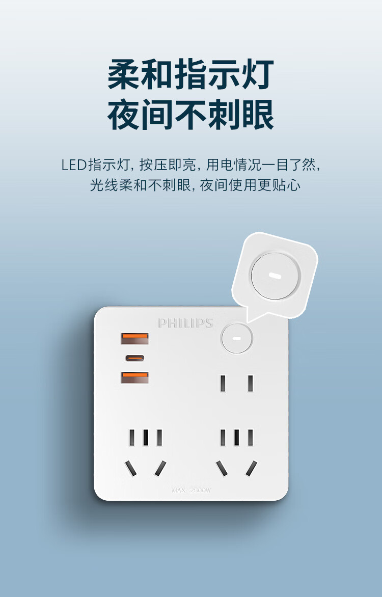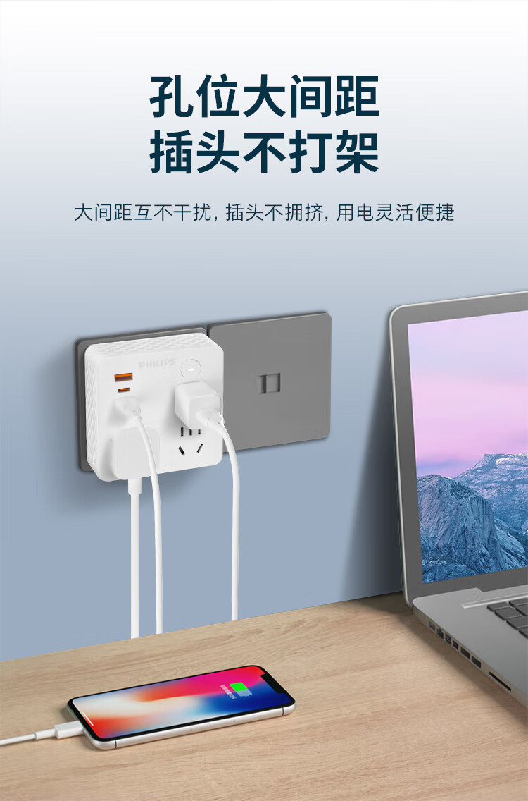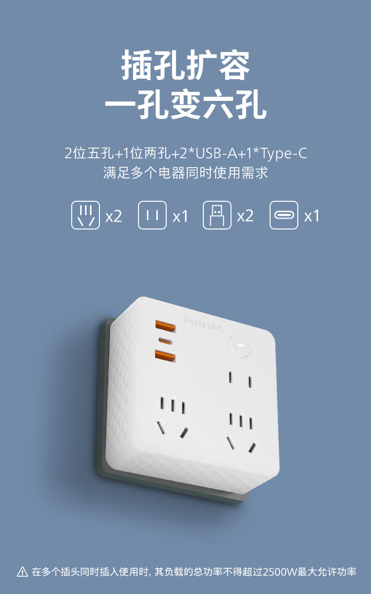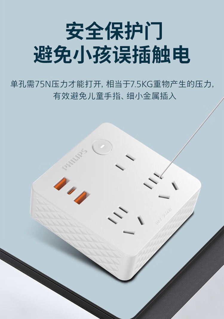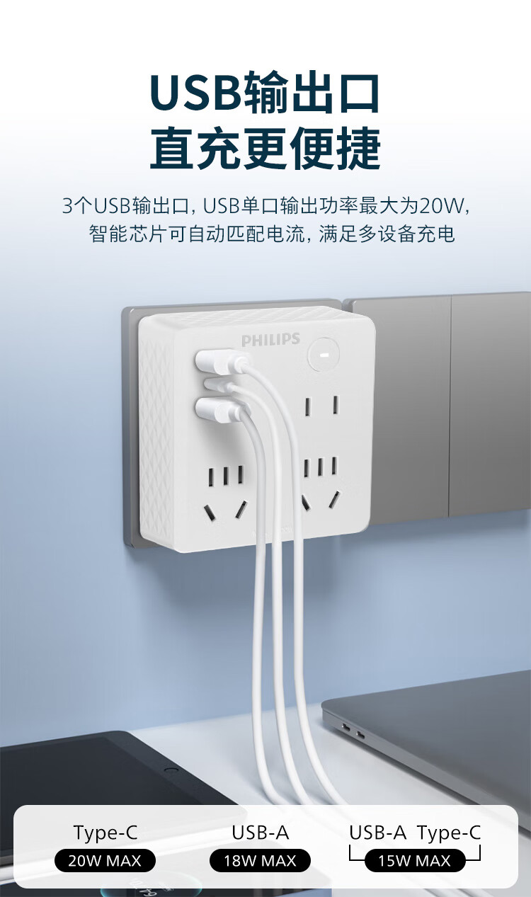 飞利浦(PHILIPS)排插插座86盒型桌面插座2*5孔+1*2孔+1*Type-C+2*USB-A组合孔USB充电SPB8031W/93