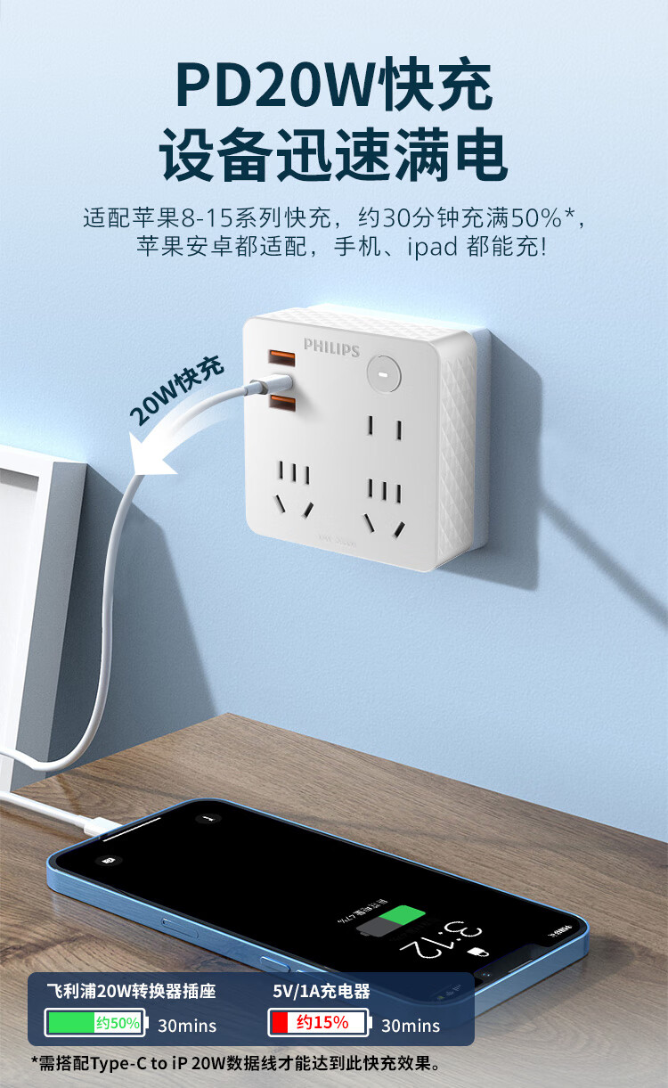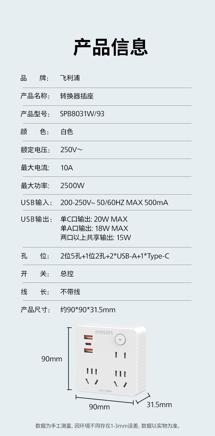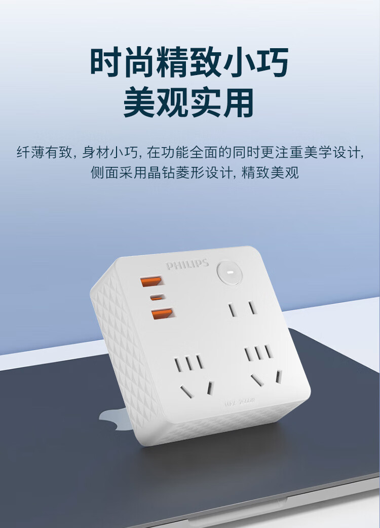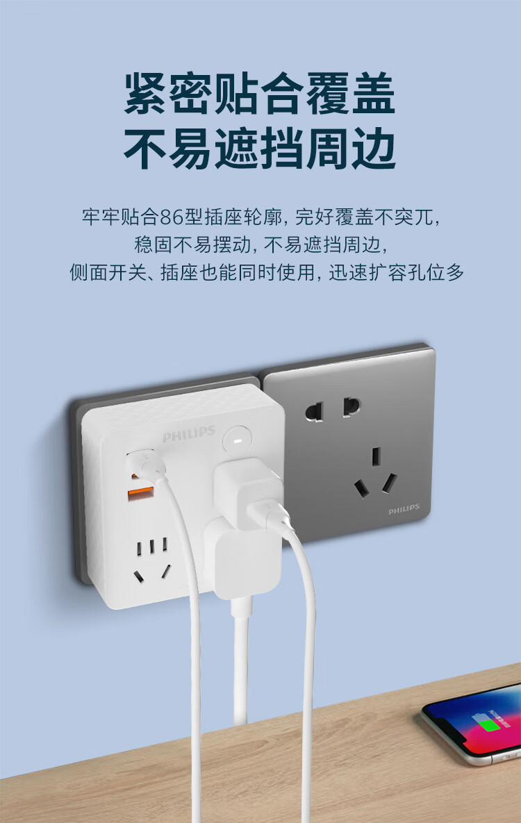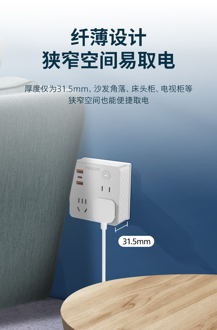 飞利浦(PHILIPS)排插插座86盒型桌面插座2*5孔+1*2孔+1*Type-C+2*USB-A组合孔USB充电SPB8031W/93