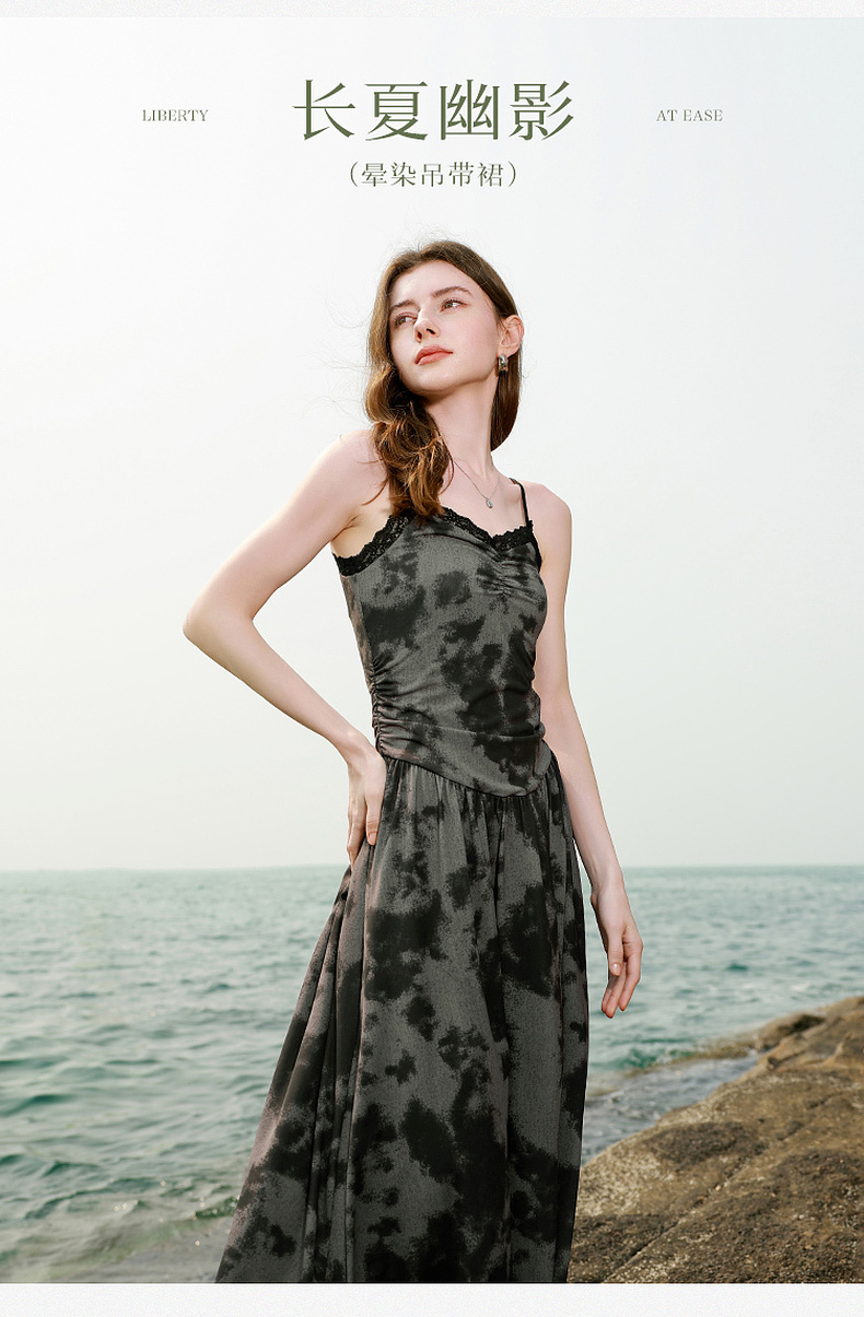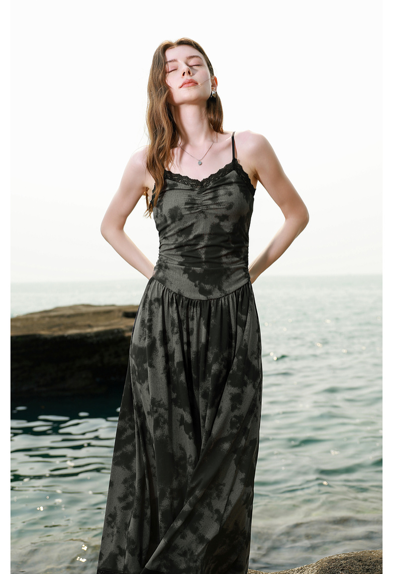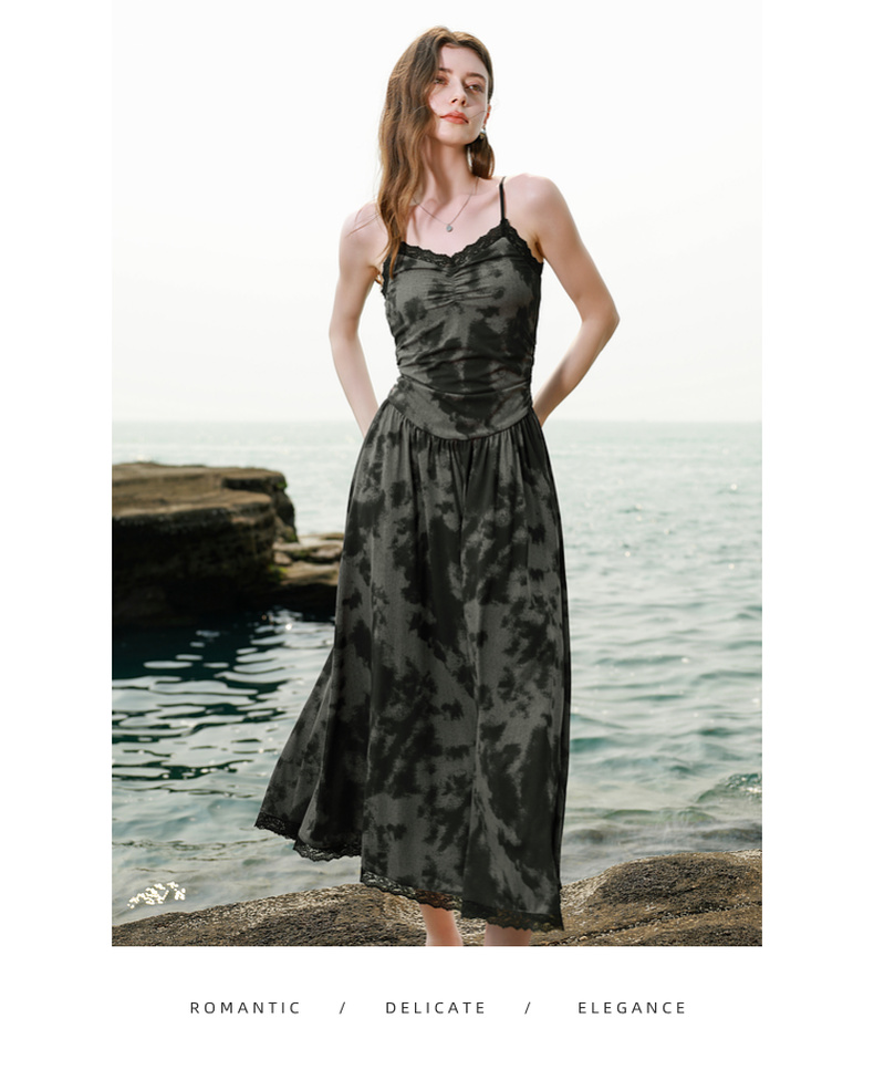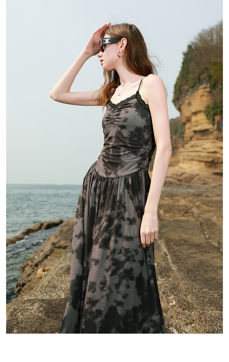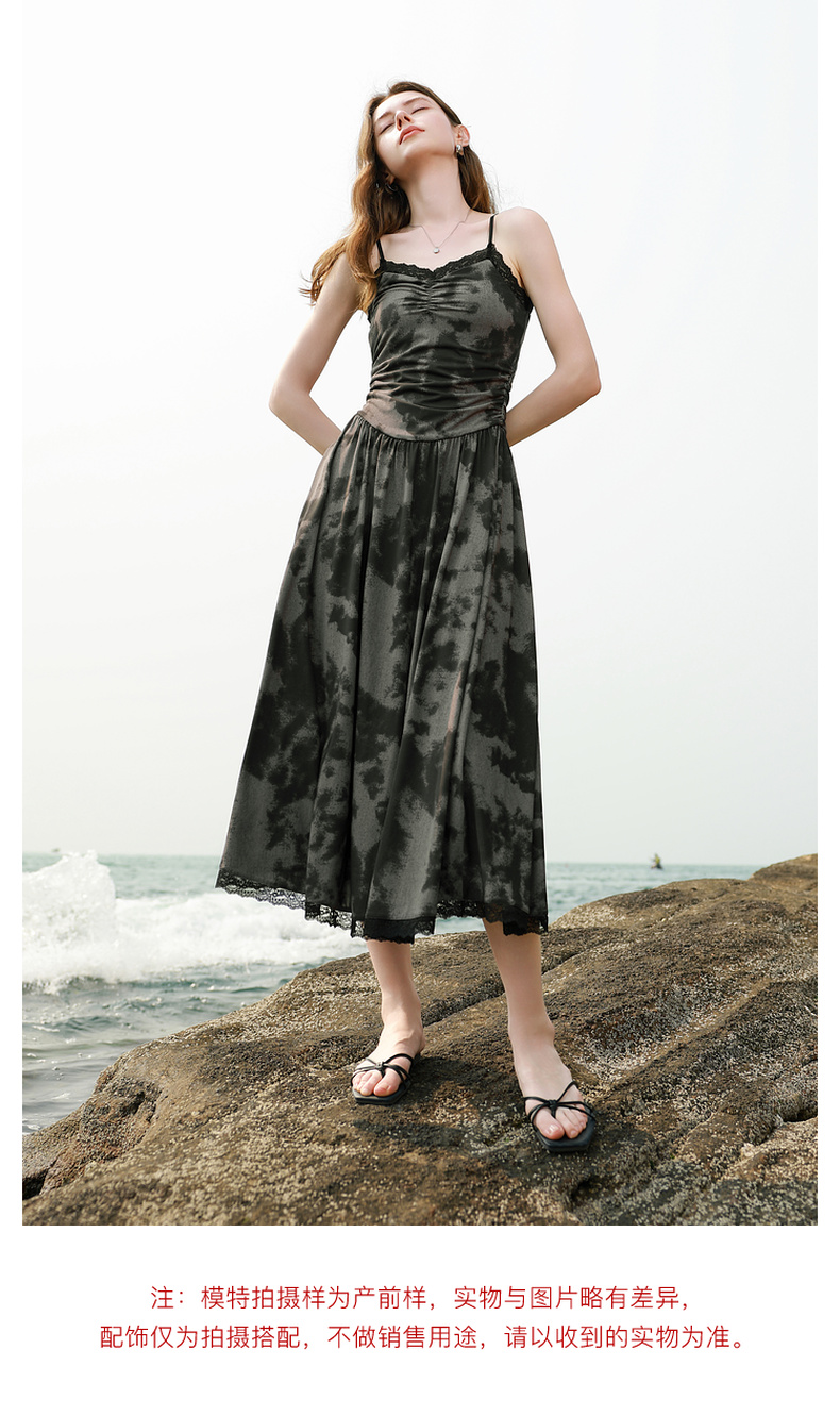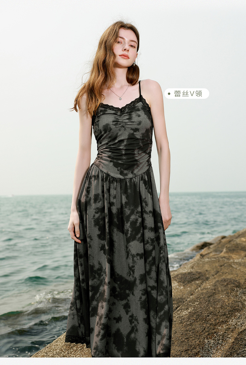 三彩独醒2025夏季新款晕染吊带连衣裙蕾丝V领收腰长裙度假F