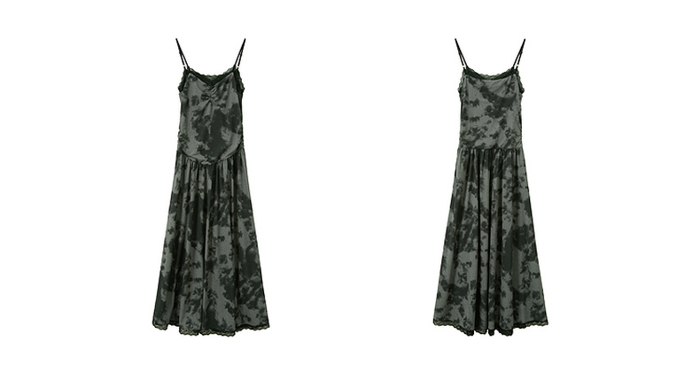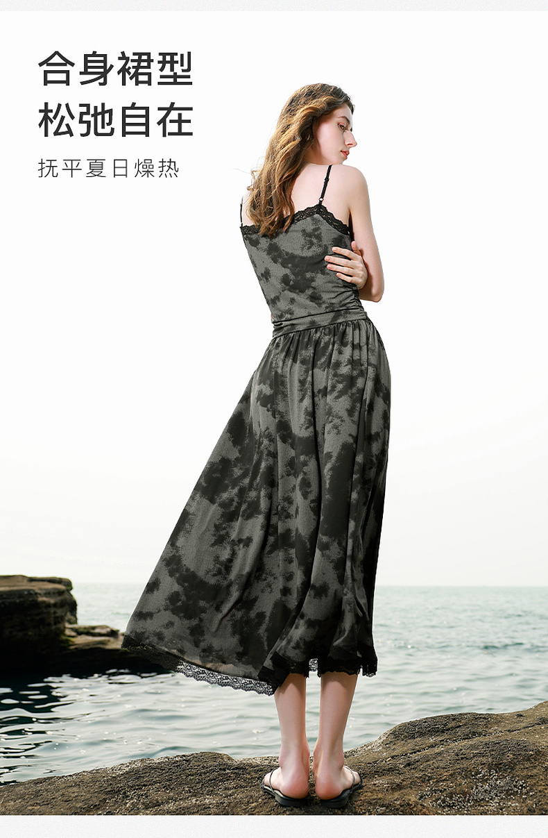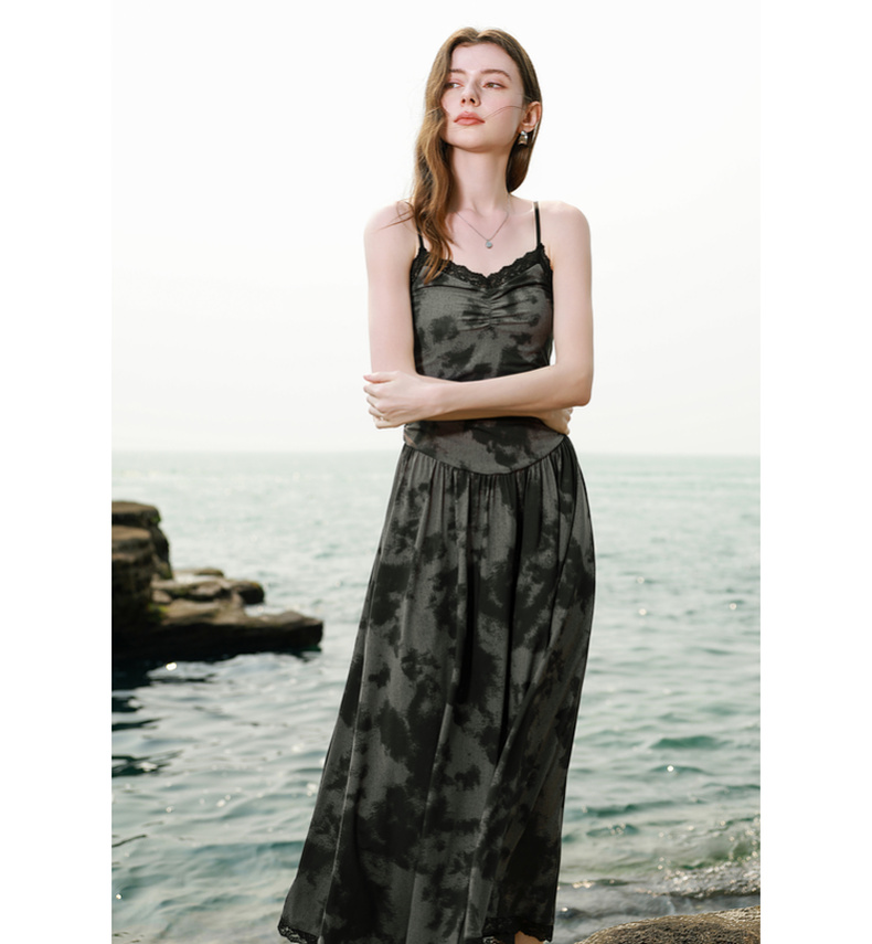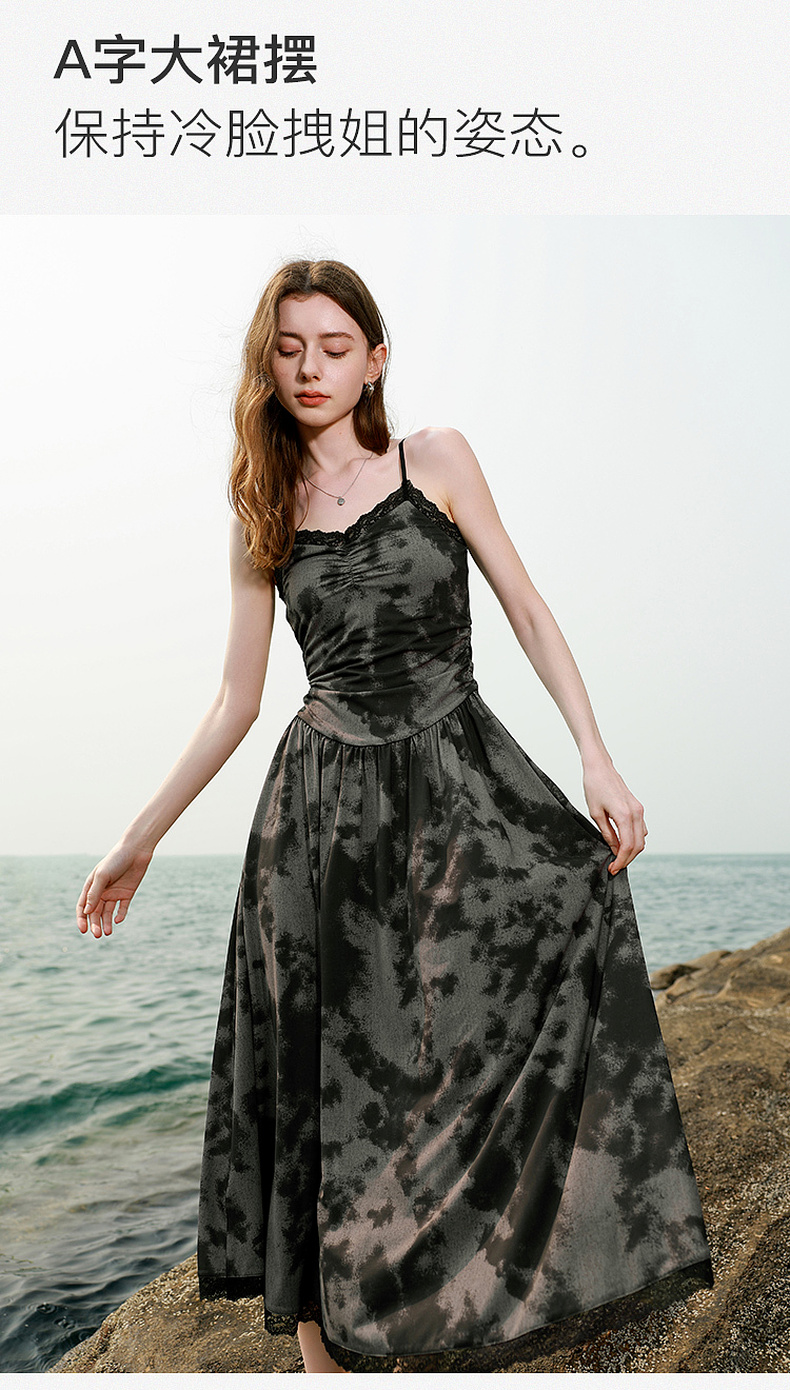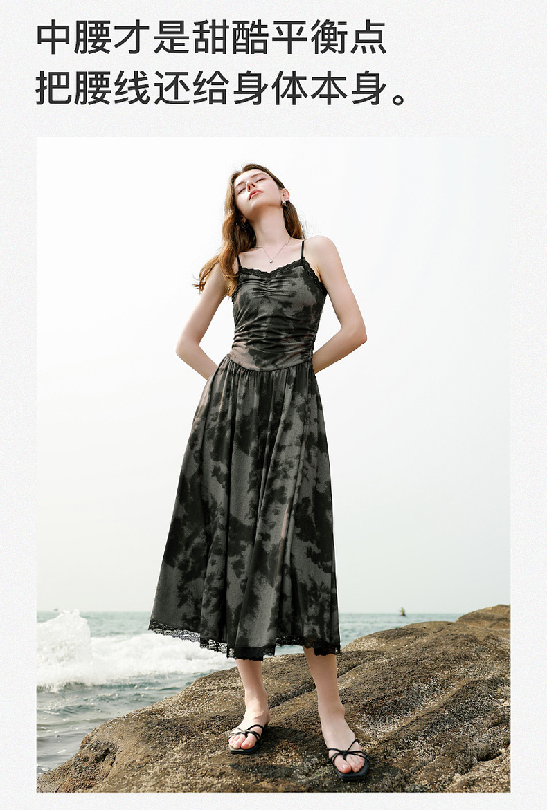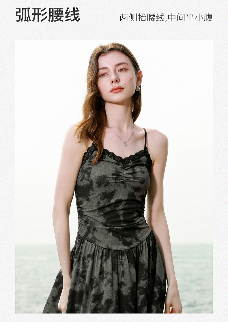 三彩独醒2025夏季新款晕染吊带连衣裙蕾丝V领收腰长裙度假F