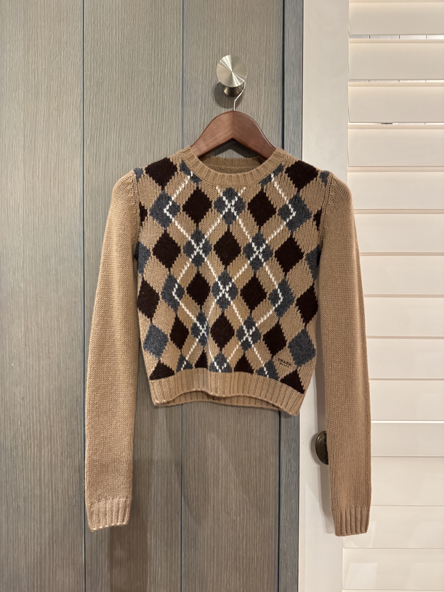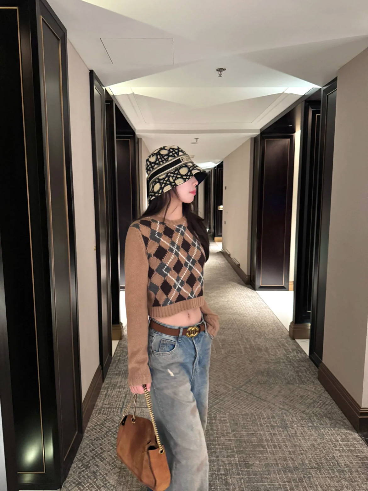 25年新款 美拉德色系菱格针织衫〰️复古感拉满的菱格纹。配色温柔又高级💕针织质感细腻软糯,单穿内搭都很绝,秋日氛围感直接拿捏。穿上就是时髦精。短款版型 ,拉长比例线条👏定制纱线🔗毛感柔软不扎身,码数SML