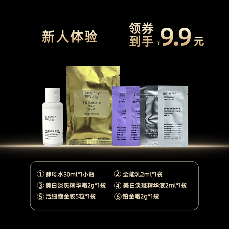 新人体验2:樱花水30ml*1小瓶+全能乳2ml*1袋+美白淡斑精华霜2g*1袋+美白淡斑精华液2ml*1袋+活细胞金胶5粒*1袋+铂金霜2g*1袋