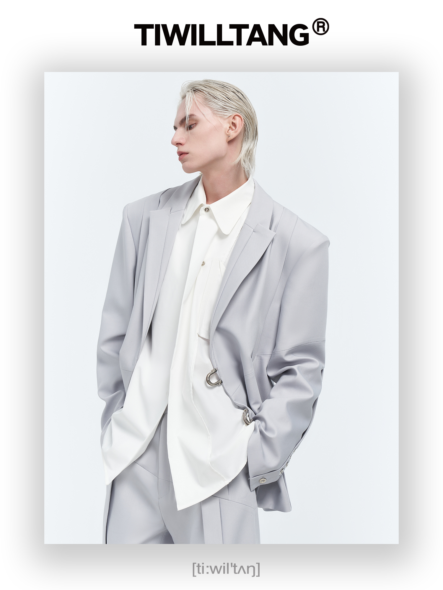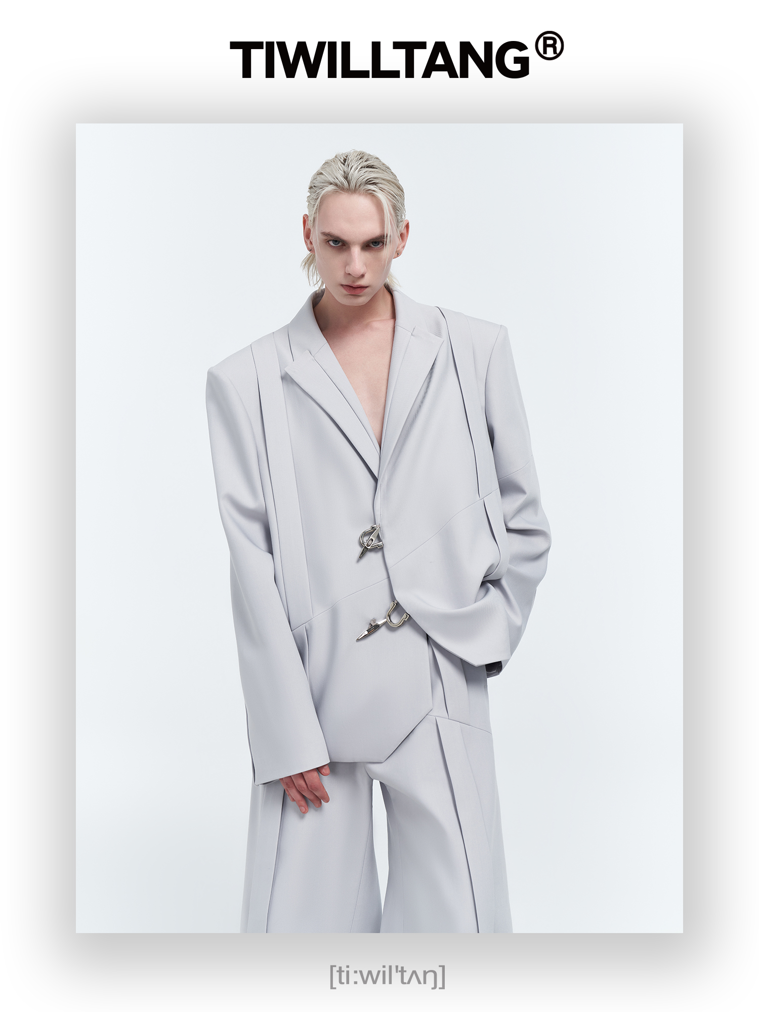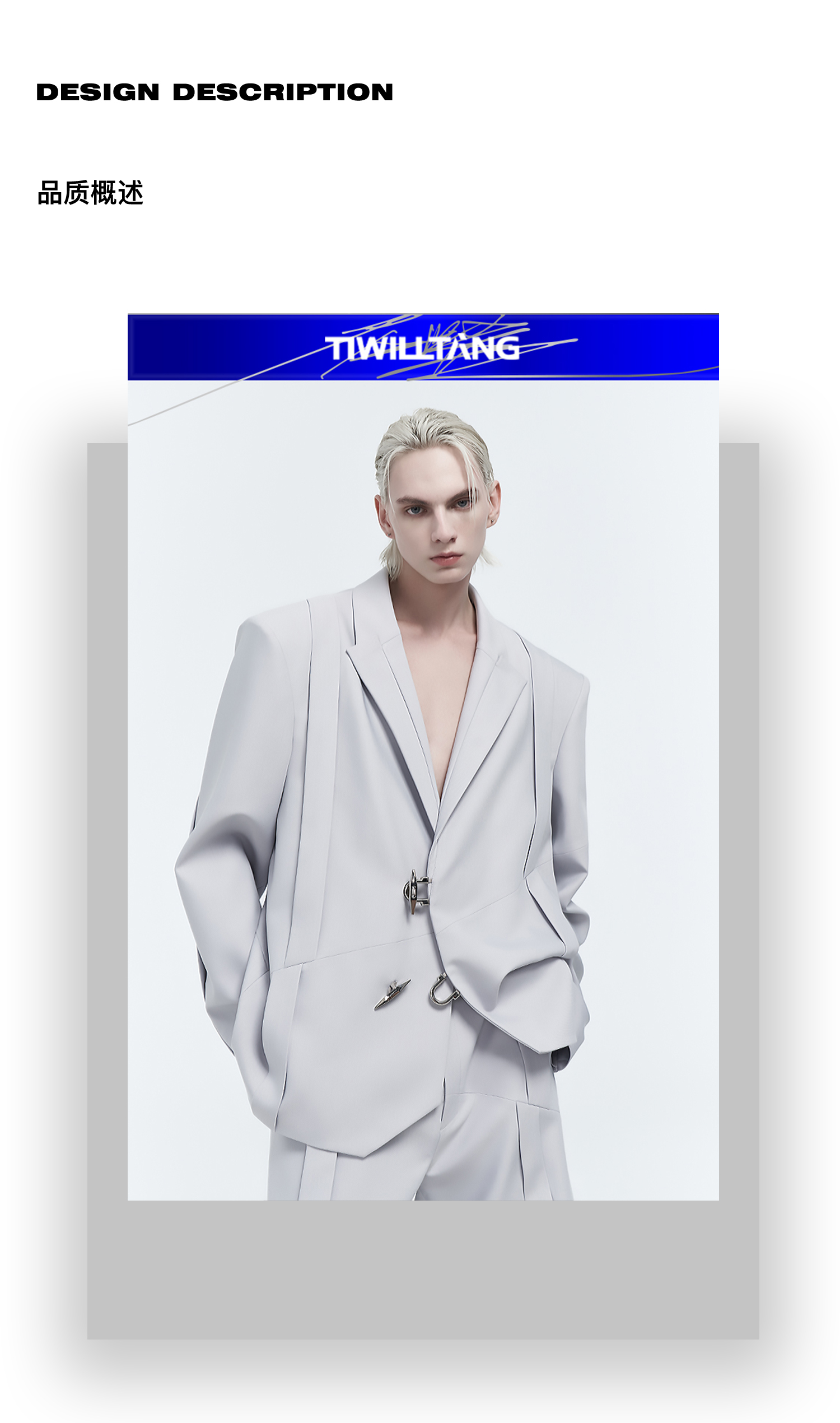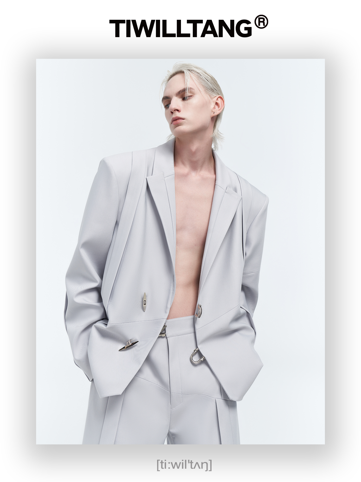 TIWILLTANG启世录“极世殿宇”高奢隽雅银灰色金属异型扣长袖西装