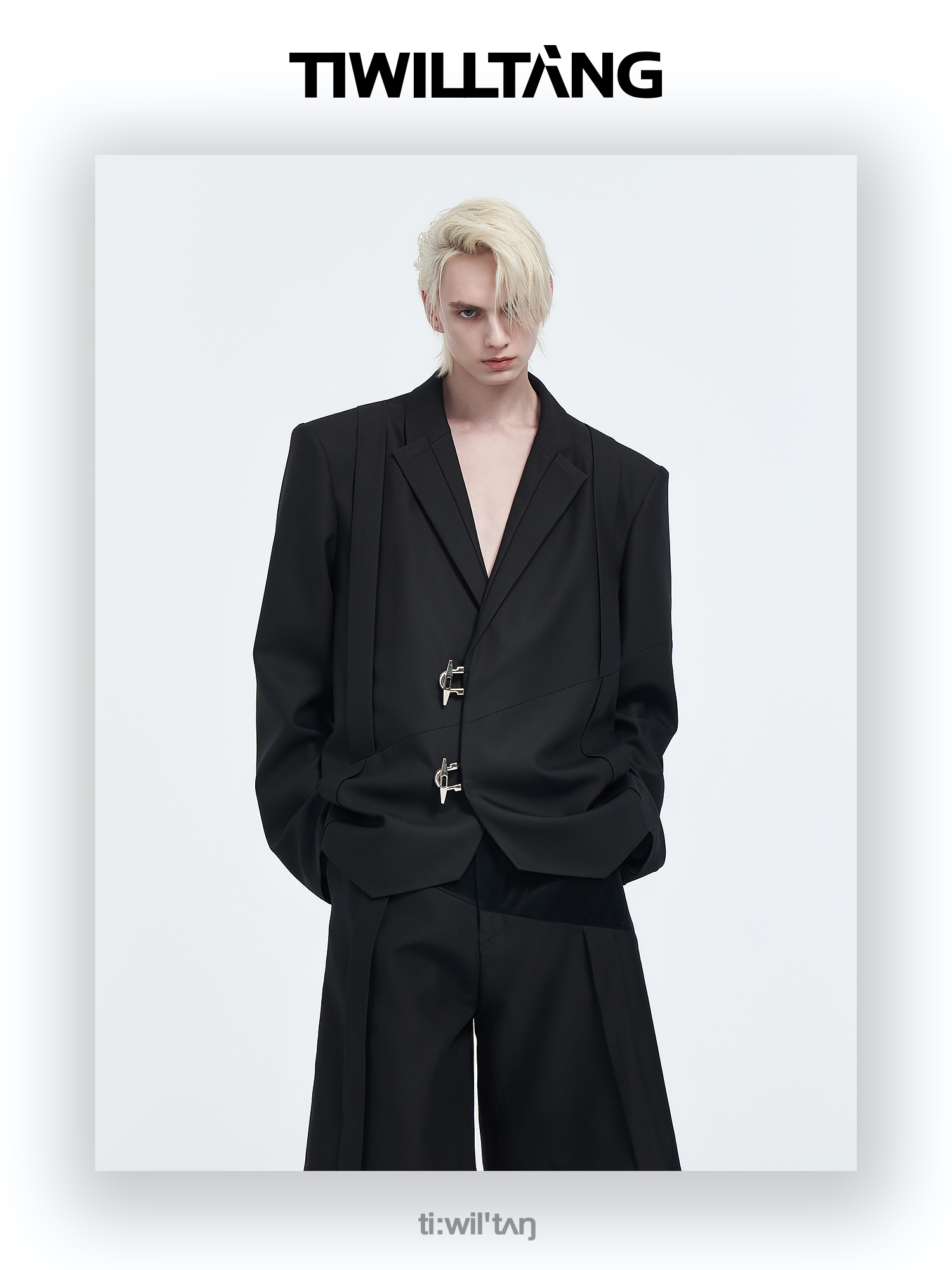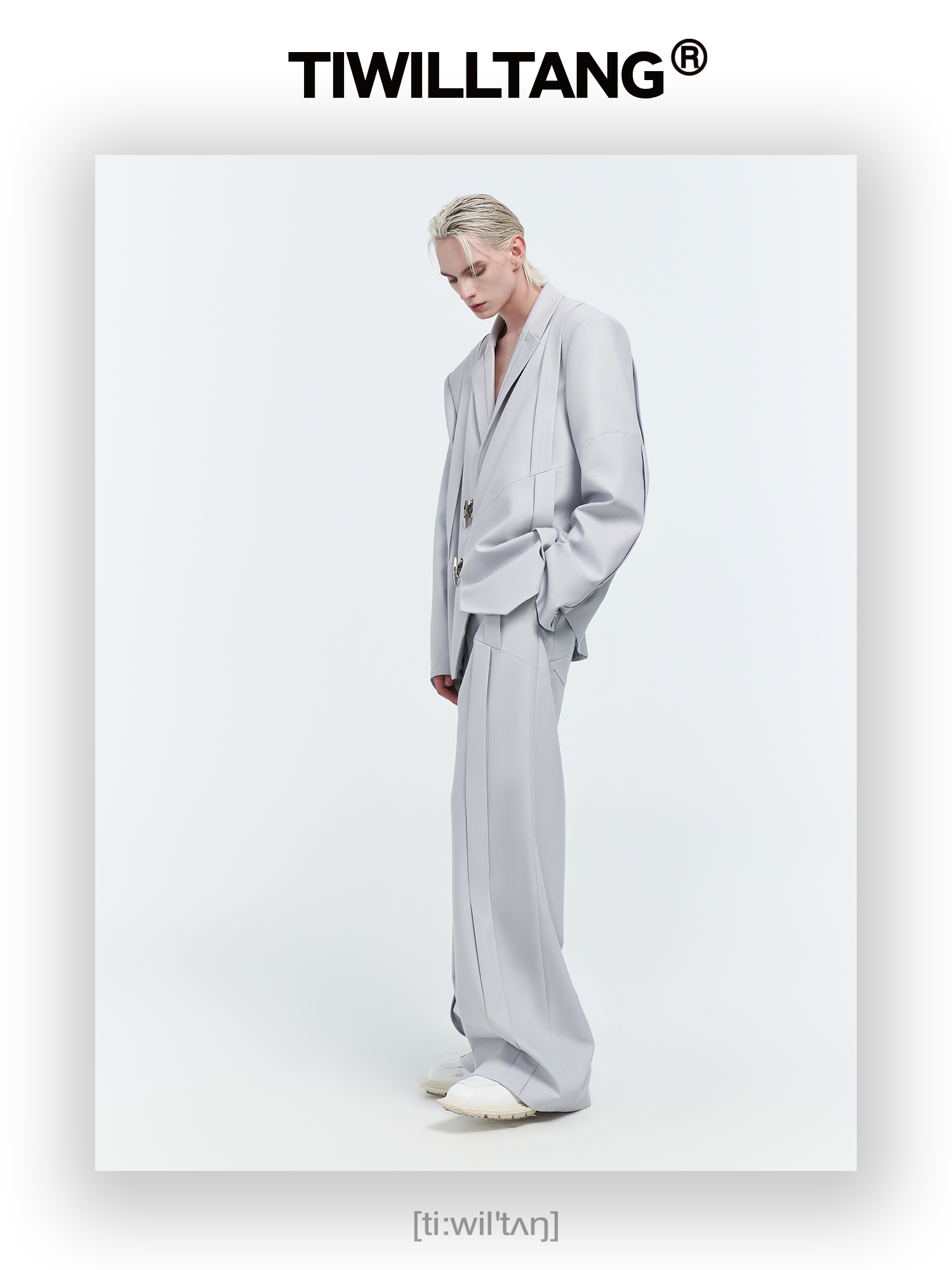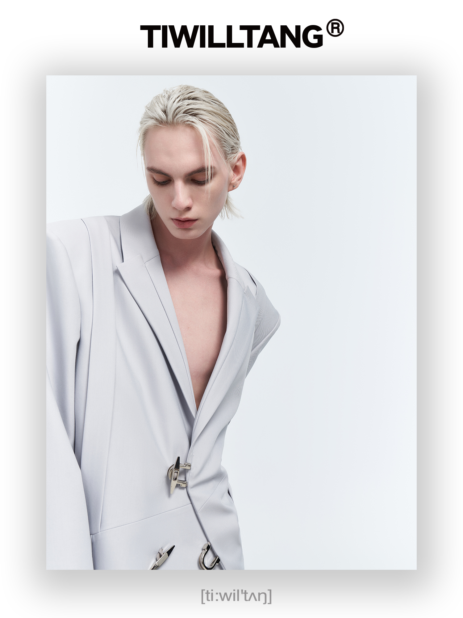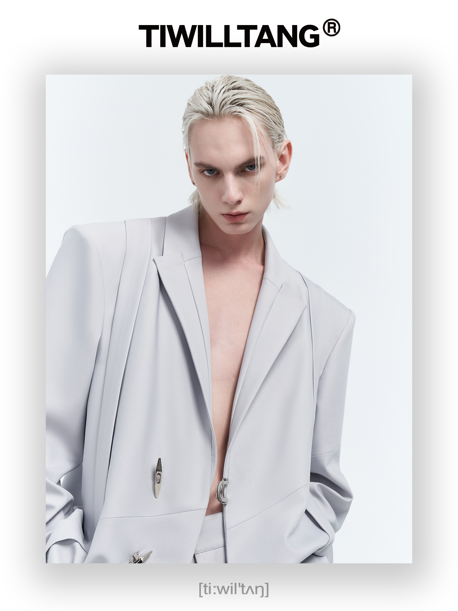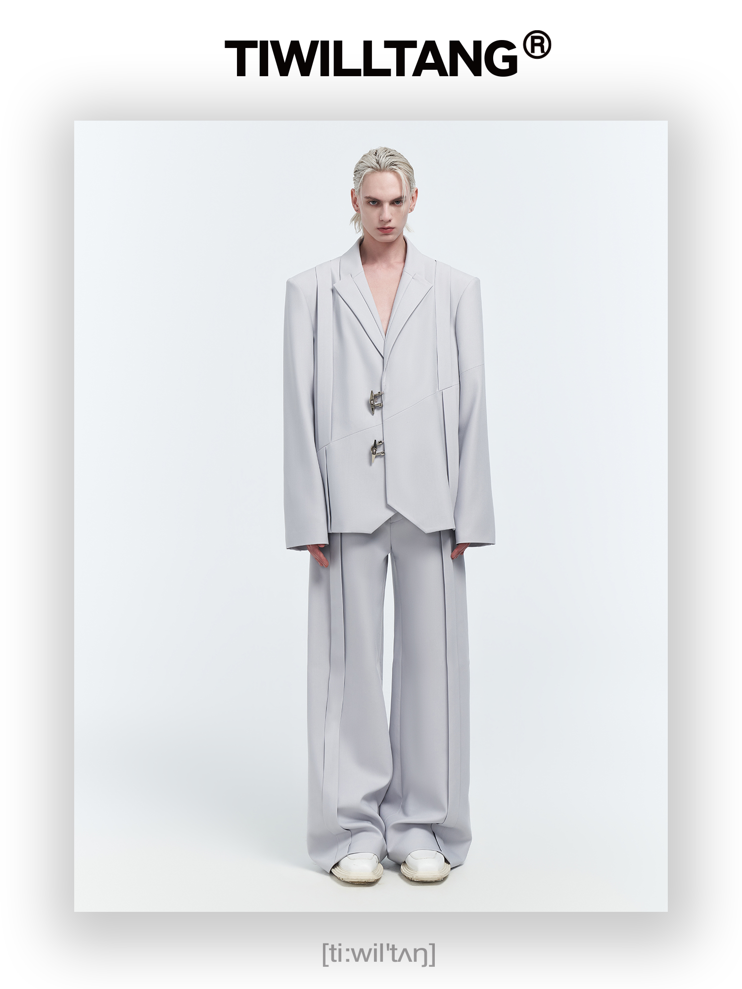 TIWILLTANG启世录“极世殿宇”高奢隽雅银灰色金属异型扣长袖西装