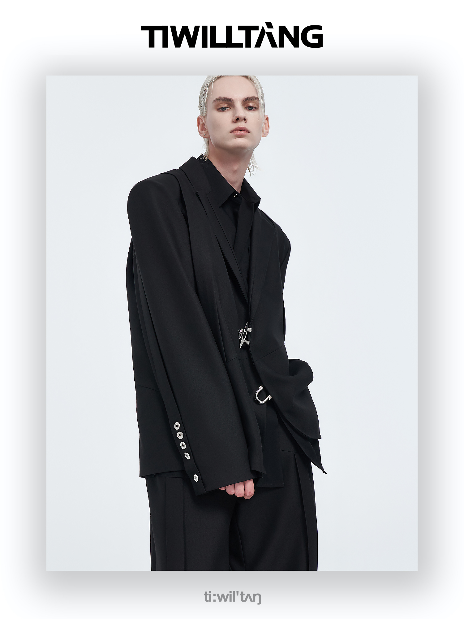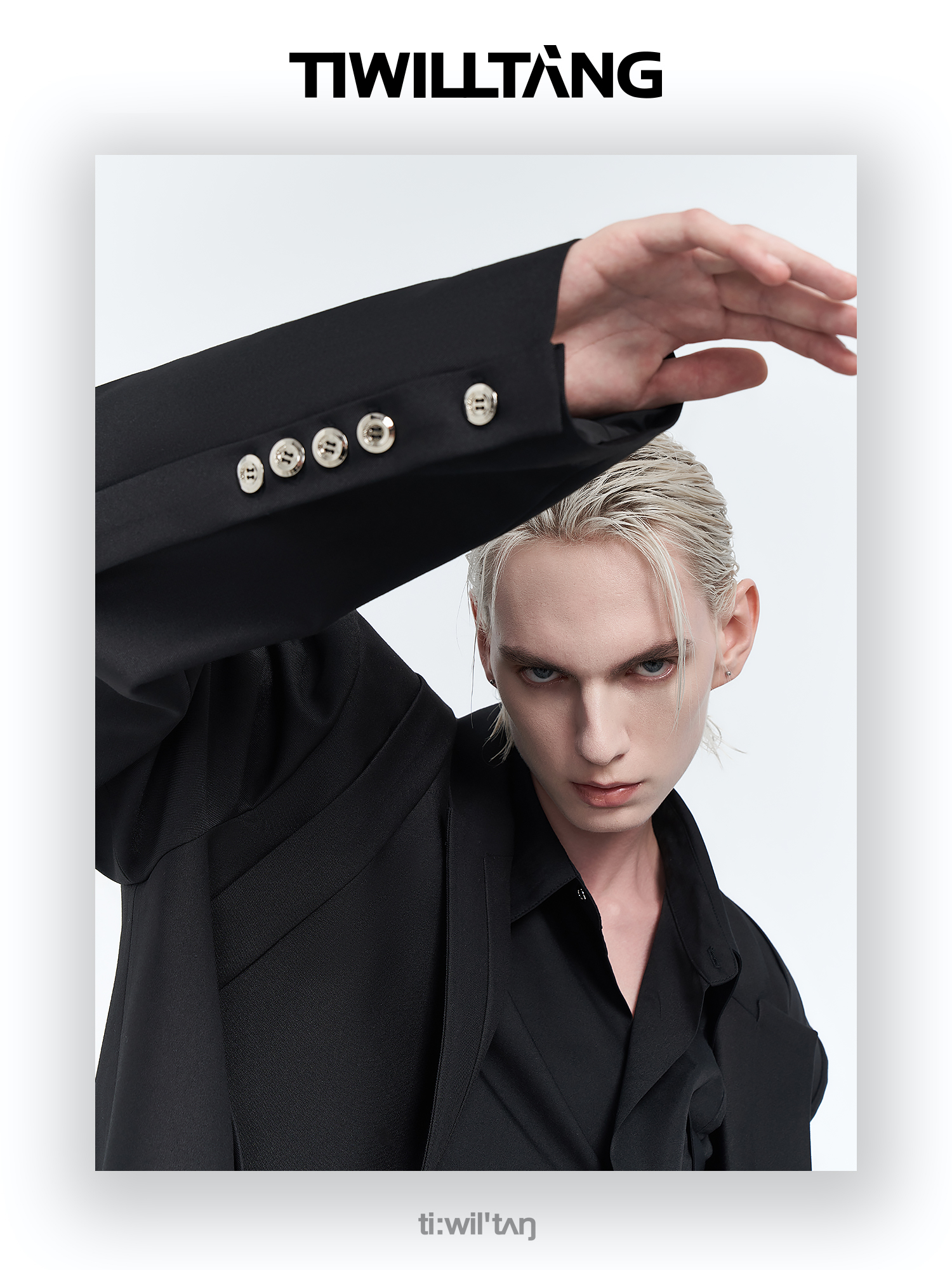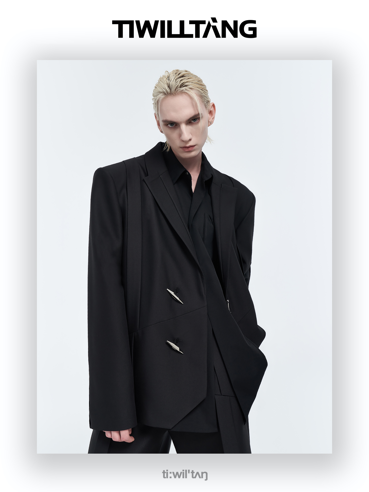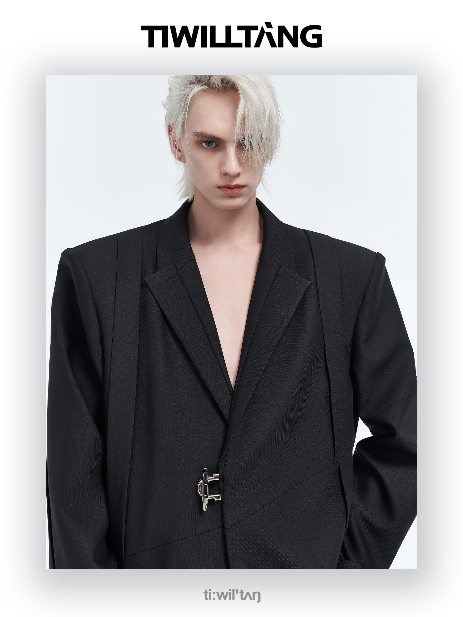 TIWILLTANG启世录“极世殿宇”高奢隽雅银灰色金属异型扣长袖西装