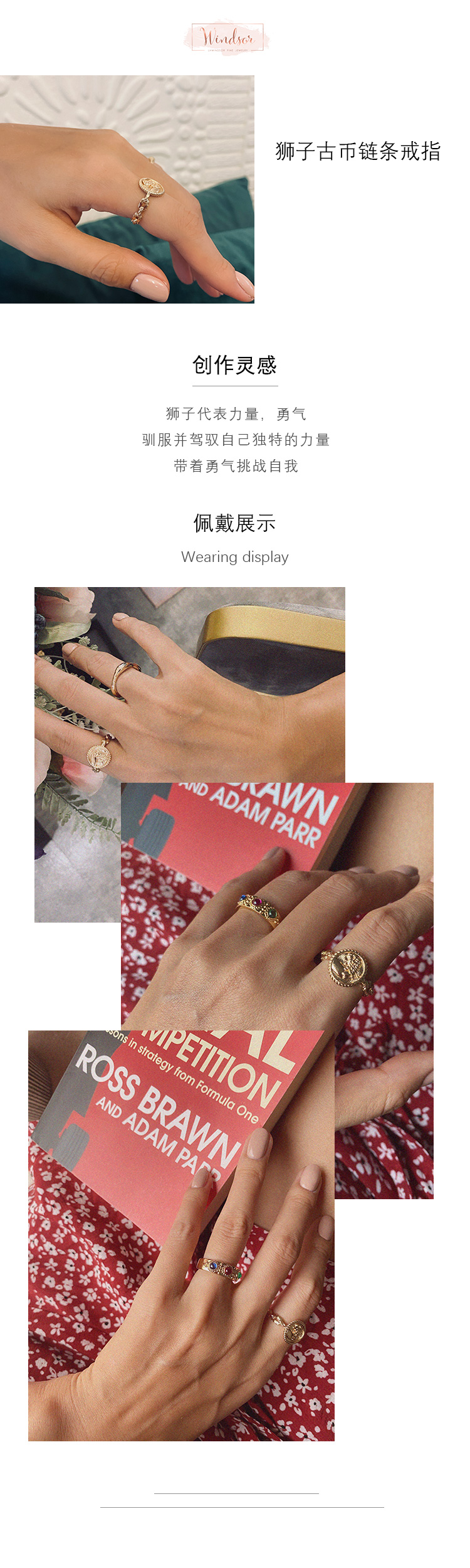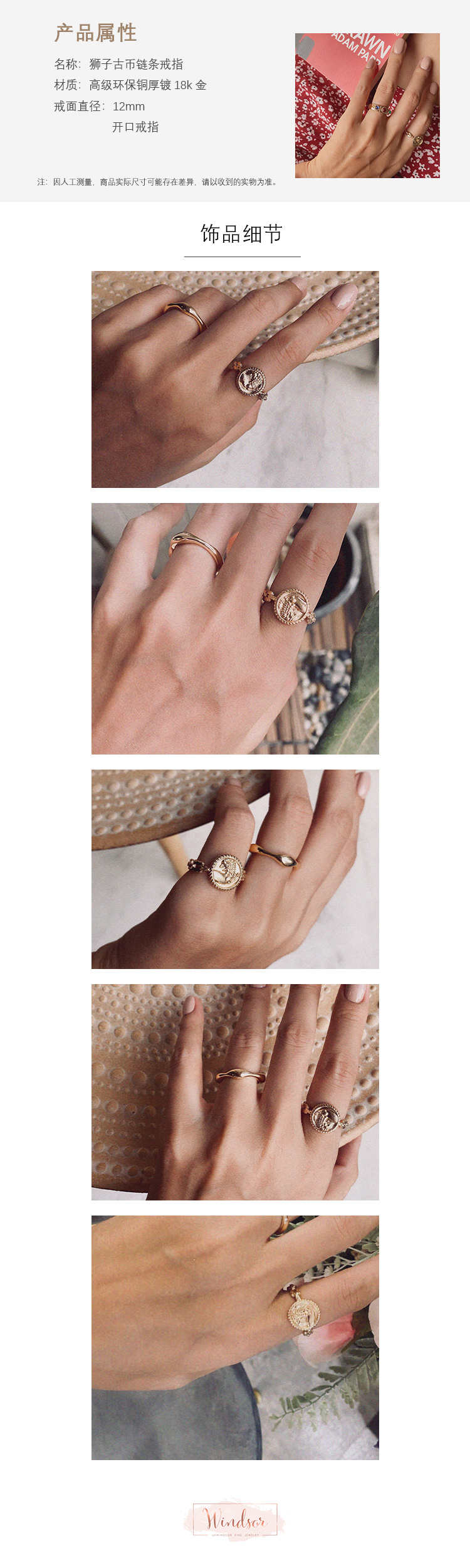 LHWINDSOR 狮子古币链条戒指复古轻奢可调节手寸指环