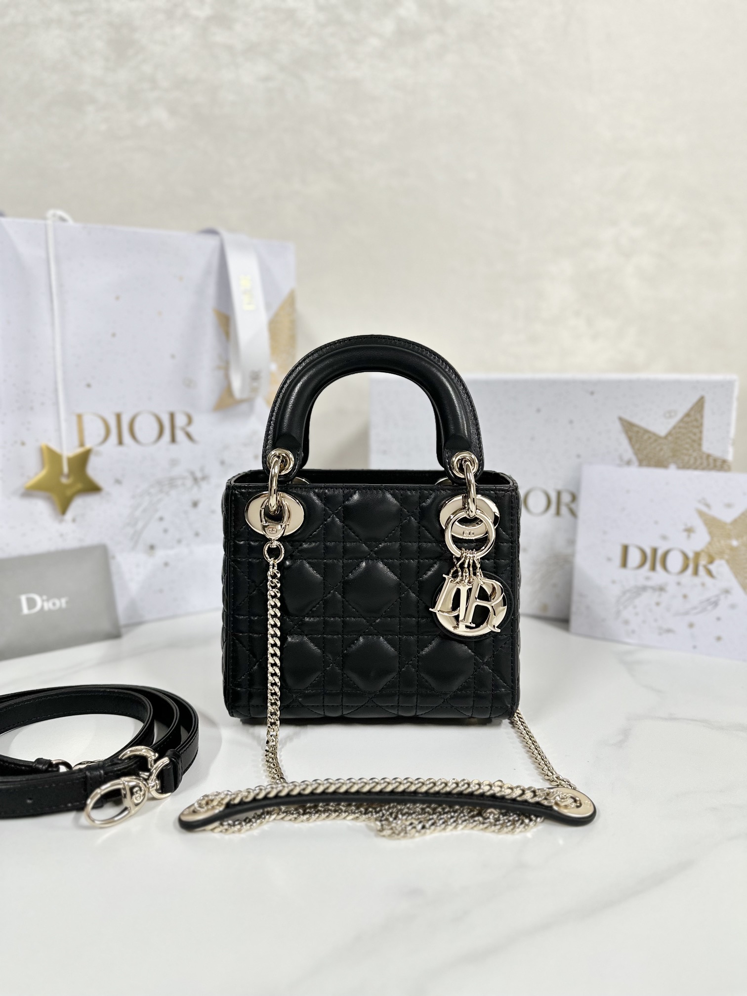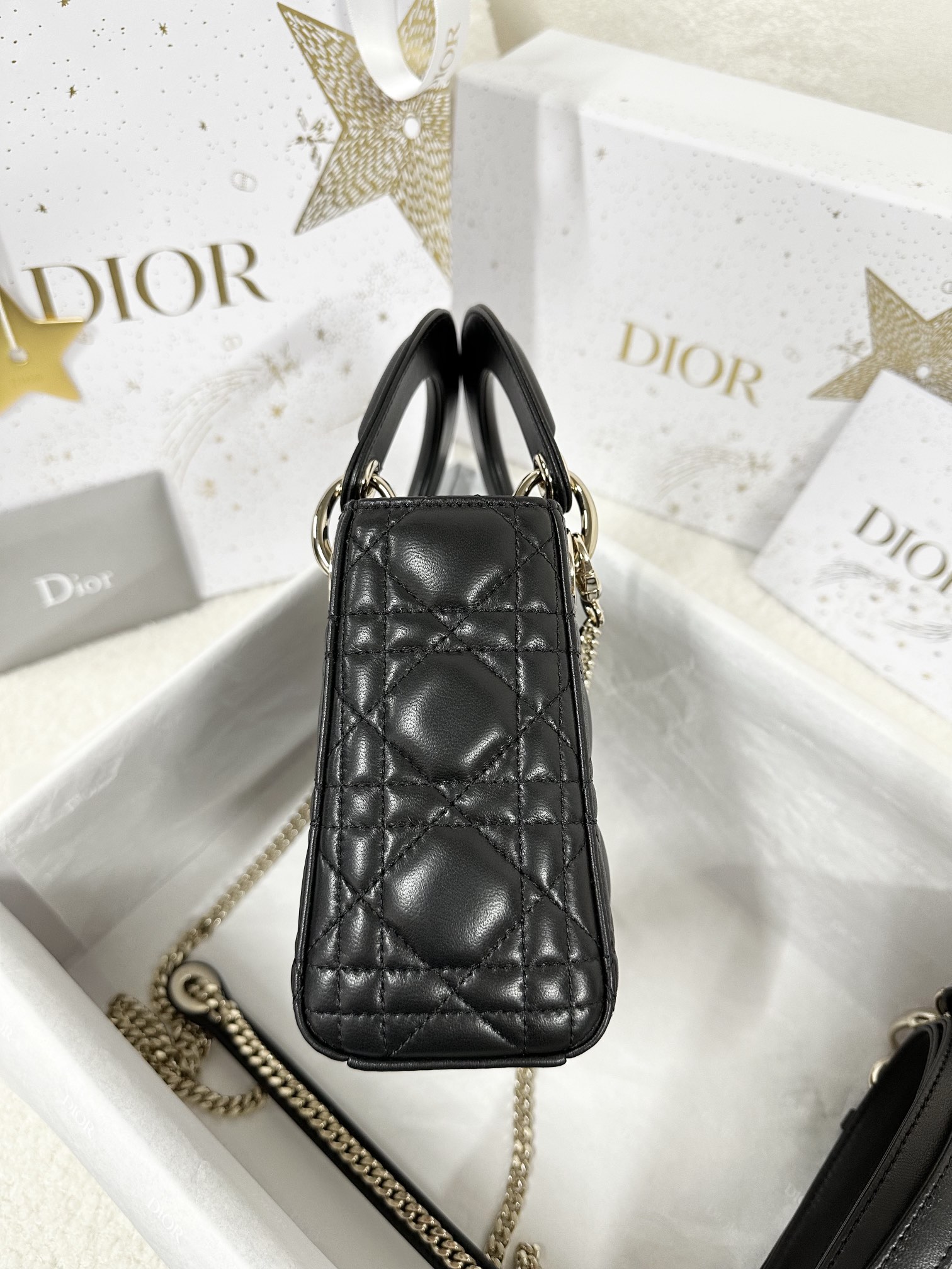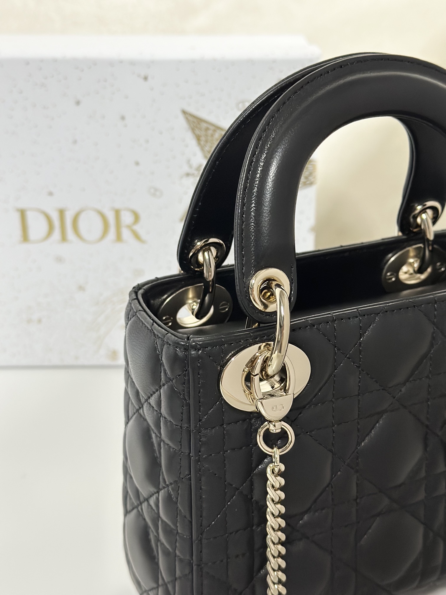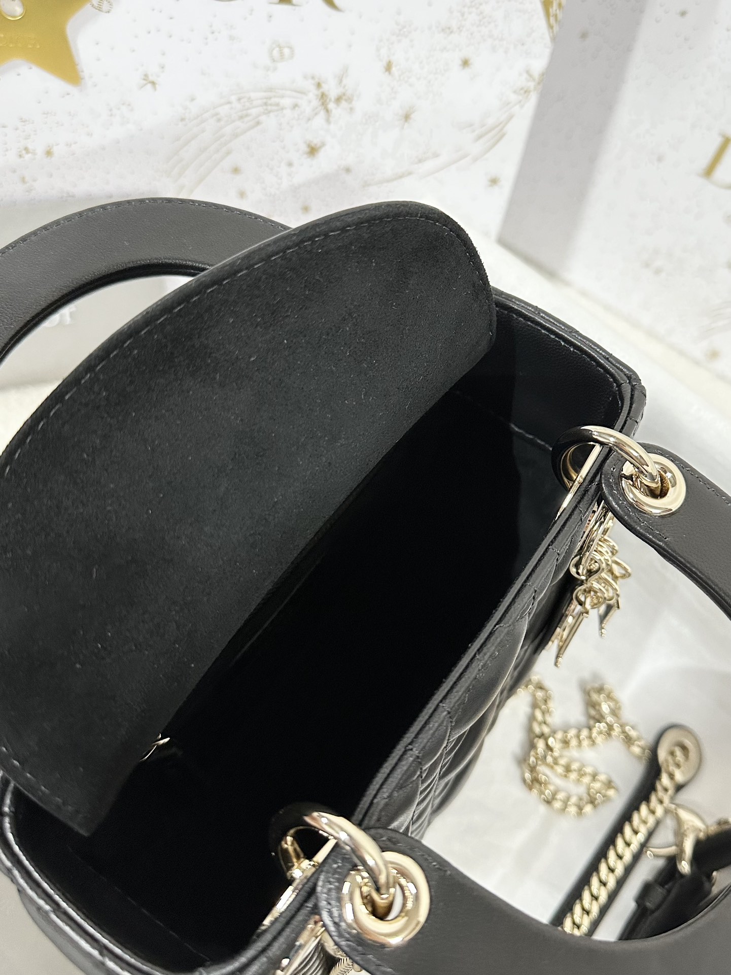 黑色羊皮金扣 Lady 戴妃包,标志性的字母吊饰,经典的菱格,手感极好的绵羊皮,人手必备的三格小包😍。迷人优雅又气场十足💃🏻,斜挎手拎也是女人味十足,经典时尚风格。ins和众多时尚icon都人手一个的美包,别错过哦❤️ size:17*7*15cm